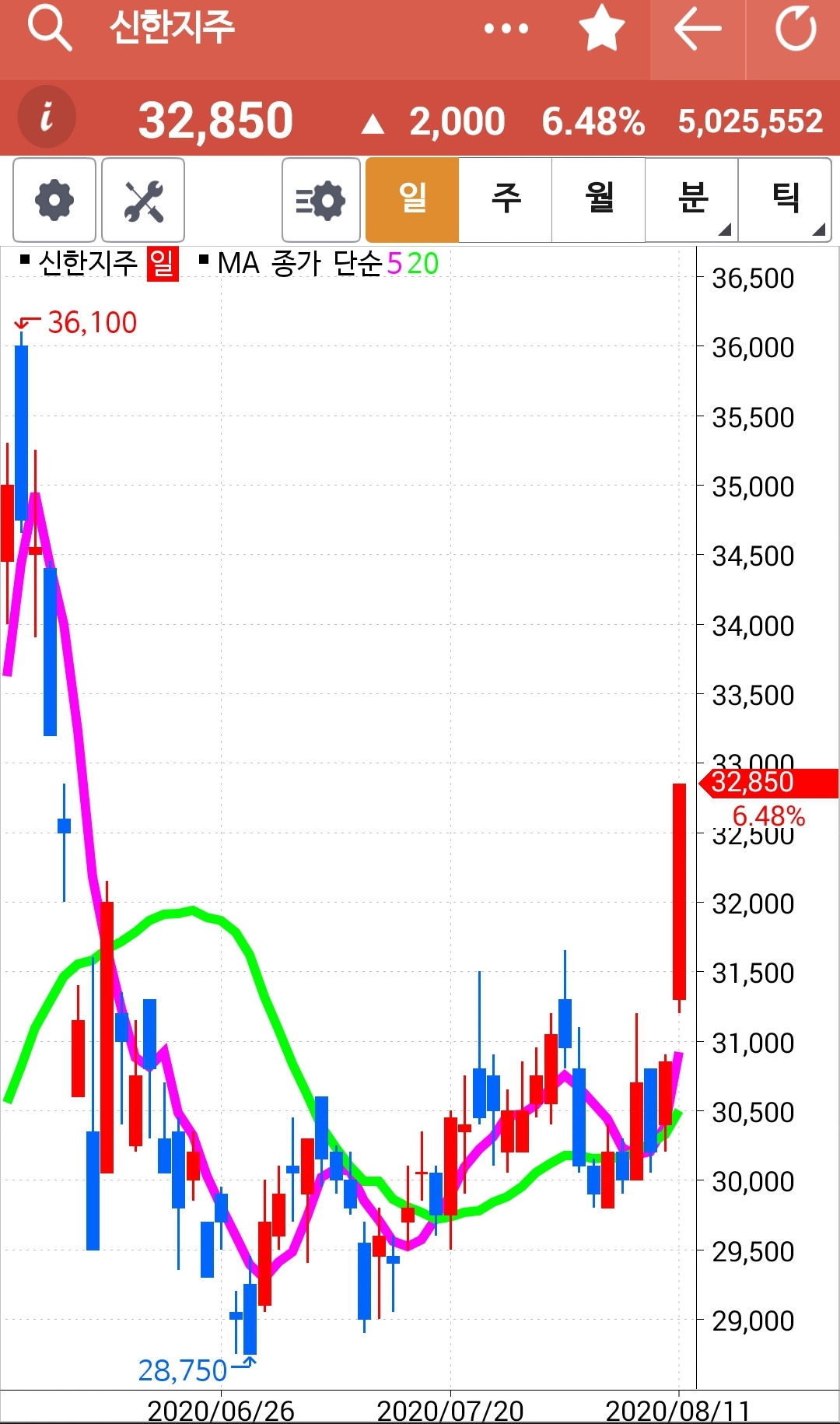 신한지주. 빵!!! 얌전하고 조금씩 오를 듯 말 듯하더니 드디어 빵! 멋진 양봉을 기록한다. 파이팅이다. 다른 건 생각하지 말자. 그냥 무조건 5일선이 20일선 위면 매수. 아래면 매도! 만 생각하기야. 그래. 난 아무것도 모르니까. 난 기계니까. 파이팅!!!