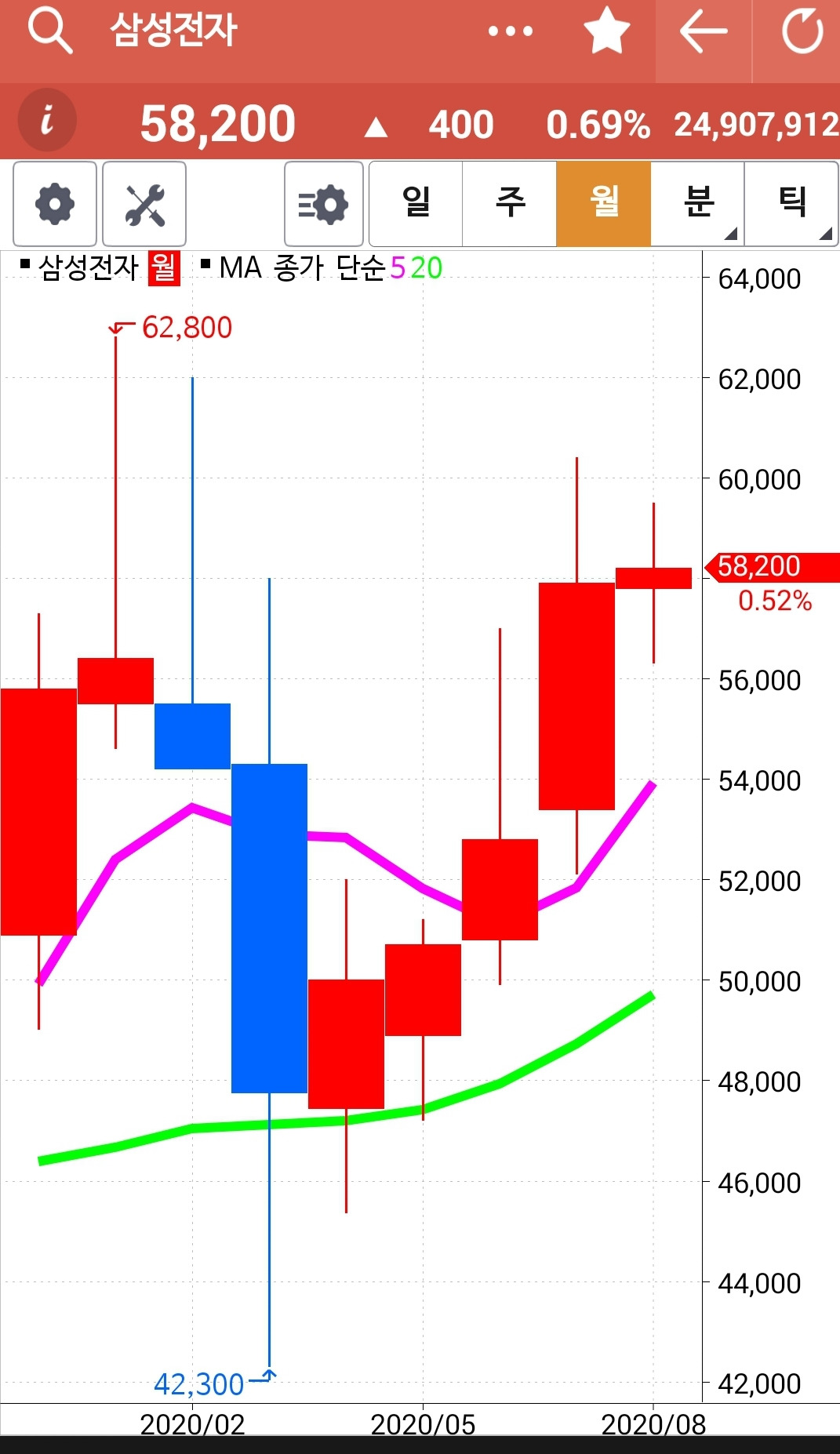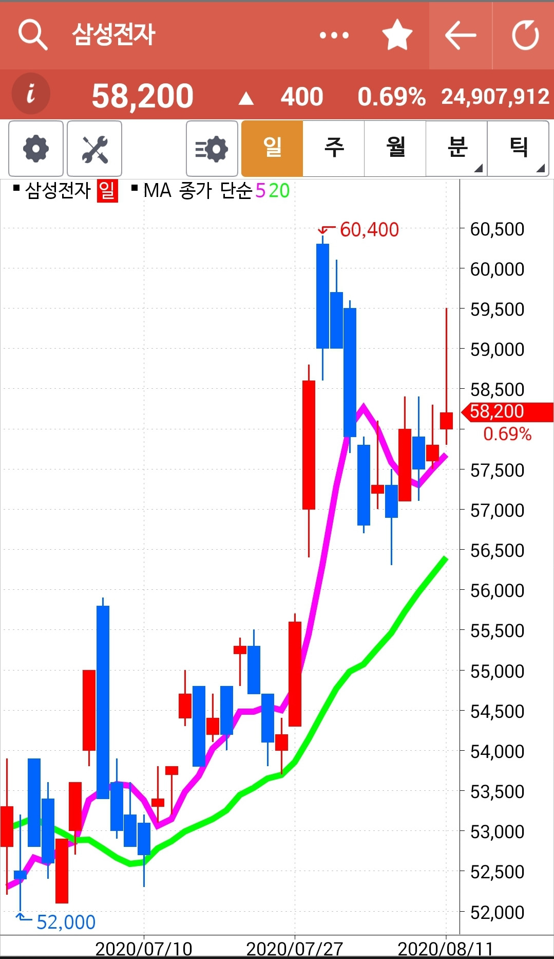 삼성전자. 긴 양봉이 나왔으면 좋았을 것을 작은 몸통을 만들며 밀렸다는 것이 좀 아쉽다. 그래도 아직 5일선이 위고 주봉 월봉 모두 붉은 선이 위에 있으니 걱정하지 말기로 하자. 언제라도 5일선이 20일선 뚫고 내려가면 방 뺄 준비는 하고 있으니까. 파이팅!!!