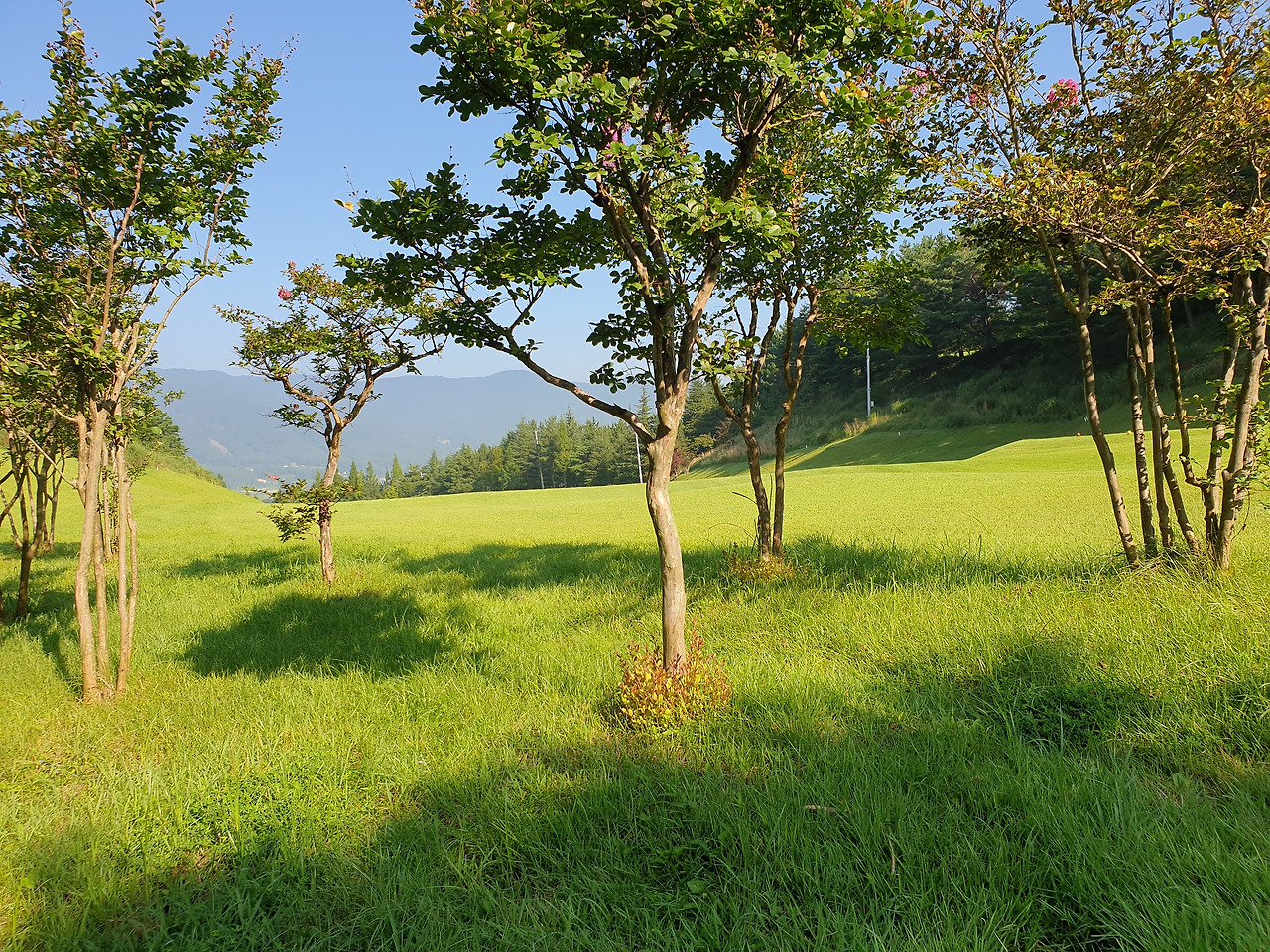 땀을 뻘뻘 흘리며 열기 속에 공을 쳐나간다. 찜질방 들어왔다 치지 뭐. 그러나 나무 그늘 아래만 가면 언제 그랬냐는 듯 아주 시원하다. 거기 바람까지 불면 그땐 행복 그 자체다. 사람 마음 간사하기가 이를 데 없다. 행복과 불행이 해님과 그늘 따라 몇 번이고 왔다 갔다 한다. 헉헉. 그러나 몸은 휙휙 잘도 돌아간다. 파란 잔디는 아주 곱게 깔려 있다. 휙휙 신나게 휙휙.