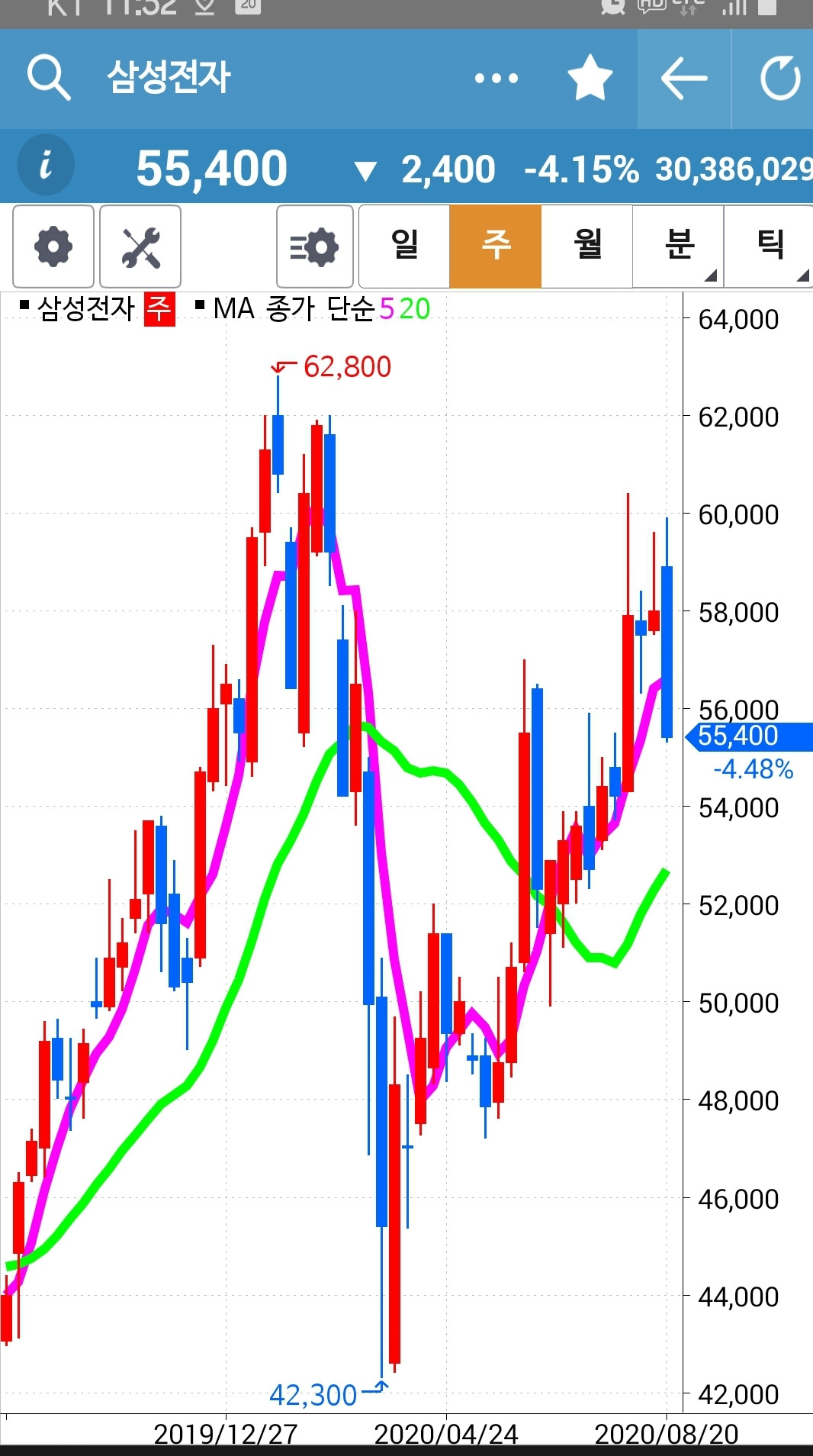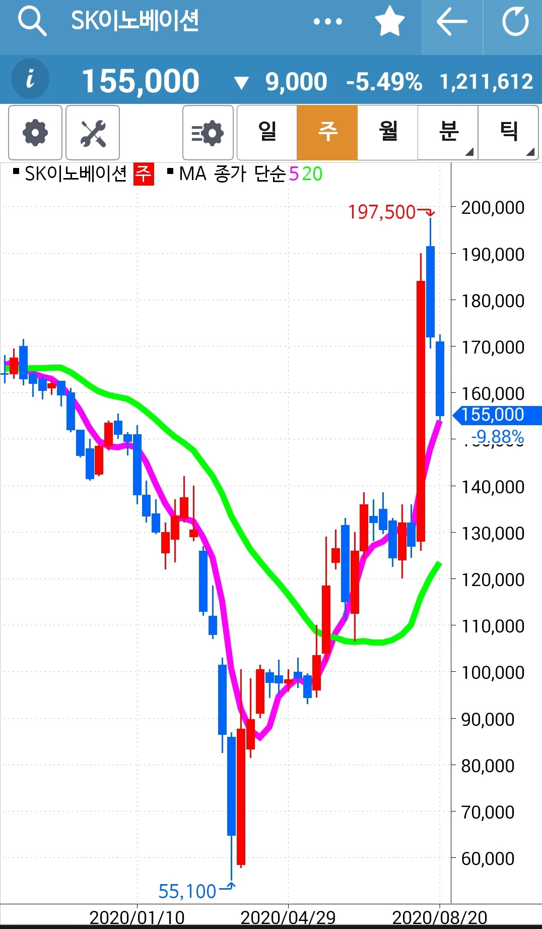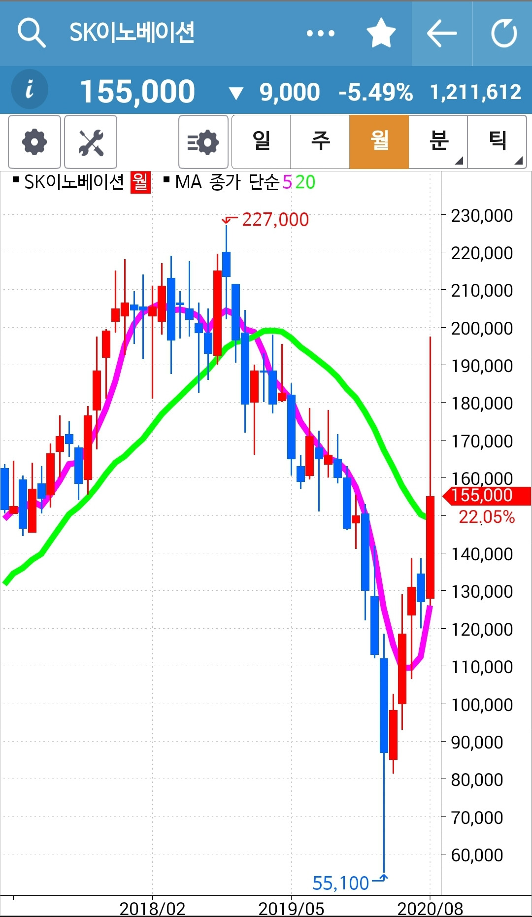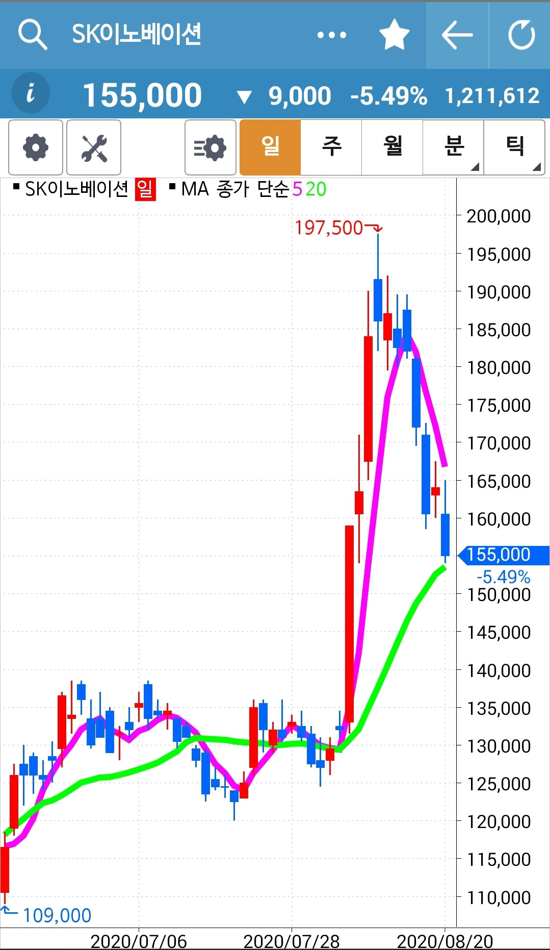 SK이노베이션. 빠방 빵 정신없이 올라가던 수익을 파파팍 그야말로 고대로 되갚아 주고 있다. 어쩜 이렇게 음봉의 연속이란 말인가. 결국 20일선까지 주가는 내려오고 말았으니 여기서 돌리지 못하면 5일선 조차 20일선 아래로 내려갈 텐데. 그러면 나에게서 잘리게 되니 어서 이쯤에서 빠방 빵 다시 차고 올라가렴. 파이팅!!!
