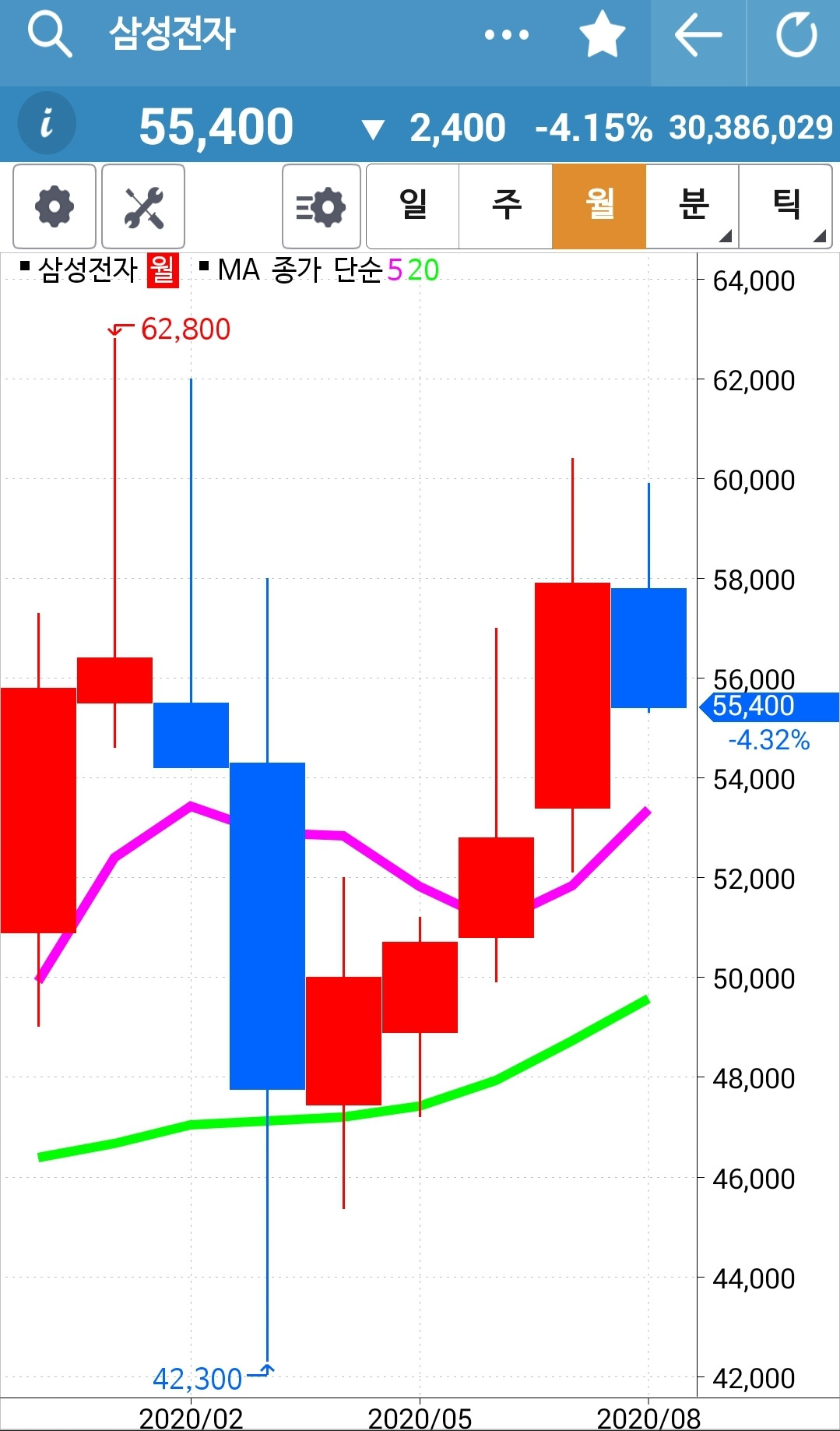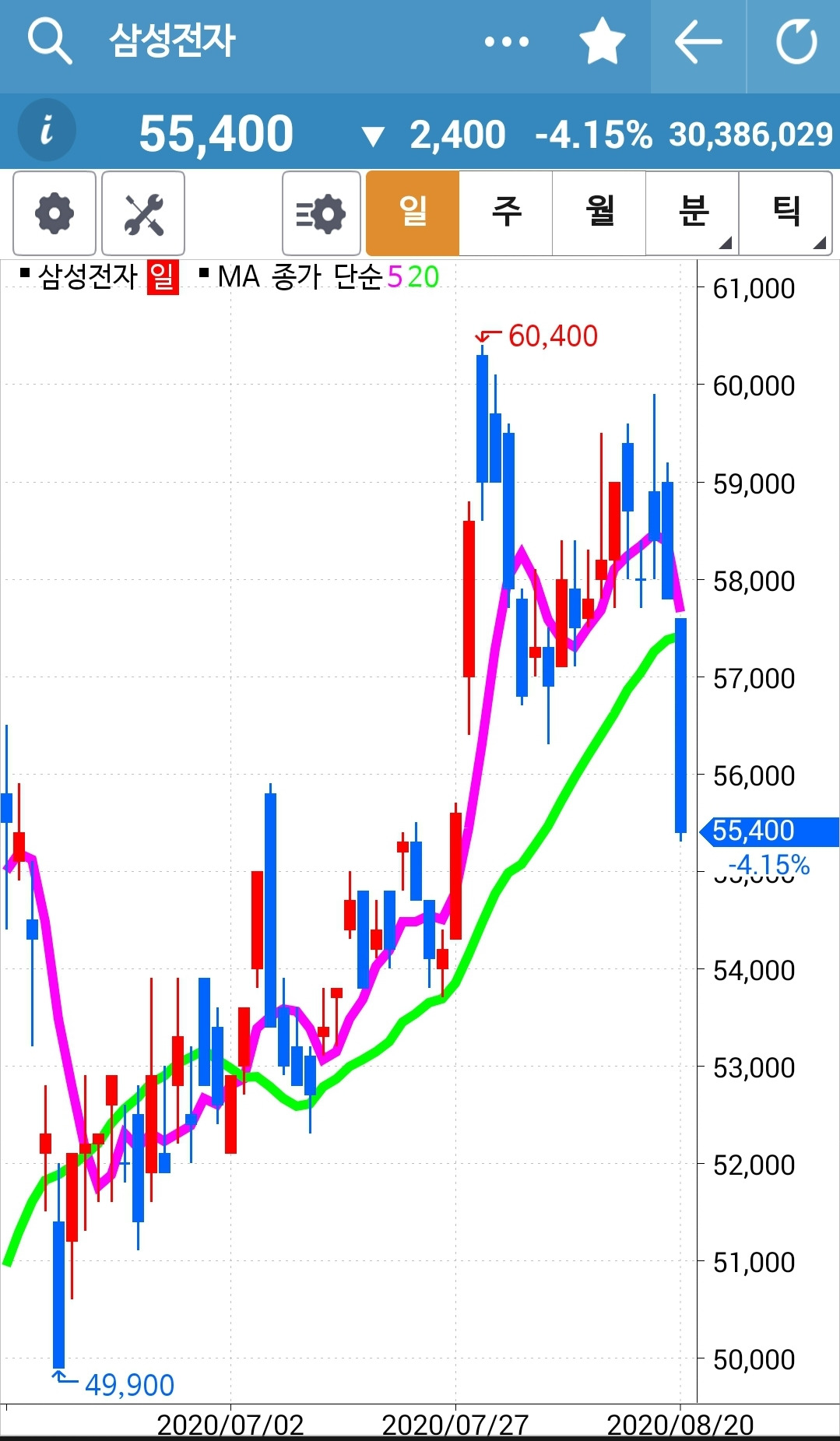 삼성전자. 헉. 어쩜 이렇게 왕창 내려갈 수가? 푹 푹푹 떨어졌다. 그야말로 긴 음봉. 조만간 5일선은 20일선 밑으로 내려가지 않을까? 그땐 얄짤없다. 탈락이다. 그래도 그렇지. 하이고 너무도 긴 음봉. 수익을 몽땅 반납하고 있다. 엉엉.