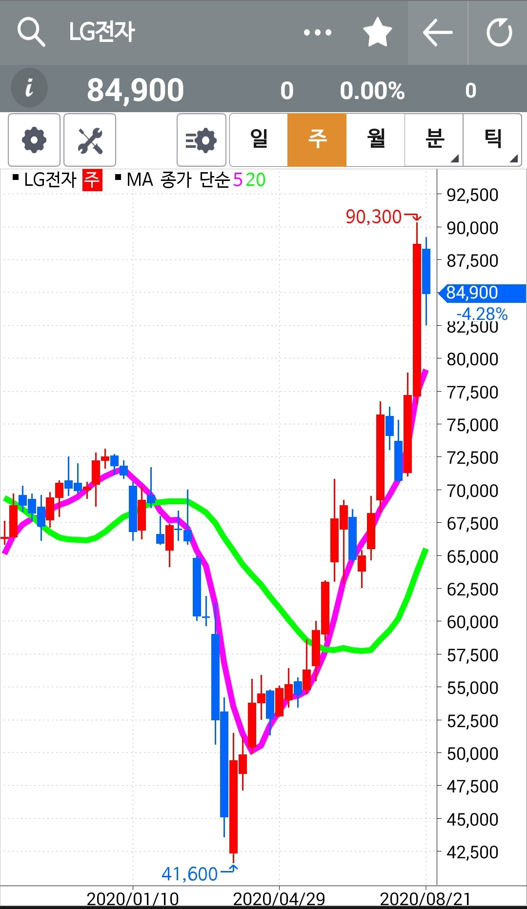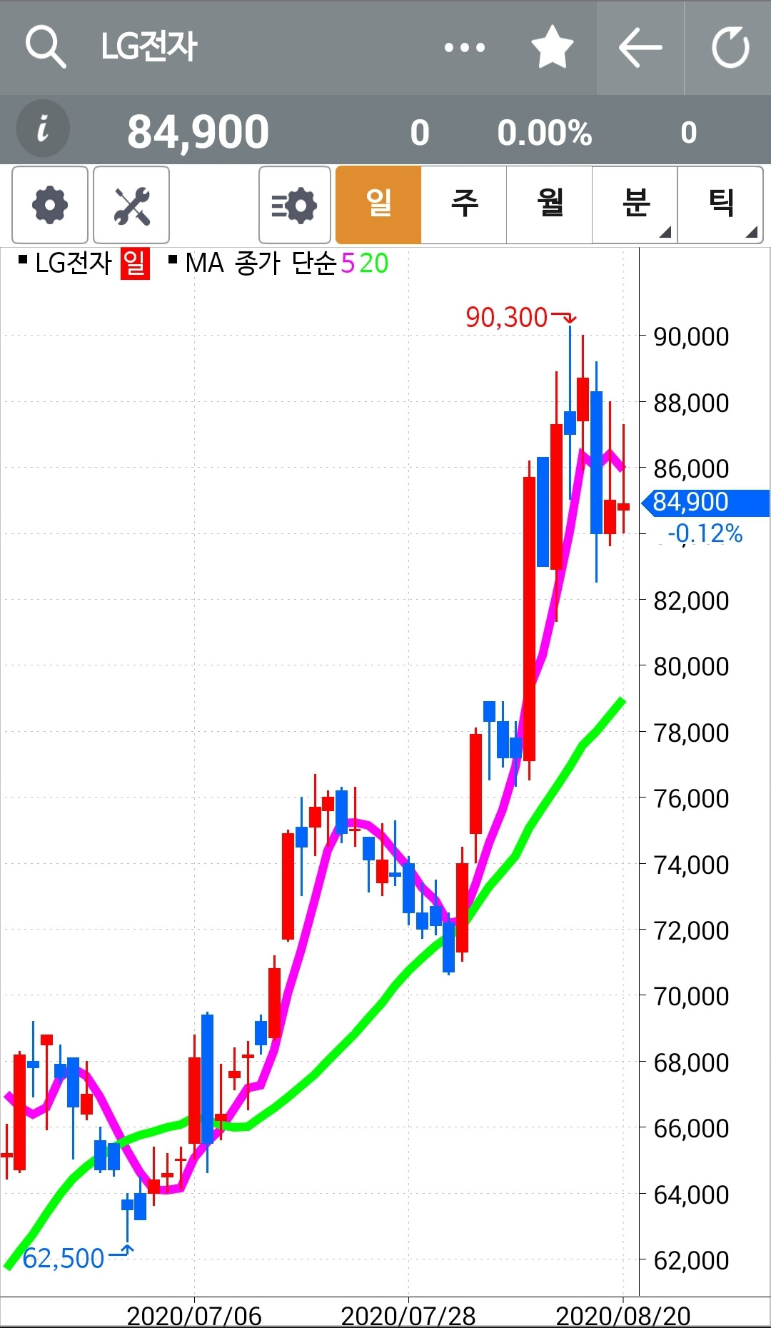 LG전자. 지수선물이 12포인트 넘게 빠지는 상황에서 선방하고 있다. 양봉을 유지했으며 저점도 낮추지 않았다. 파이팅!!!