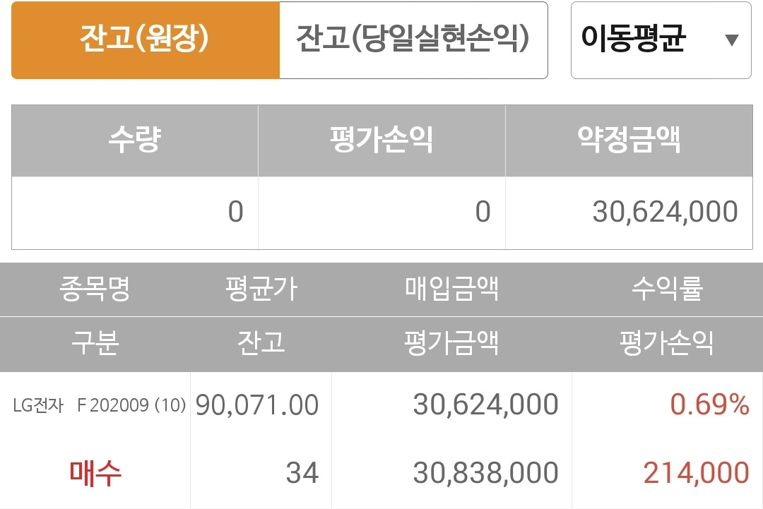 사진 2. 선물 주식. 백삼십여만 원의 수익 난 것 까지 탈탈 털어 덜컥 LG전자를 사놓고 오달 달달 떨고 있다. 가까스로 오늘도 수익을 주었다. 흐유~ 안심을 했지만 그렇게 떨지 않기로 마음을 다잡는다. 그럼. 난 잘못한 게 없는 걸. 5일선이 위에 있어서 샀는데 뭐!!! 히히