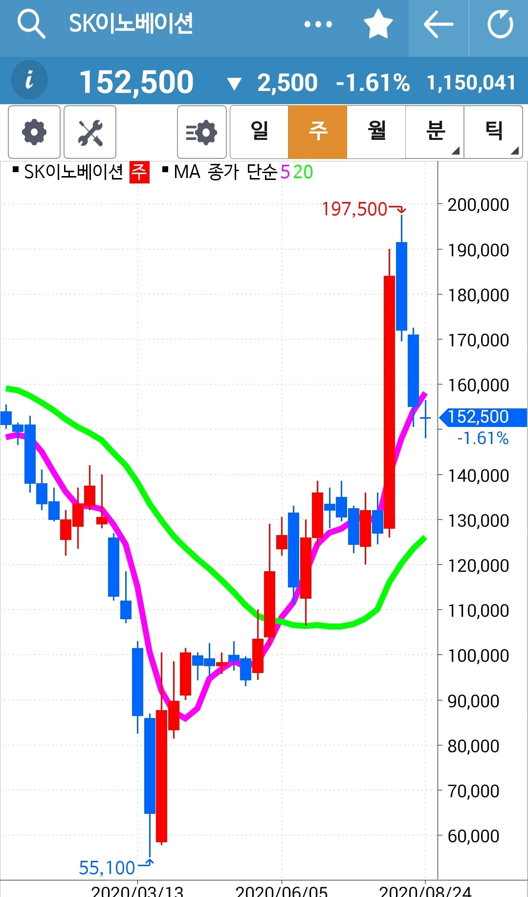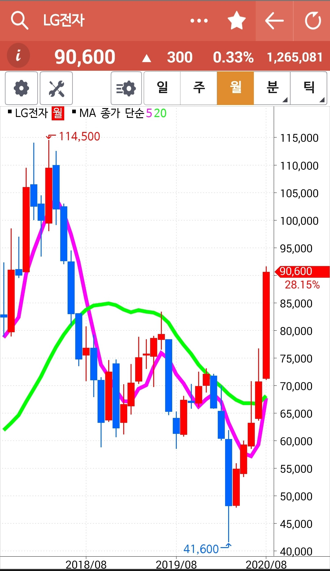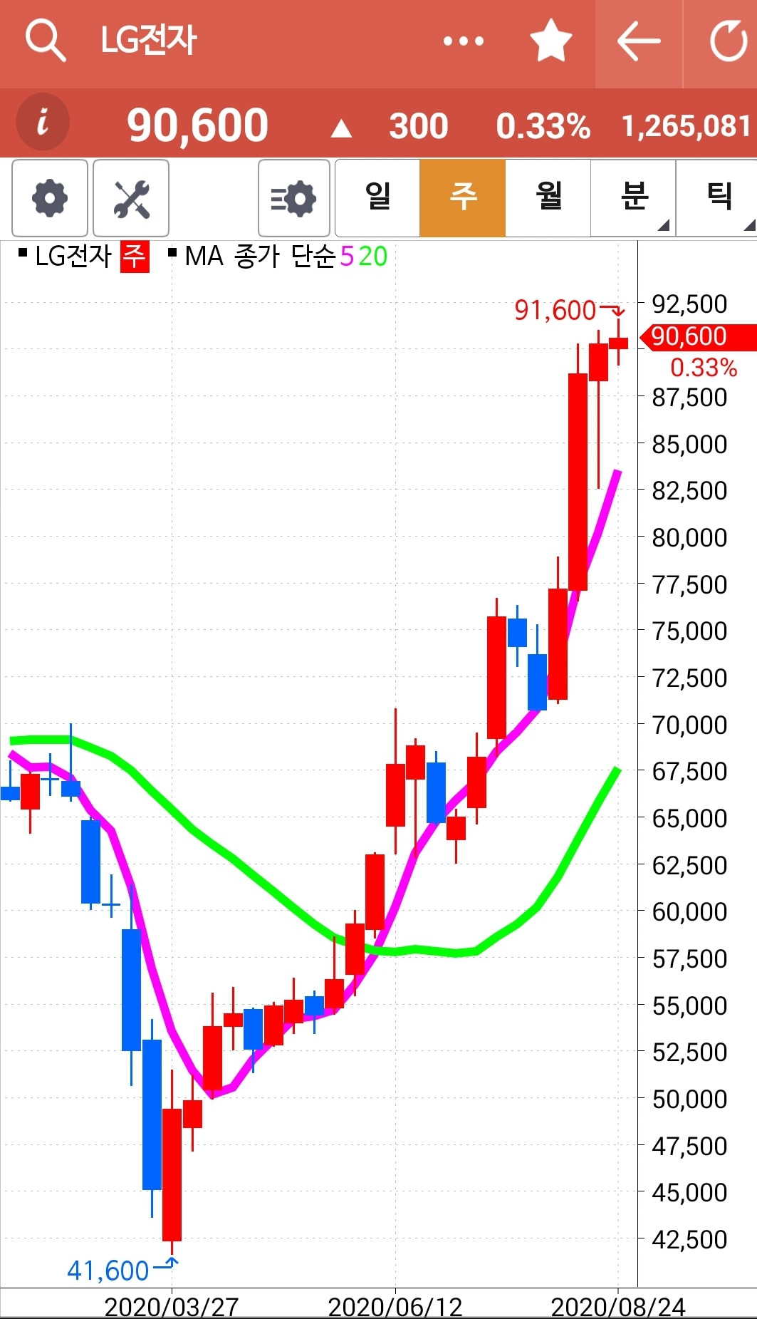 나의 사랑 LG 전자. 일봉 주봉 월봉 모두 모두 멋지게 올라가고 있다. 무리해서 올라가니 조정이 있을 수도 있겠으나 그래도 전 파동의 고점을 뚫었으니 그 파동의 깊이만큼은 올라가 줄 것을 희망해보자. 그렇게 대충 6,000원 정도 올라갔을 때 그때는 한 번 정리 여부를 생각해보자. 파이팅!!!