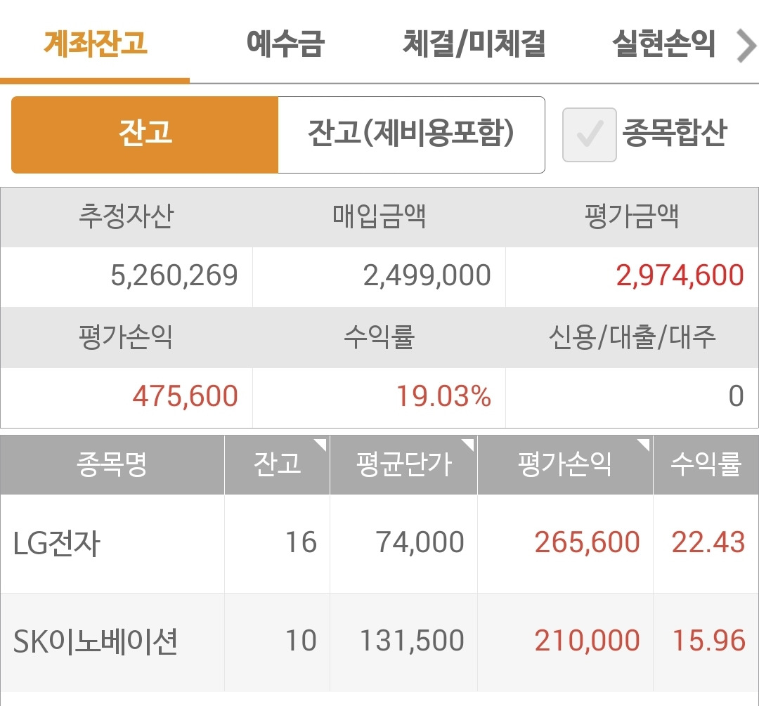 사진 1. 현물 주식. 모두 탈락하고 달랑 두 개 남았다. 현금도 남아있어 주식을 사 넣을 수 있으나 오늘 짬이 안 나 그럴 수 없었다. 현금도 주식이니까 무어 그렇게 사넣으려 너무 애쓰지 말자. 느긋하게. 오케이.