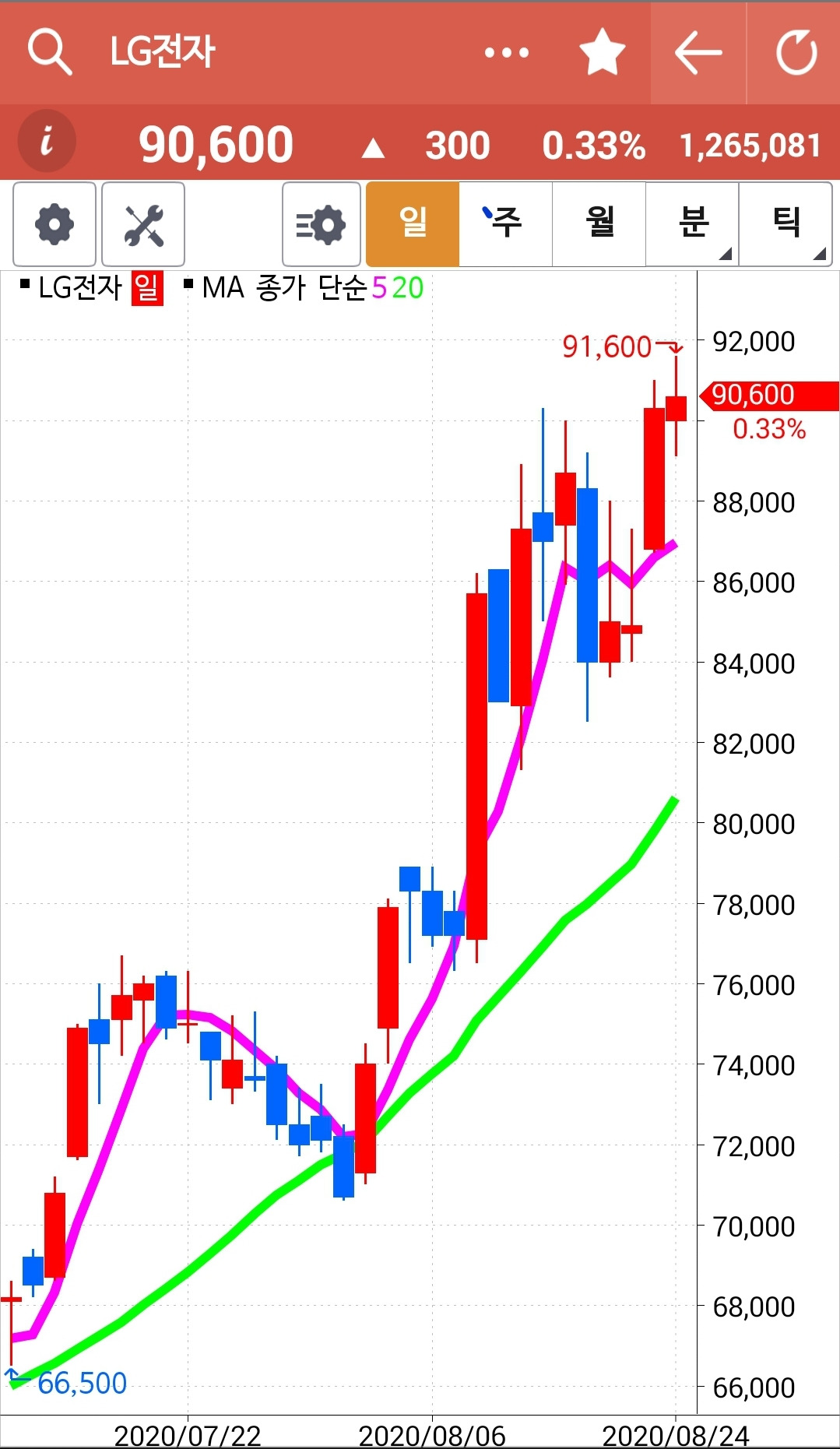 LG전자를 사고 친 것 같아 언제나 부들부들. 하하 그런데 오늘도 수익을 주었다. 고맙다. 이젠 그렇게 떨지 않으리라. 5일선이 위에 있어서 산 거니까. 그래. 5일선이 20일선 아래로 뚫고 내려갈 때 그때 매도하면 되는 거야. 이익을 얼마에 챙길까 그런 거 생각하지 말자. 단순하게. 오케이!!!