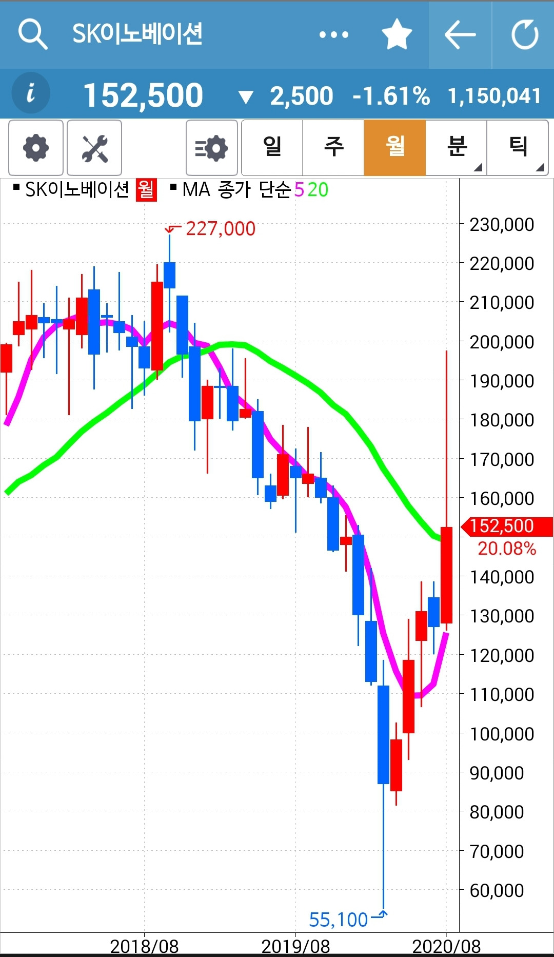 SK이노베이션. 하염없이 내려와 드디어 주가가 20일선 아래로 내려갔다. 그러나 5일선은 아직 20일선 위에 있다. 내일 빵!!! 오르지 않으면 탈락할 것이다. 내일 두 눈 부릅뜨고 지켜봐야 한다. 파이팅!!!