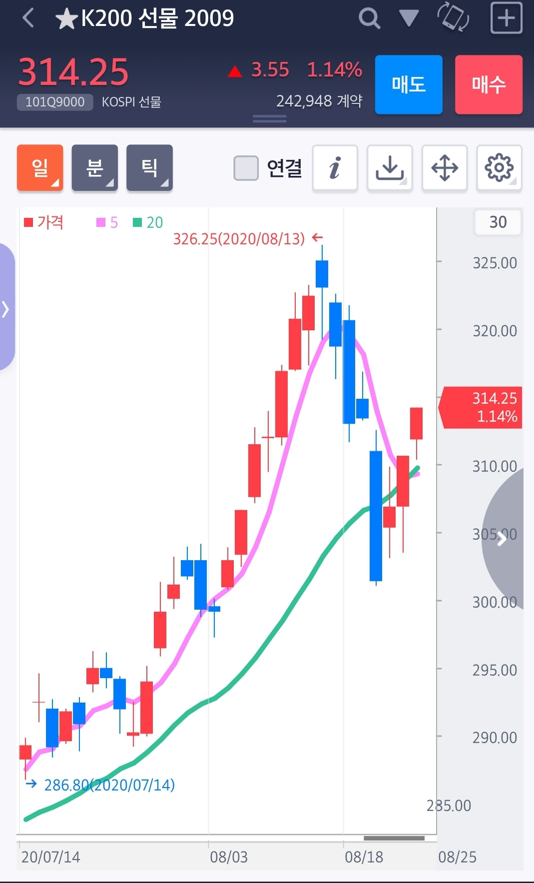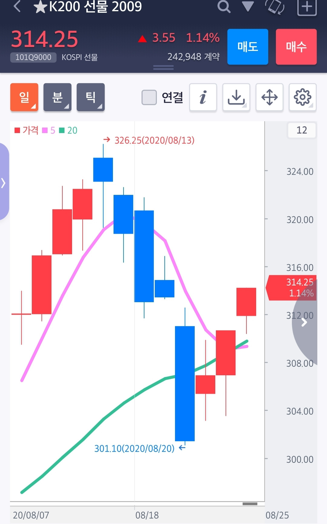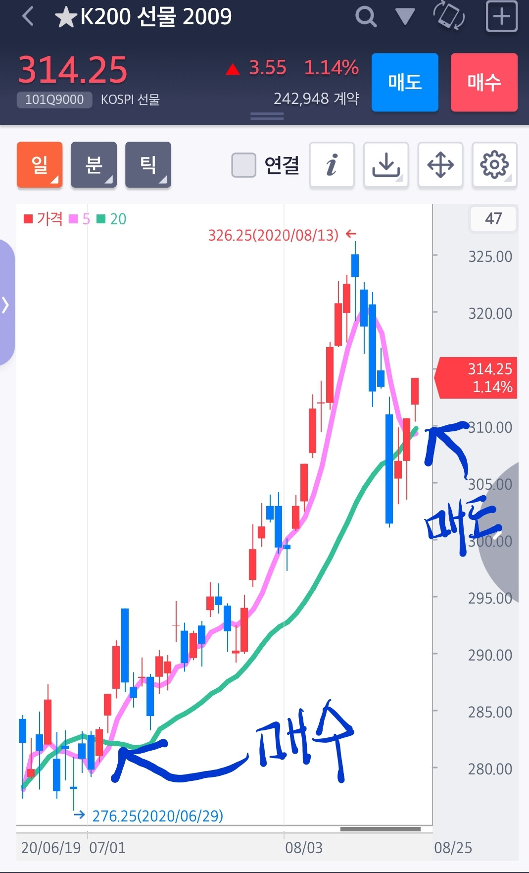 오늘 8월 25일 화요일 꿋꿋하게 20일선 위를 지키던 선물 지수 5일선이 아슬아슬하게 아래로 내려왔다. 그걸 간과할 내가 아니다. 흠. 내 눈이 얼마나 매서운데 찌릿! 히히. 어쨌든 그리하여 나는 매도했다. 그러나 아주 살짝 내려왔을 뿐이고 또 막 올라가는 중의 차트라 매수 청산만 했다. 신규 매도는 하지 않았다는 말이다. 와이? 막 올라가는 중인데 매도가 내키지 않기때문이다. 그렇다고 원칙을 어긴 건 아니다. 진입을 안했을 뿐이지 원칙에 어긋나게 매매한 게 아니니까. 수익을 내고 좀 쉬어주는 것도 괜찮아. 내키지 않으면 안 하면 돼. 안 하는 거가 원칙 위배는 아니다. 현금도 투자의 하나이고 잘 모르면 하지 않는 것도 큰 전략 중의 하나니까. 자꾸 매수만이 끌린다면 다시 5일선이 20일선 위로 올라올 때 매수하면 된다. 오케이. 자, 그럼 내가 오늘 청산한 매수분은 언제 매매한 것일까? 매수하면서 올린 글을 낑낑 가져다 놓는다.