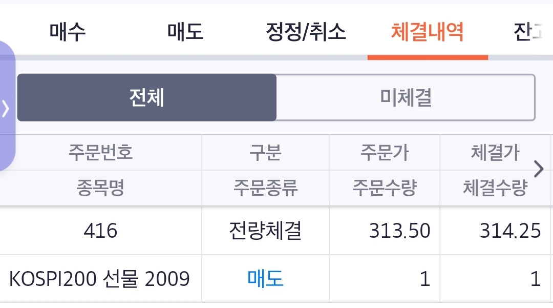 사진 1. 주문 가는 313.50이다. 혹시나 체결 안될 까 봐 아주 낮은 가격에 전매를 내놓았다. 그리고 314.25에 체결. 음하하하 감정 배제. 난 원칙 따라 매매하는 기계일 뿐. 난 아무것도 몰라요 5일선이 20일선 아래로 내려가면 매도할 뿐야요~