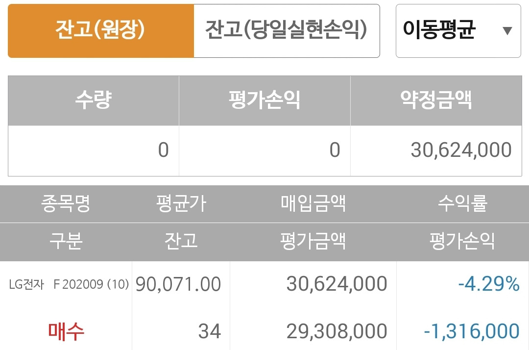 사진 2. 선물 주식의 손실 현장. 130여만 원의 수익을 주었듯이 순식간에 비슷한 금액의 손실이다. 물론 총액 투자상에서는 똔똔이겠지만 그래도 벌은 걸 다 잃게 생겼다. 에구.