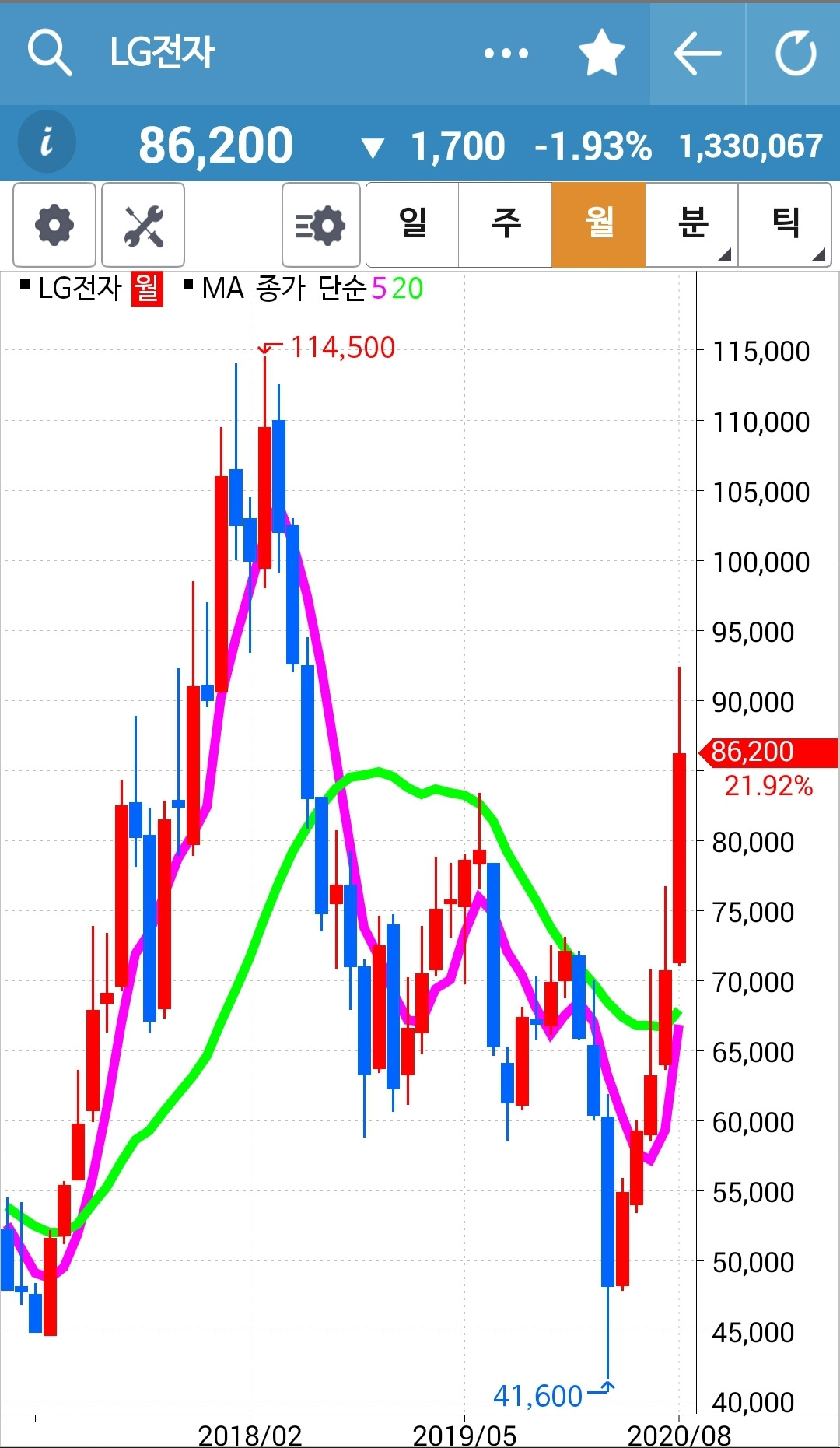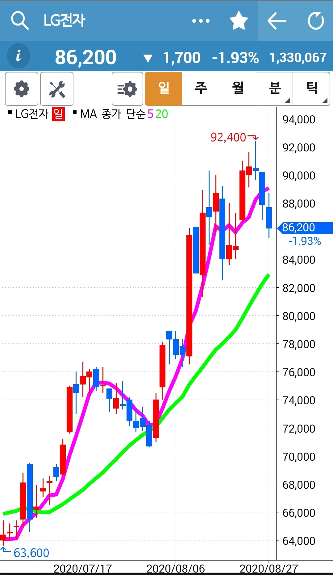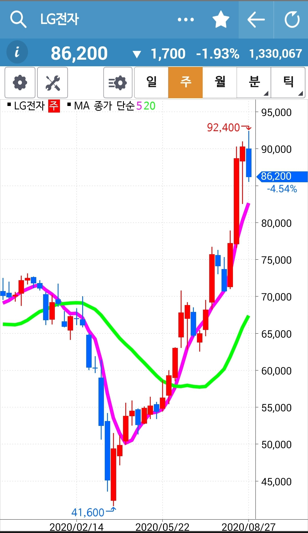 나에겐 꼴랑 LG전자 하나 남았는데 오늘 또 하락했다. 무려 1,700 원이나. 그러나 내가 할 수 있는 일은 아무것도 없다. 5일선이 20일선 위에 있으니까.