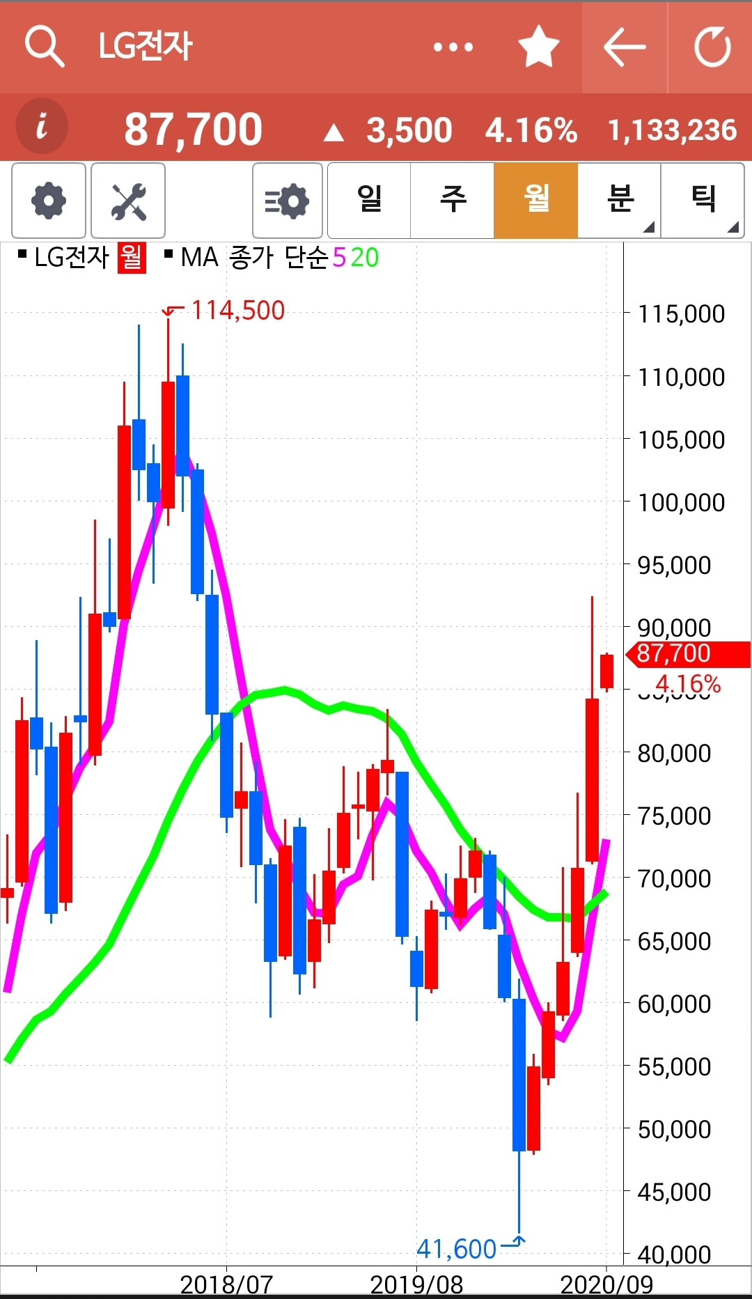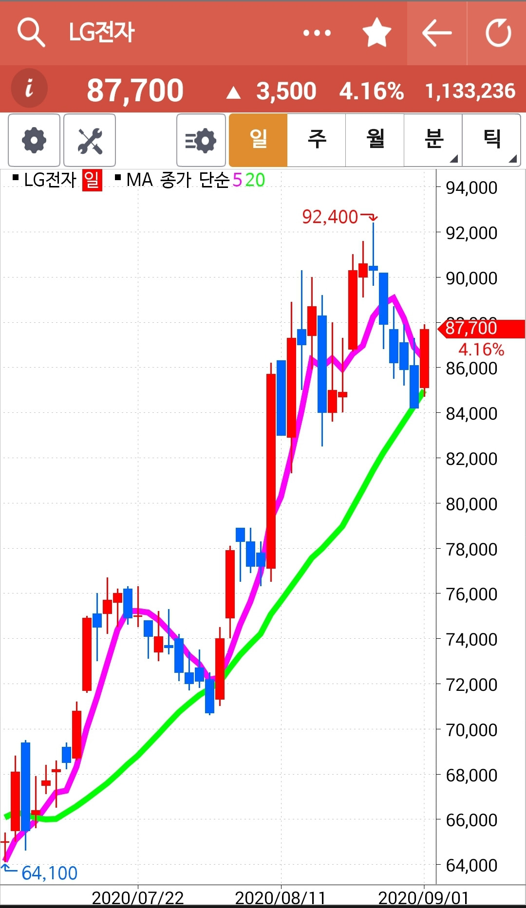 LG전자. 오홋. 예쁘게 긴 양봉이 꼭 알맞은 때에 나타났다. 5개의 음봉 후 20일선을 딱 부딪고 올라가는 모습이라니. 그렇지. 그냥 올라가려면 길게 못가. 이렇게 굴곡을 주면서 가야지. 오홋. 쭉쭉 위로 올라가세요~ 파이팅!