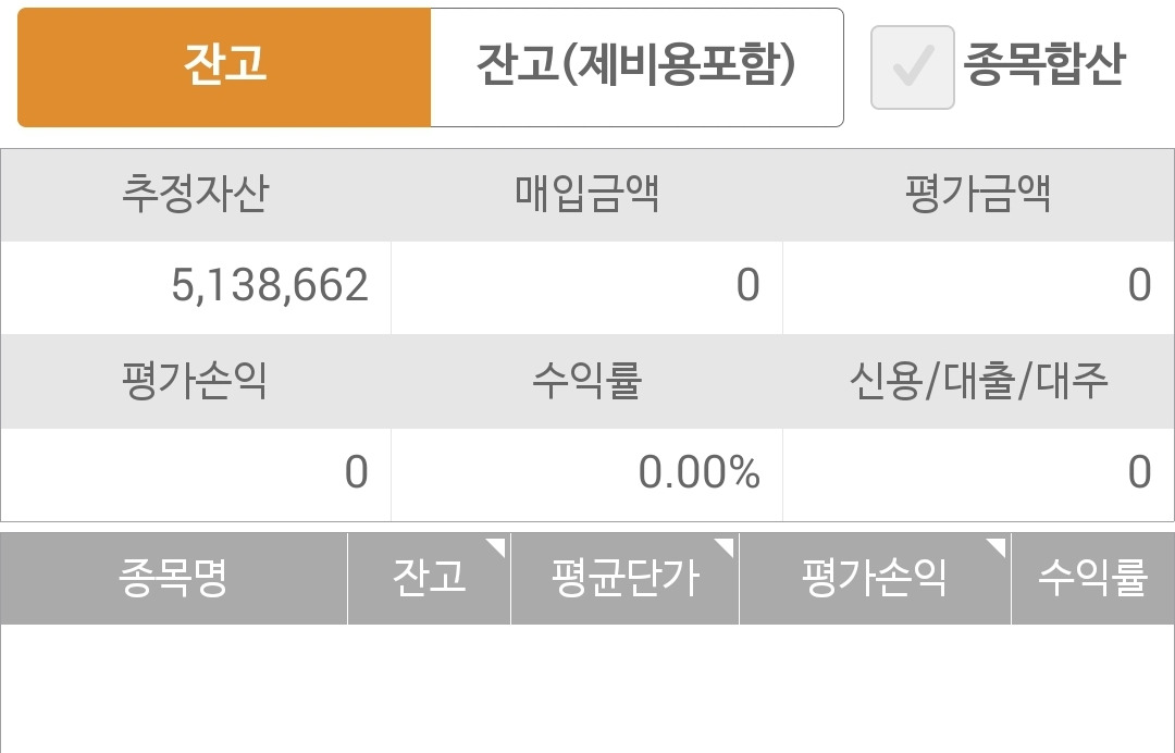 사진 2. 현물 주식 잔고. 주식은 하나도 없고 현금 513만 원이 있을 뿐이다. 수익이 다 날아가고 13만 원이라니. 너무했다. 그래도 할 수 없다. 난 아무것도 몰라요. 5일선이 20일선 아래로 가면 매도할 뿐야요. 하하 그래 잘하고 있는 거야. 어찌 될지 몰라. 이게 다시 위로 올라올 때 매수하리라.