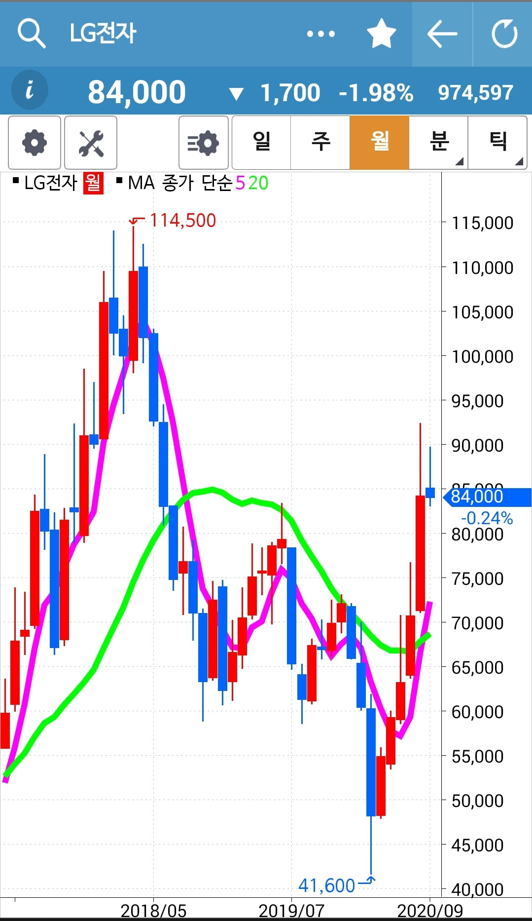 사랑으로 보듬어왔던 LG전자가 배신을 때렸다. 하하 그렇게 표현할 수밖에 없다. 5일선이 20일선을 뚫고 내려간 것이다. 어쩌나. 계속 내려왔으니 조금 기다리면 올라갈 텐데. 여기서 꼭 나와야 할까? 장기투자라면 여기서 나올 필요 없잖아? 왔다 갔다 하지 말고 그냥 눈감고 장기투자. 그러면 되지 않을까? 올라가긴 올라갈 텐데 나오자고? 그냥 며칠 기다리면 안 될까? 주봉 월봉 모두 위로 올라가고 있는데 이렇게 잦은 매매 안 좋잖아? 탈락을 시키려니 사방에서 들려오는 유혹의 소리. 노노노! 딱 잘라버리고 탈락!!! 잘했어. 파이팅!!! 난 아무것도 몰라요. 5일선이 20일선 아래로 가면 매도할 뿐야요~ 엉엉.
