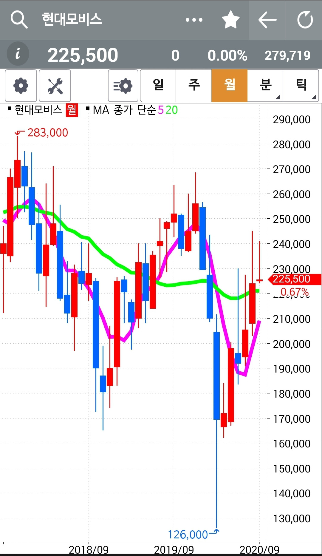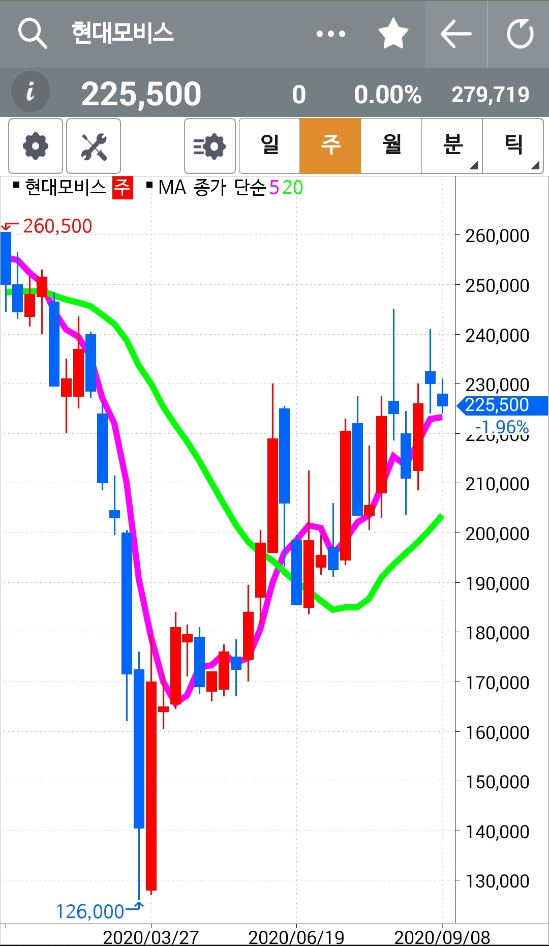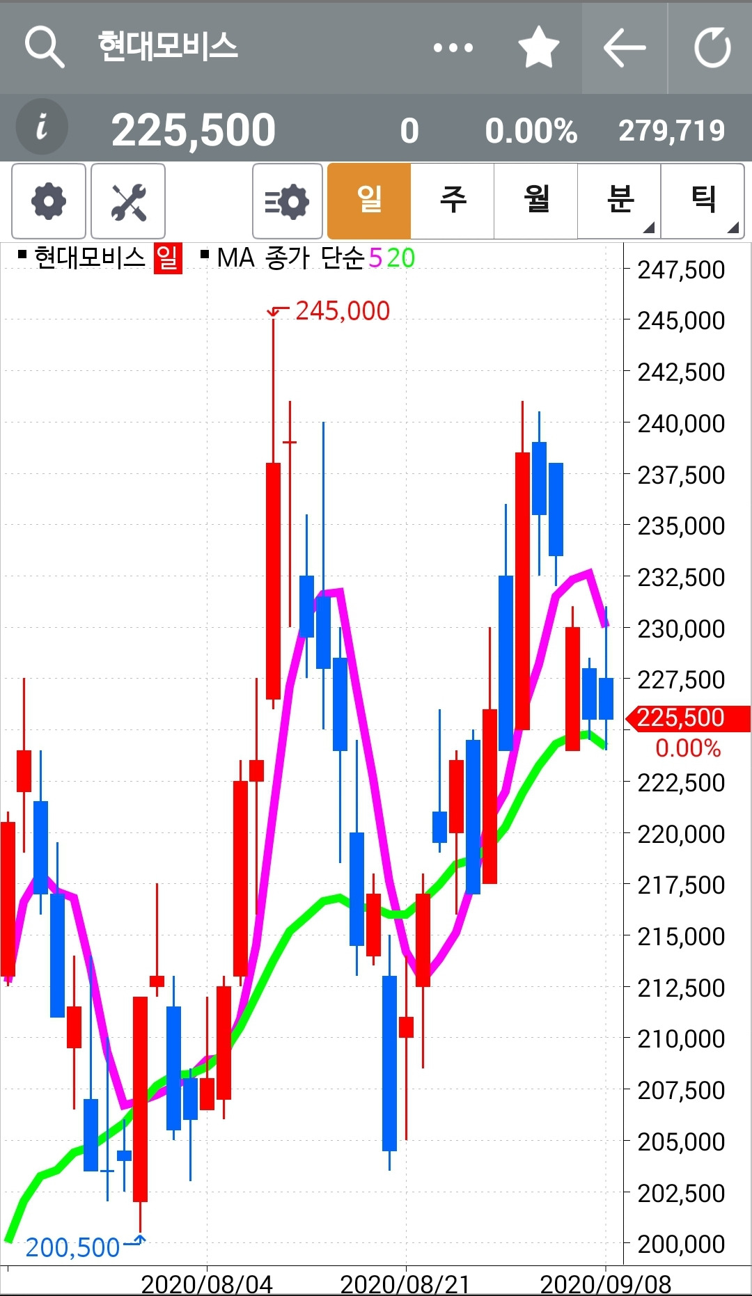 현대 모비스. 5일선이 20일선 위에 있으니 나는 들어갔고 조정을 이미 받았으니 20일 선위에서 빵! 되돌리지 않을까가 나의 희망사항이었고 그 희망사항은 팍 고꾸라졌다. 흑.