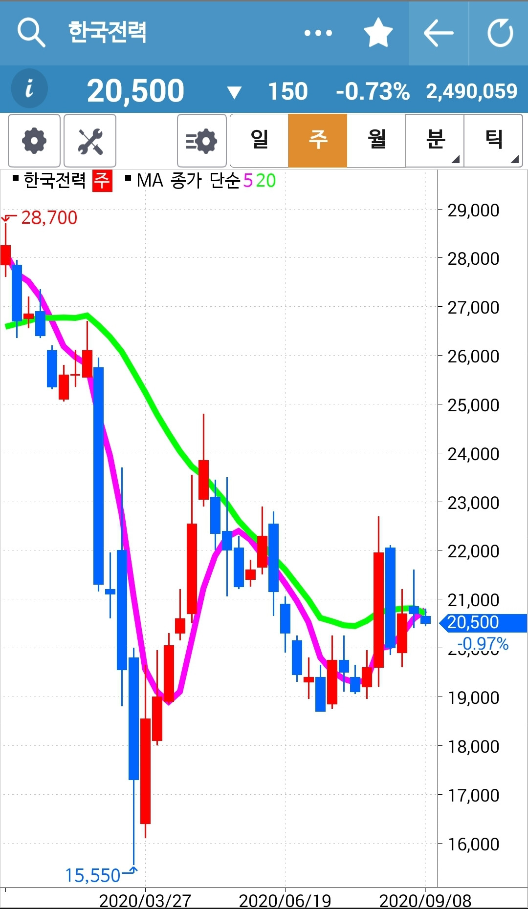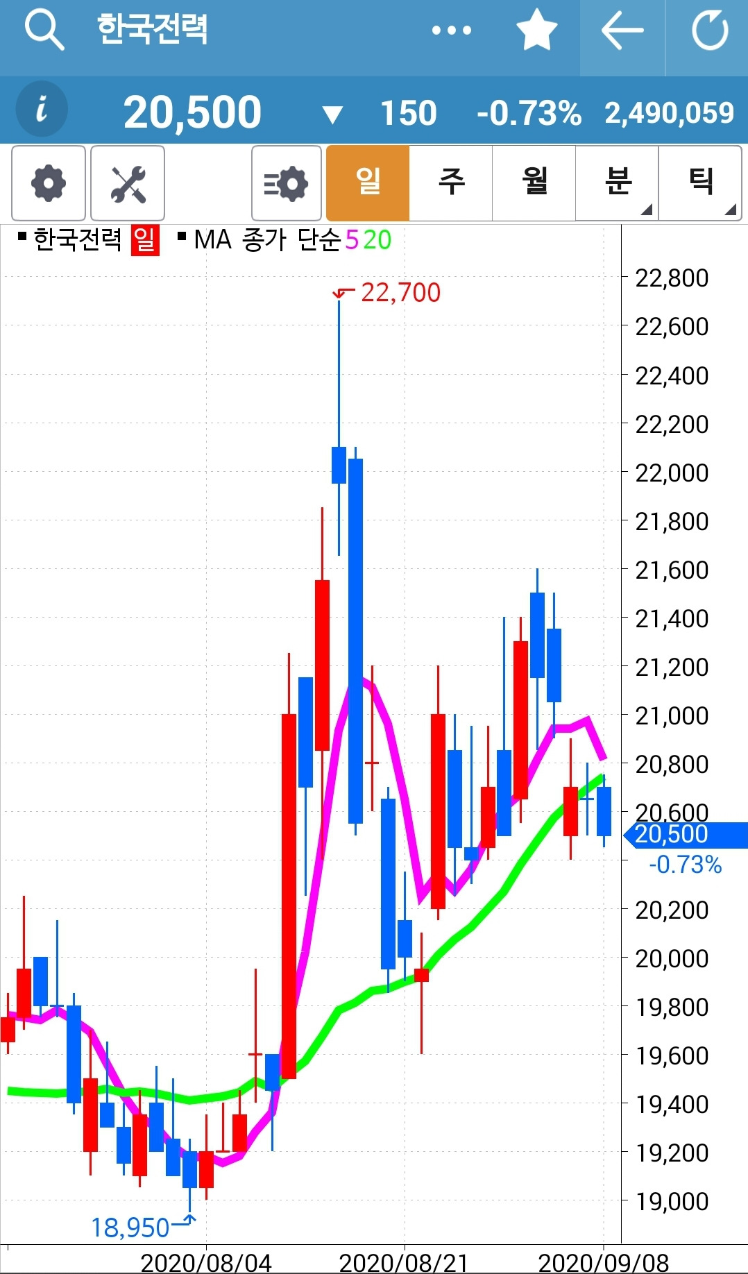 한국전력. 5일선이 위에 있으면서 충분히 조정을 받았다는 그 비슷한 이유로 들어갔지만 20일선 아래서 삼일째 놀고 있는 이게 과연 올라줄까? 5일선이 20일선 아래로 내려가면 난 또 나올 수밖에 없는데. 잘 못 들어간 것 같다. 할 수 없다. 그래도 다른 변명은 필요 없다. 꽝! 충돌이 일어나면 난 나와야만 한다. 그것만 기억하면 된다. 파이팅!!!