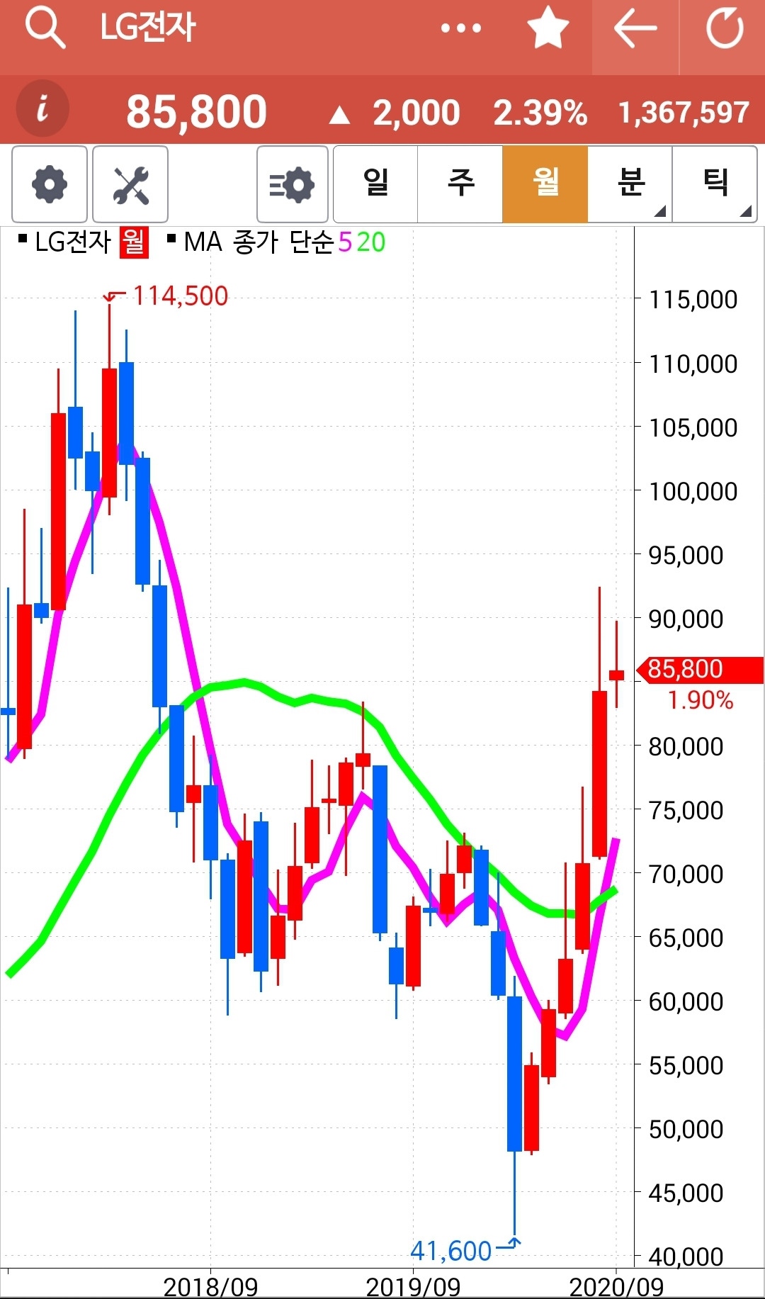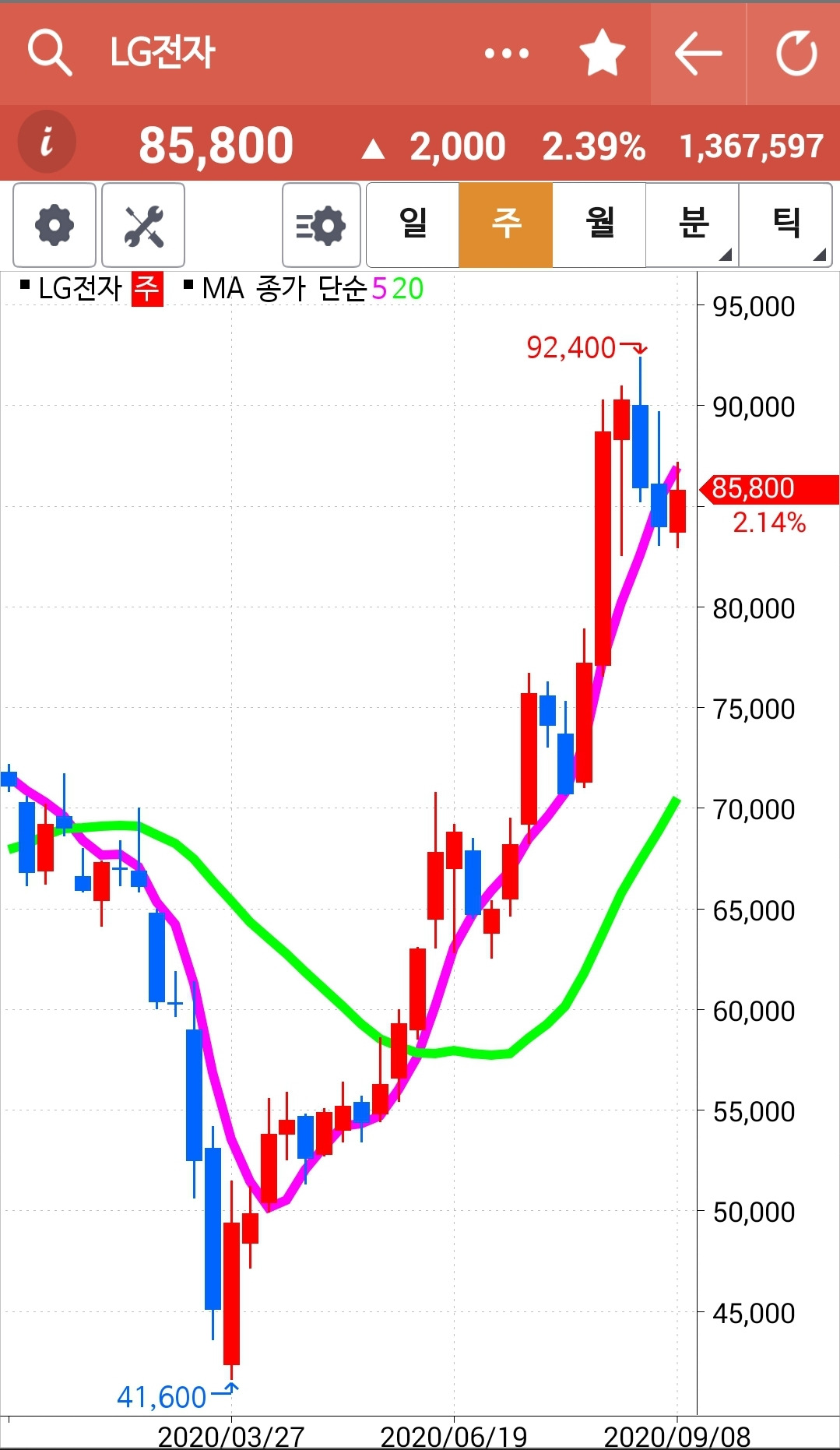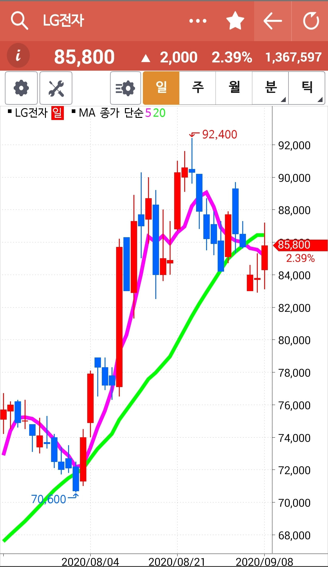 LG전자. 나의 사랑 LG전자는 아흑, 5일선이 20일선 아래로 내려와 나의 님은 갔습니다~ 멀리멀리 보냈더니 오늘 빵! 멋지게 위로 올라온다. 그러나 아직 5일선이 20일선 아래 있으니 매수할 수는 없다. 나의 사랑 LG전자. 나의 눈은 계속 너를 보고 있노라. 5일선이 20일선 위로 올라오는 날 내 다시 너를 품으리.