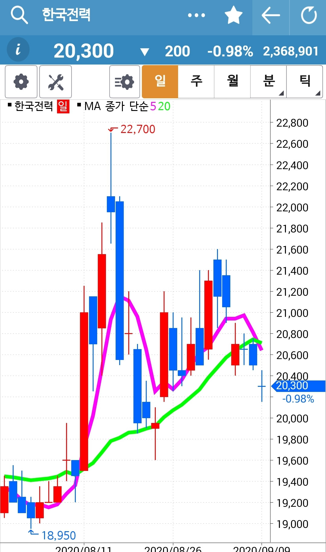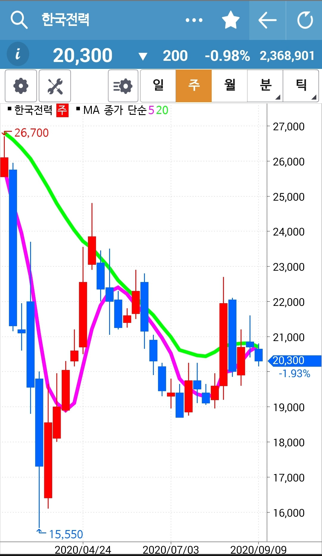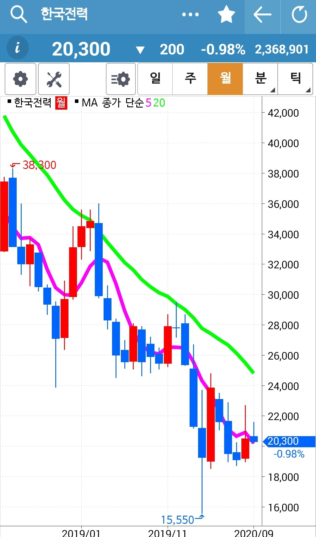 한국전력. 안타깝게 5일선이 20일선 아래로 내려왔다. 역시 월봉이 저렇게 쭈욱 쭉 내려가고 있는 것은 힘을 받기가 힘든가 보다. 주봉도 아직 내려가고 있는 그림. 어쨌든 이번 매매는 실패. 안녕.