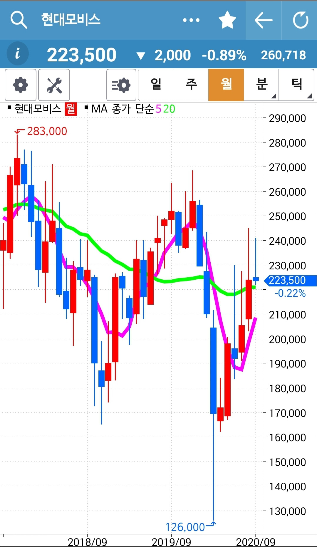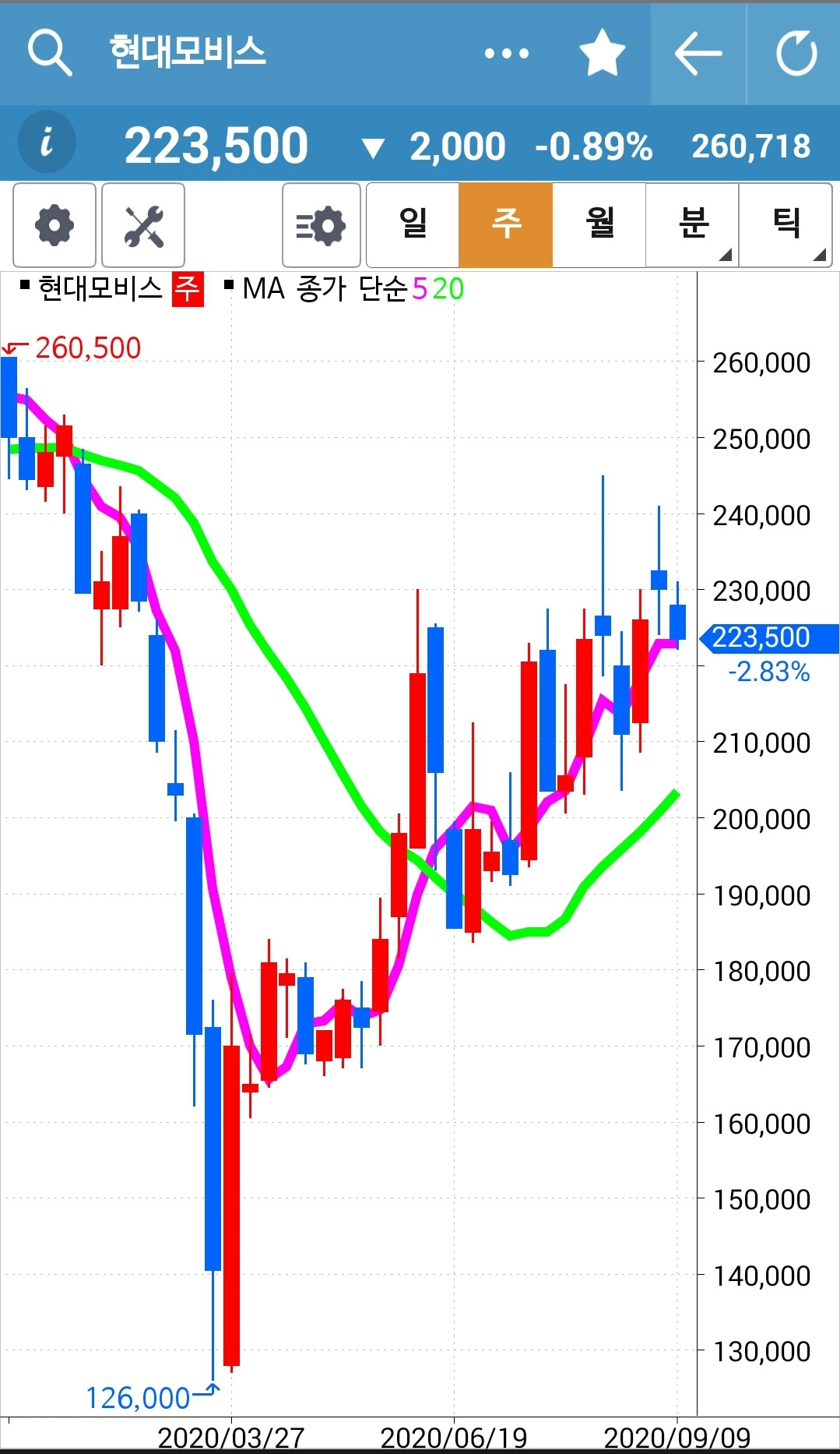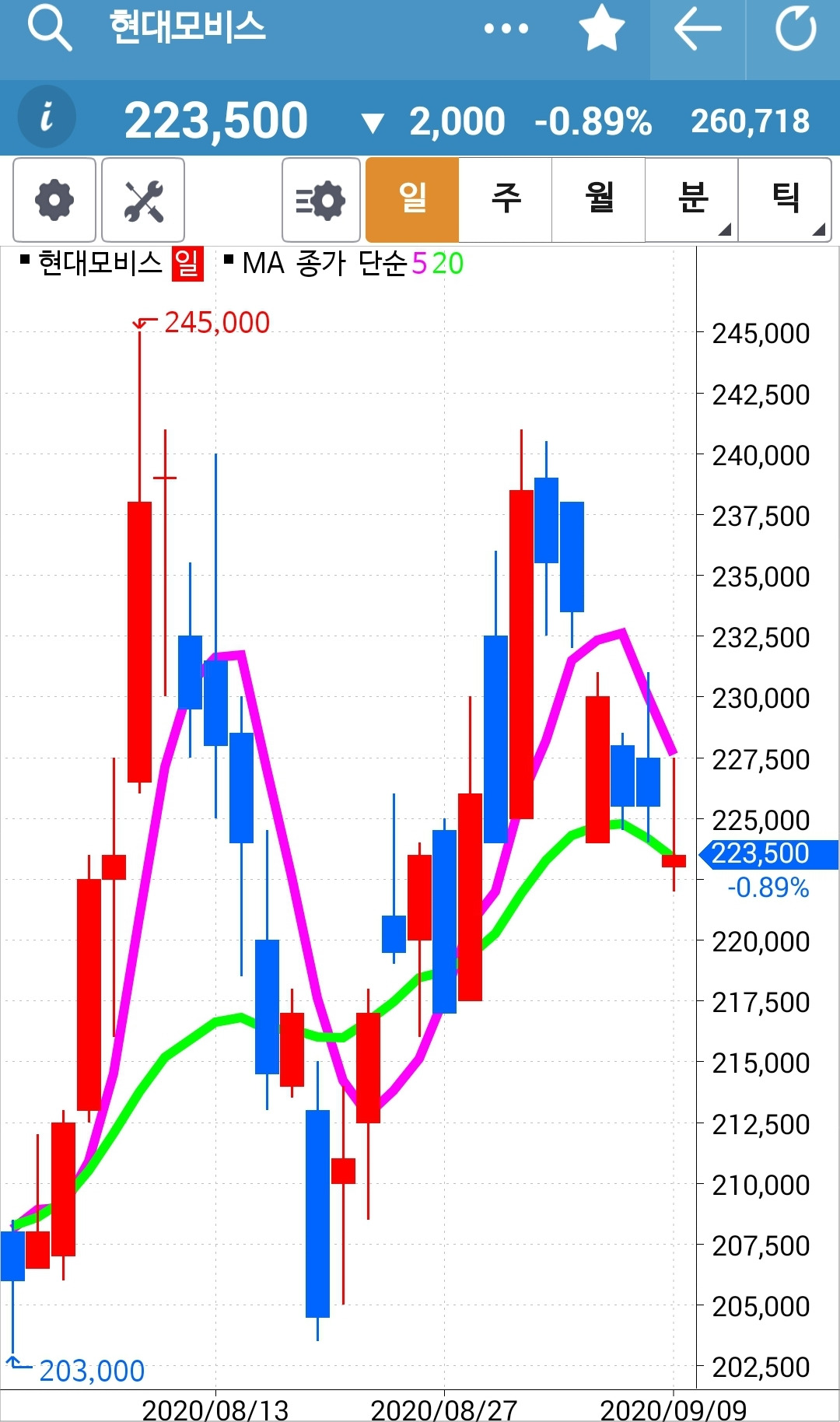 현대모비스. 나의 생존 종목 딱 하나. 그러나 이것 역시 위태위태하다. 5일선은 아래로 꺾이고 있고 주가는 위로 빵! 올라가지 못하고. 20일선 딛고 빵! 올라주기를 기대했건만 무너져버렸다. 그래도 아직 5일선이 위에 있으니 생존이다. 파이팅!!!