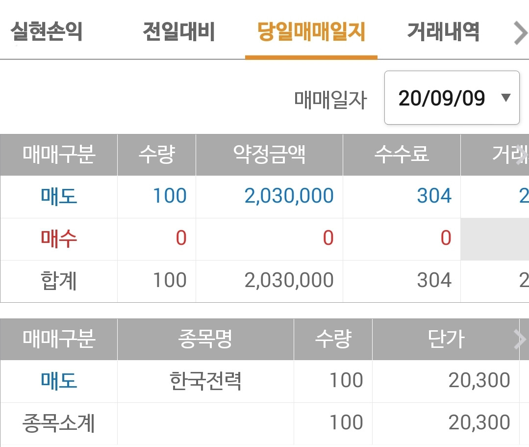사진 1. 현물 주식. 한전은 여기서도 탈락이다. 100주 몽땅 매도.
