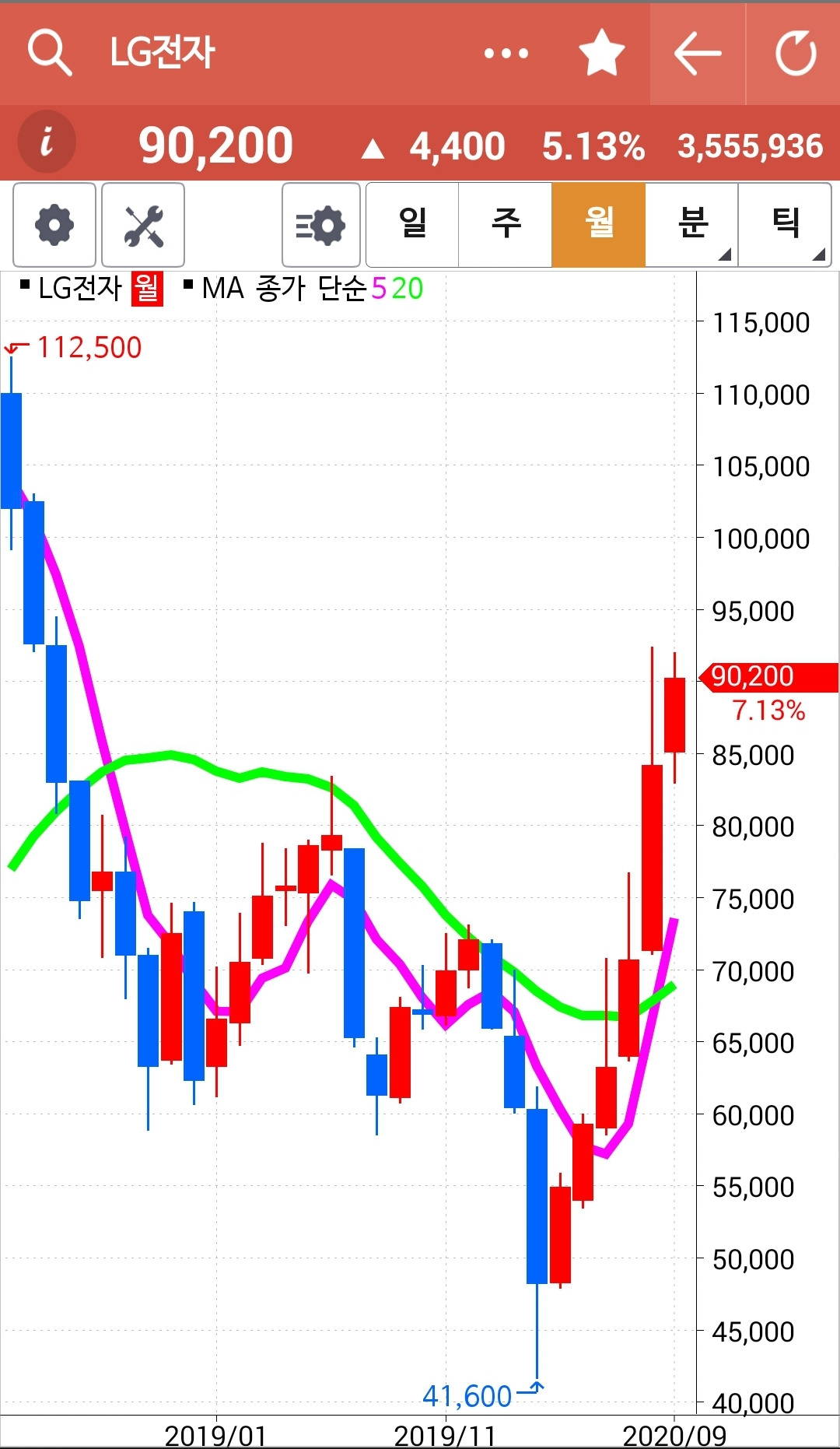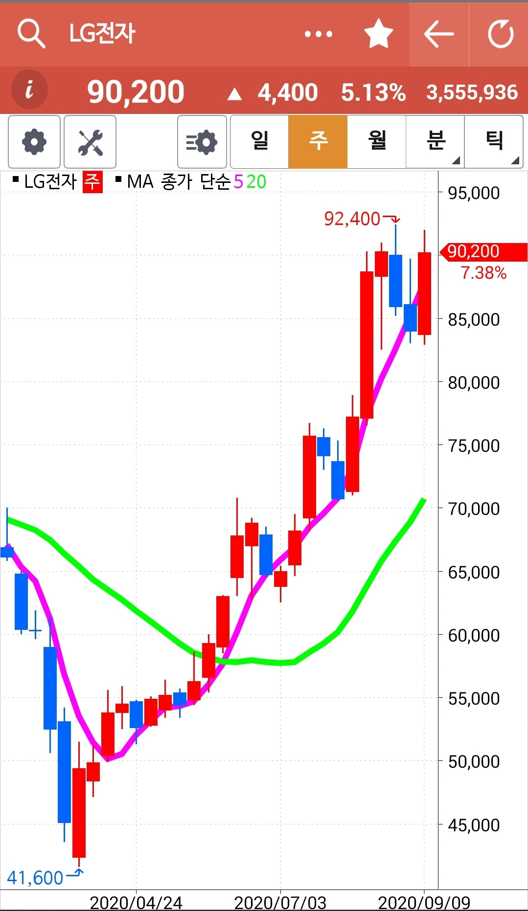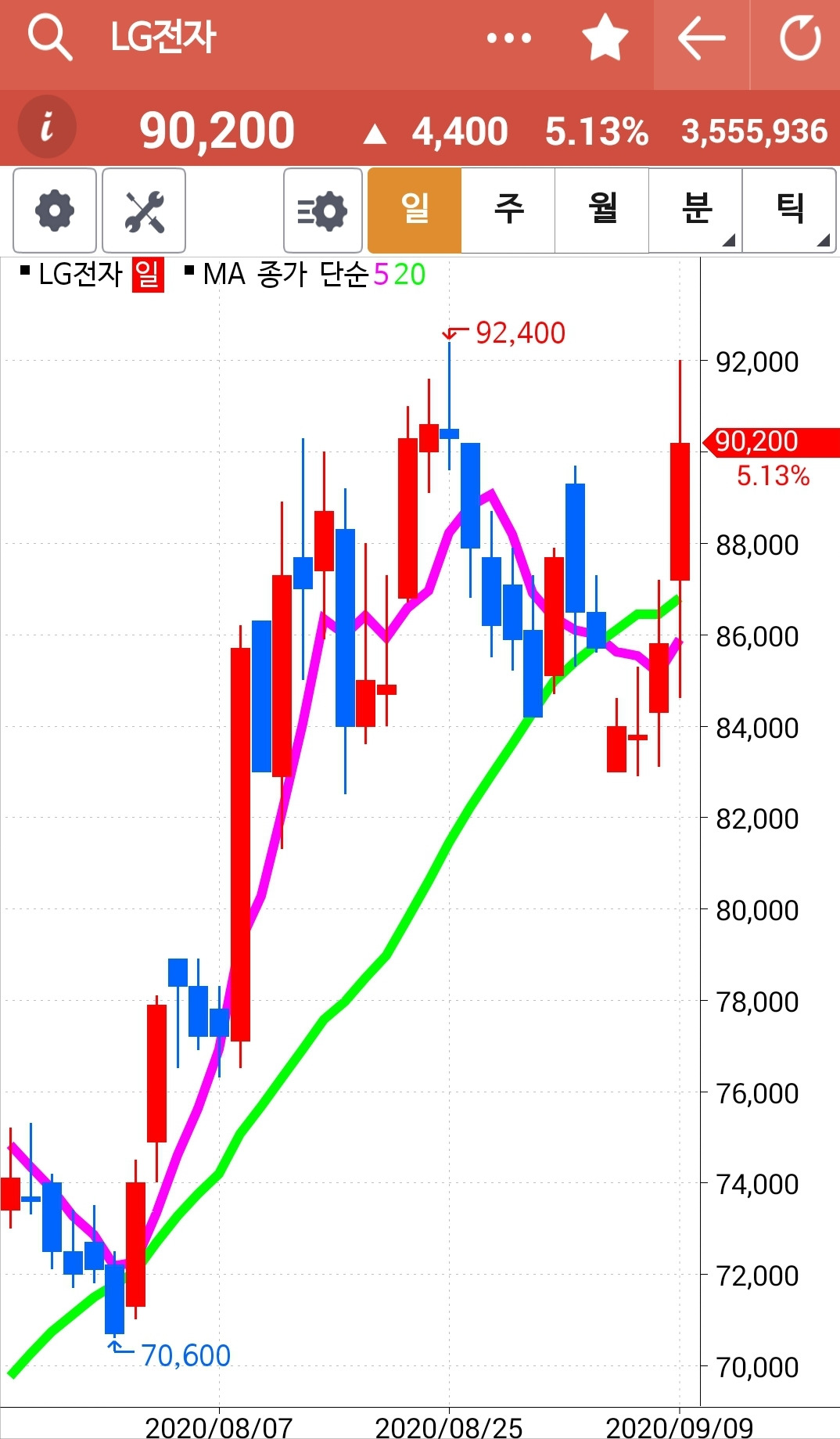 LG전자. 나의 사랑 LG전자. 그래도 아직 5일선이 20일선 아래 있으므로 매수에 가담하지 못한다. 내일이면 5일선이 빵! 20일선을 뚫고 올라갈 것 같다. 난 그걸 확인하고 나서야 들어갈 수 있다. 잘 참았다. 이렇게 지켜보고 있으니 걱정 말아라. 내 언제고 너를 다시 품으리. 하하 푸하하하 파이팅!!!