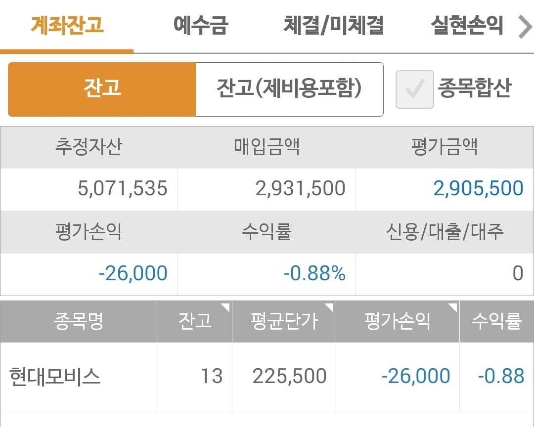 사진 2. 현물 주식 잔고. 현대모비스만 남았다. 하이고 500만 원 투자금인데 꼴랑 7만 원의 수익이다. 그래도 힘차게 파이팅!!!