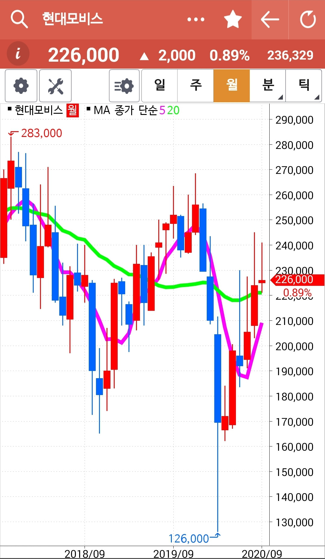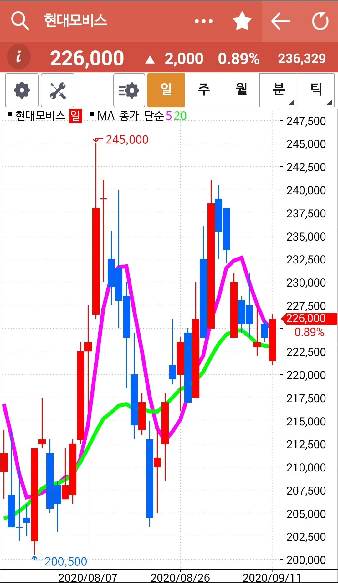 현대모비스. 그럼 그렇지. 20일선 부딪고 빵! 올라주어야지. 다행이다. 5일선이 20일선을 건드리지 않고 다시 올라가서. 제발 쭉쭉 빵빵 올라주어라. 파이팅!!!