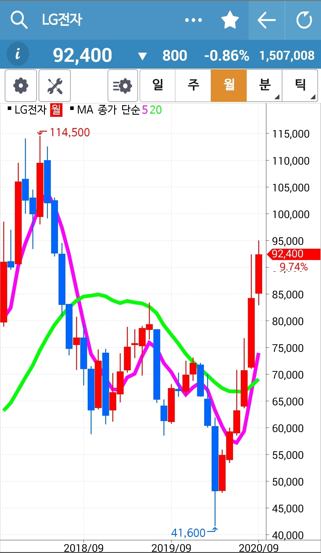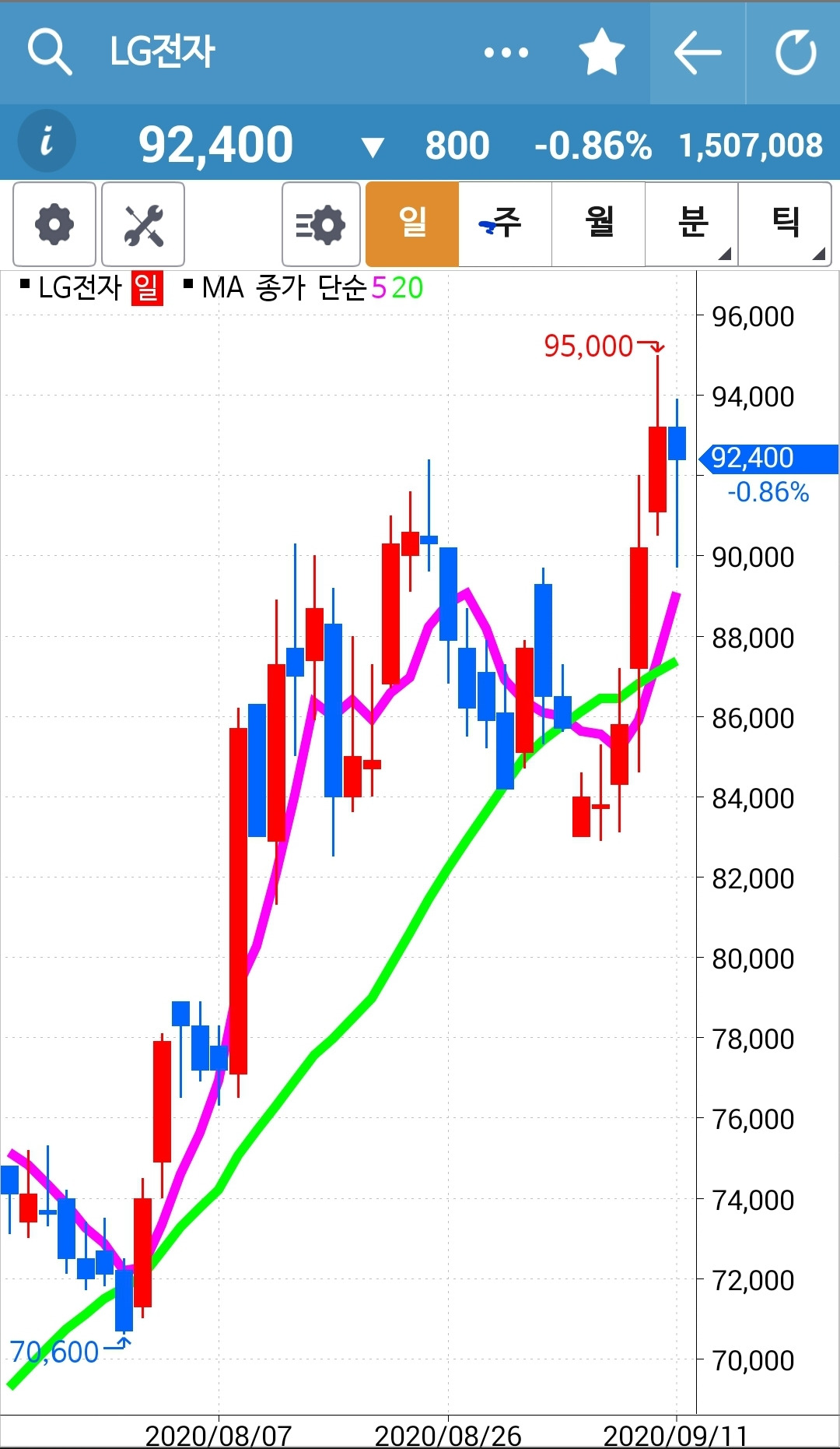 LG전자. 5개의 양봉 후 음봉. 음하하하 적당한 음봉이라 생각하자. 만약 다섯 개 여섯 개 주야장천 양봉으로만 이루어진다면 조만간 나타나고야 말 음봉을 너무나 두려워할 수밖에 없었을 테니까. 자연스러운 흐름이라 생각하자. 음하하하 일봉 주봉 월봉 모두 5 이평선이 위를 향하고 있으며 20 이평선 위에 있는데 무슨 걱정이람. 괜히 살짝 20일선 아래로 내려가 나로 하여금 저 많은 수익을 전혀 맛볼 수 없게 만든 것이 영 야속하지만 어쩌랴. 난 나의 원칙을 지켜야 하는 걸. 파이팅!