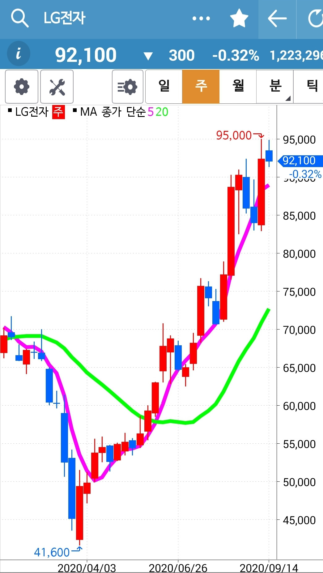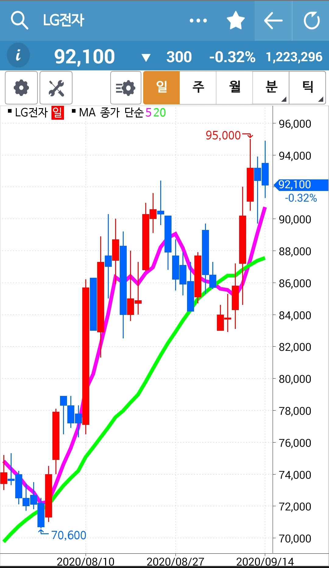 LG전자. 오늘 내가 할 일은 없다. 나의 생존 종목 두 개가 다 원위치를 지키고 있기 때문에 매매시점이 아니기 때문이다. 5일선이 20일선 위에 있으니까 빵빵 위로 올라가면 좋겠지만 그렇지 않다 해도 슬퍼할 건 아니다. 올라가는 과정일 테니까. 파이팅!