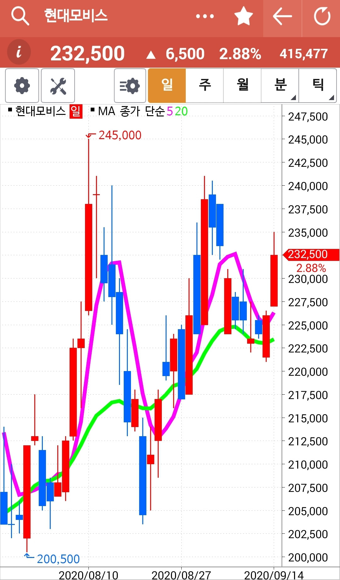 현대모비스. 다행히 20일 선위에서 싹 방향을 틀고 위로 올라간다. 전고점은 가볍게 돌파하지 않을까. 하하 잘 지켜보다. 파이팅!