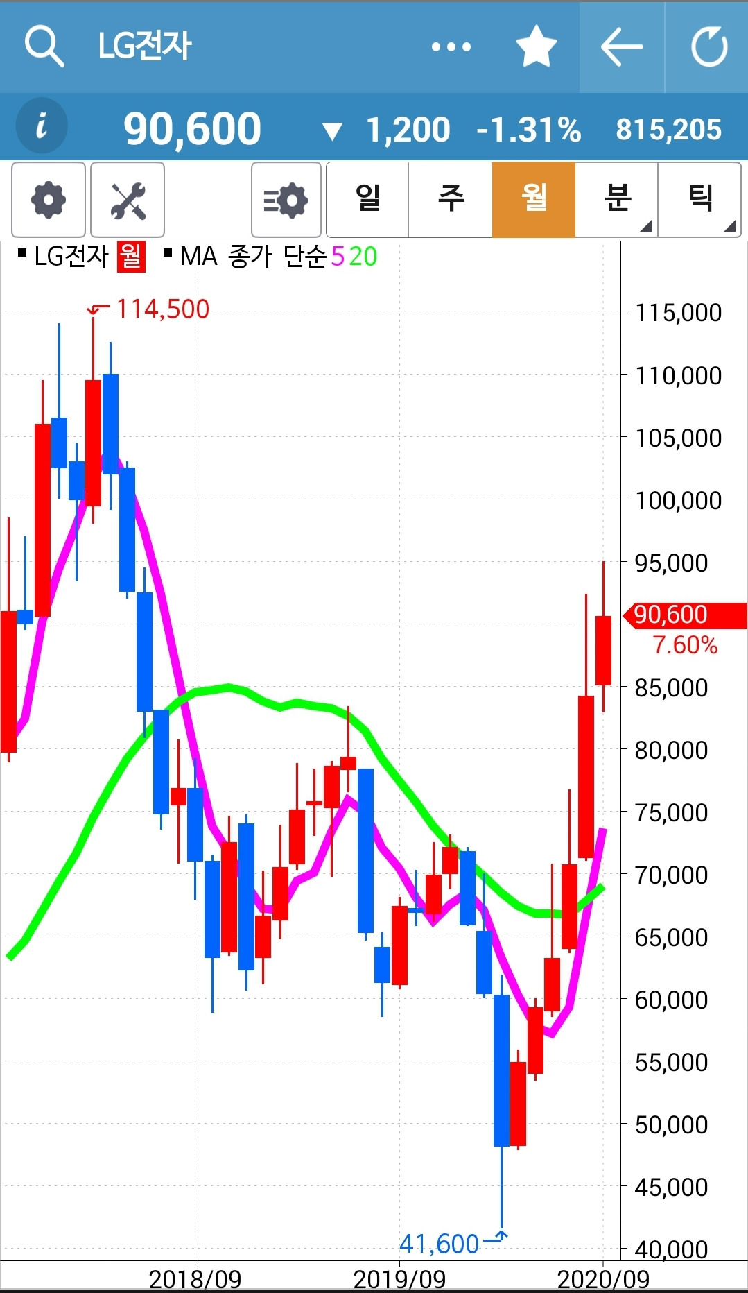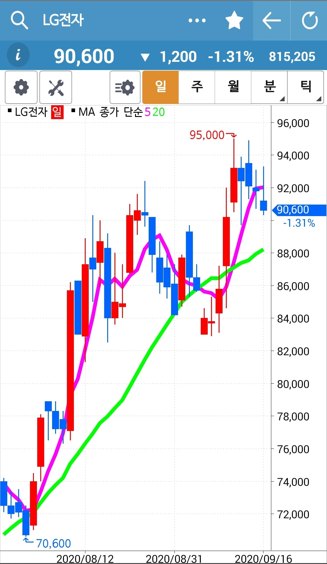 LG전자. 조정 중이다. 그럼 그렇지. 일봉에서 연달아 양봉이 5개가 나왔으니 그 정도면 쉬어줄 만하지. 음봉도 현재 4개째 기록 중이다. 이제 그만 쉬거래이~