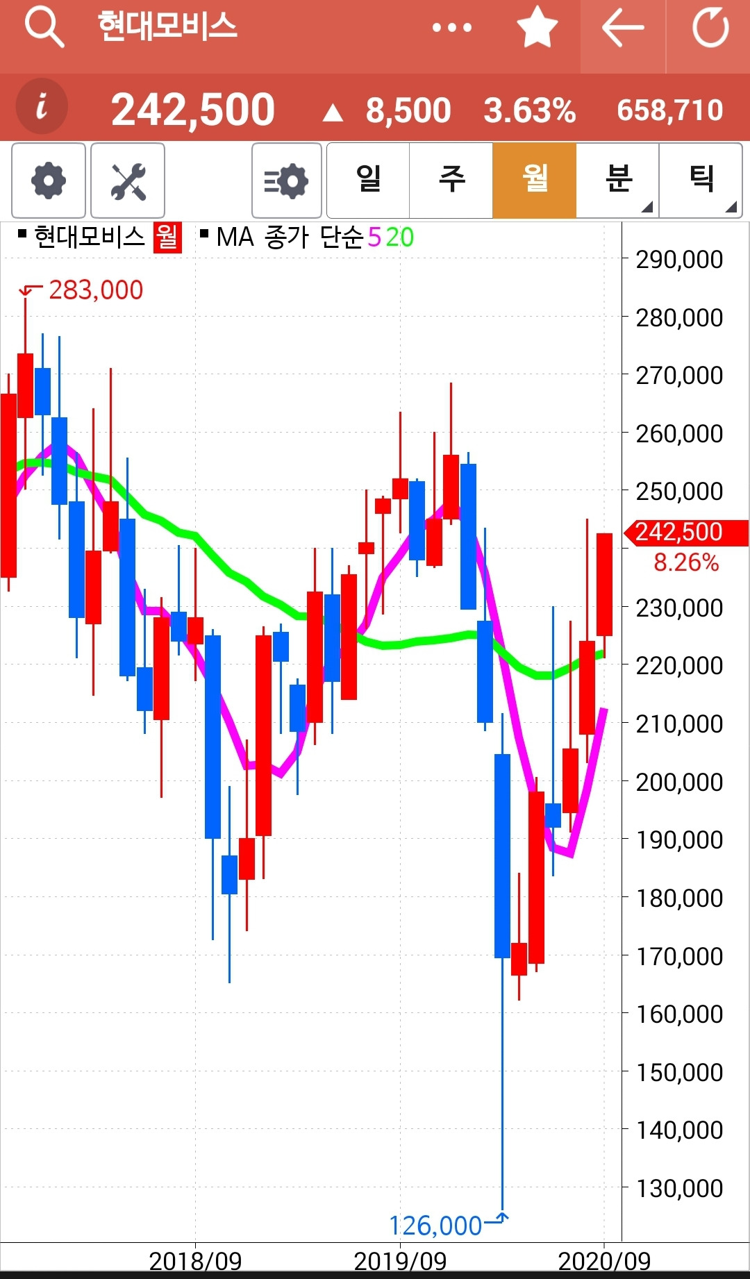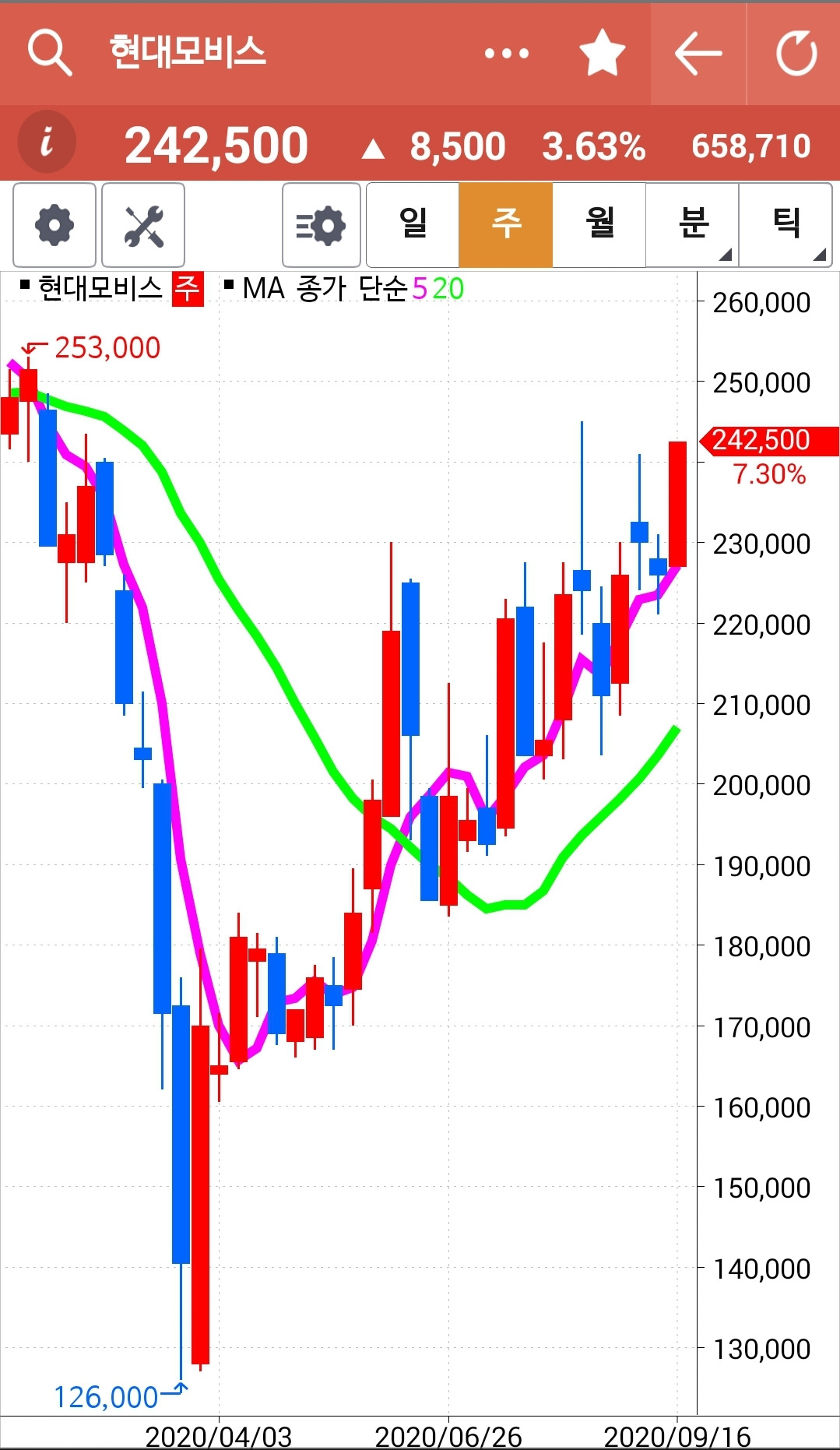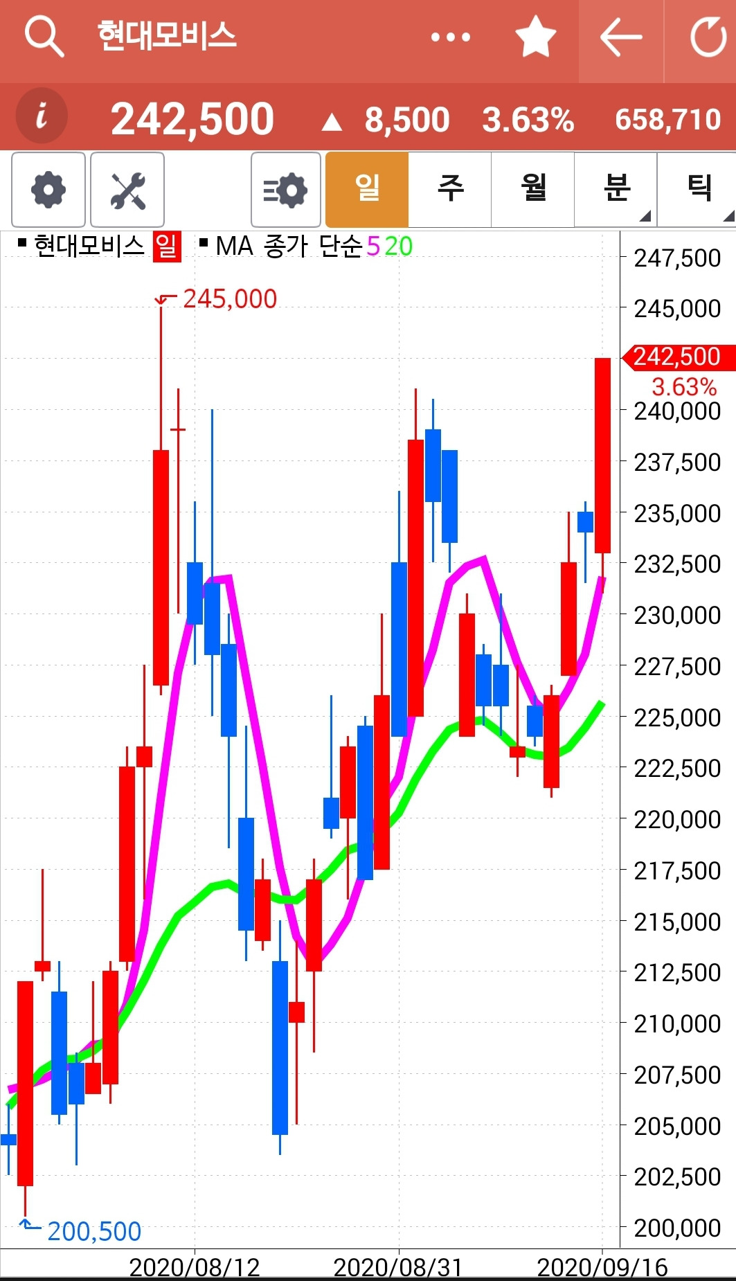 현대모비스. 20일선 근처 와서 돌려주려니 하고 내려가는 걸 샀는데 예상대로 빵 빠 빵 힘차게 턴해 올라가고 있다. 게다가 전고점까지 뚫은 상태니 전전 고점인 245,000원까지는 무리 없이 가지 않을까. 더 이상 생각하지 않아. 5일선이 20일선을 꽝 부딪고 내려오기 전까지 너는 나의 생존 종목. 파이팅!!!