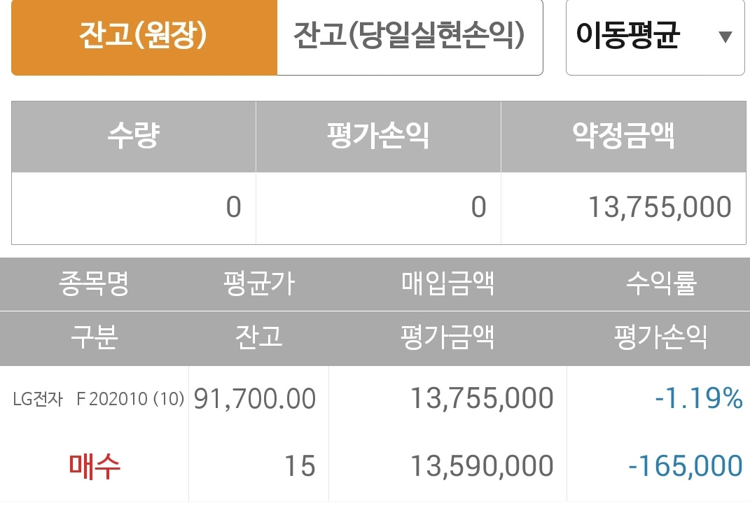사진 2. 선물 주식. 현대모비스를 사둘까 LG전자를 사둘까 하다 LG전자로 몰빵 했는데 처음엔 이익을 주더니 지금 힘을 못쓰고 있다.