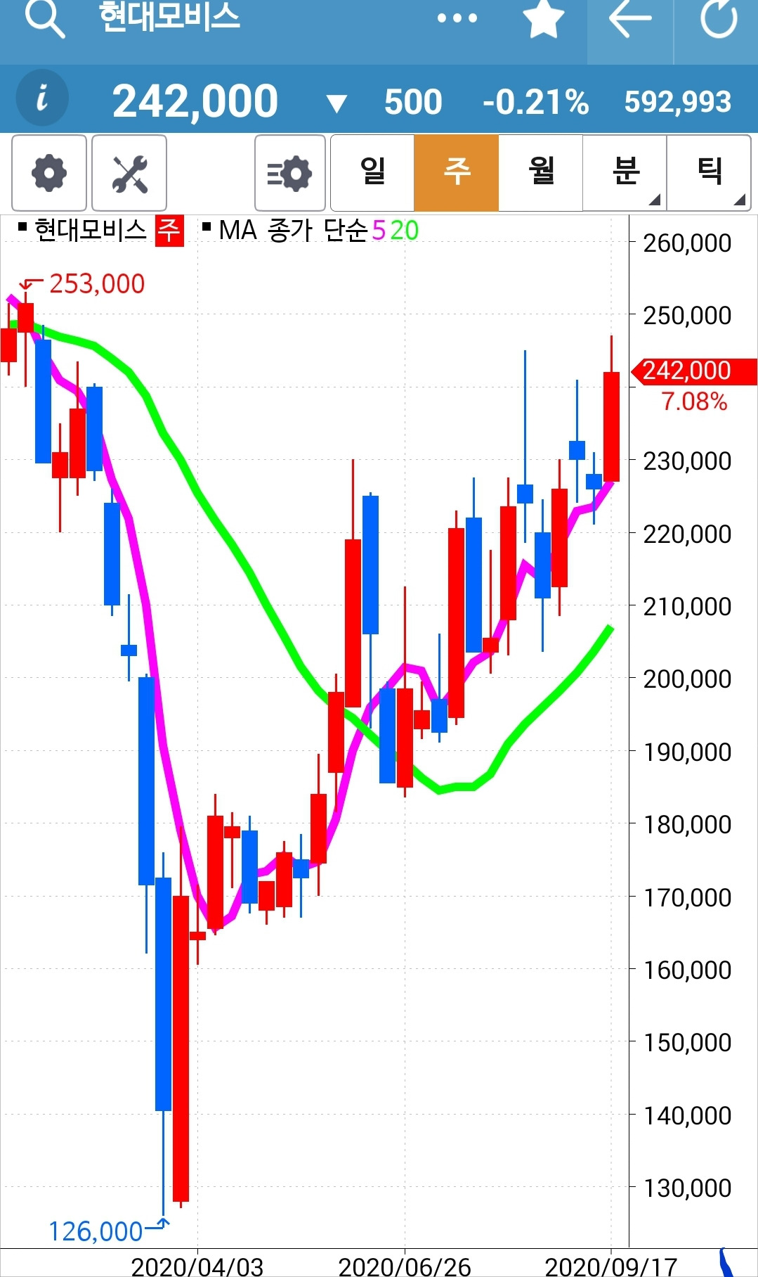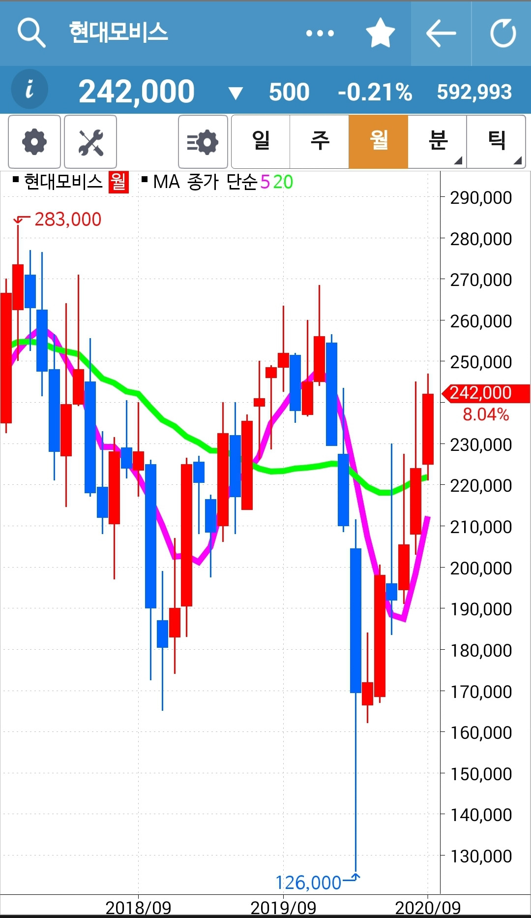 현대모비스. 전 고점 부근에서 나와주어야 했을까? 아니 복잡하게 생각 말자. 그냥 5일선이 20일선 위에 있으니까 잡생각 할 거 하나 없어. 그래. 난 하루 중 3시 20분에 잠깐 신경 쓸 뿐이니까. 절대 이곳에 온 하루를 뺏기지 않기로 했으니까. 3시 20분에만 살짝 보리라. 오늘도 그 시간에 탈락자가 있는가? 후다닥 살펴본 결과 없으므로 그대로 끝이다. 그래. 이거 지키는 것만이라도 금년에 확실하게 훈련하는 거야. 파이팅!!!