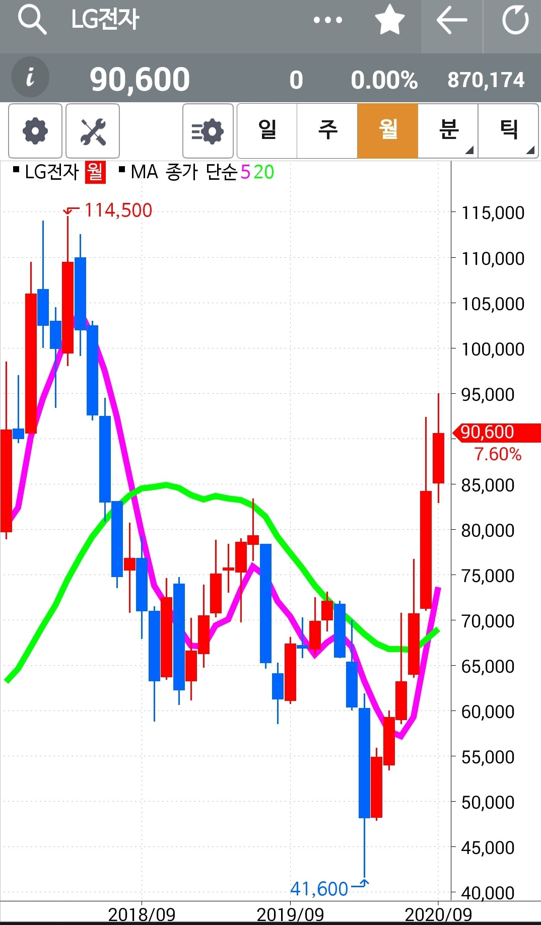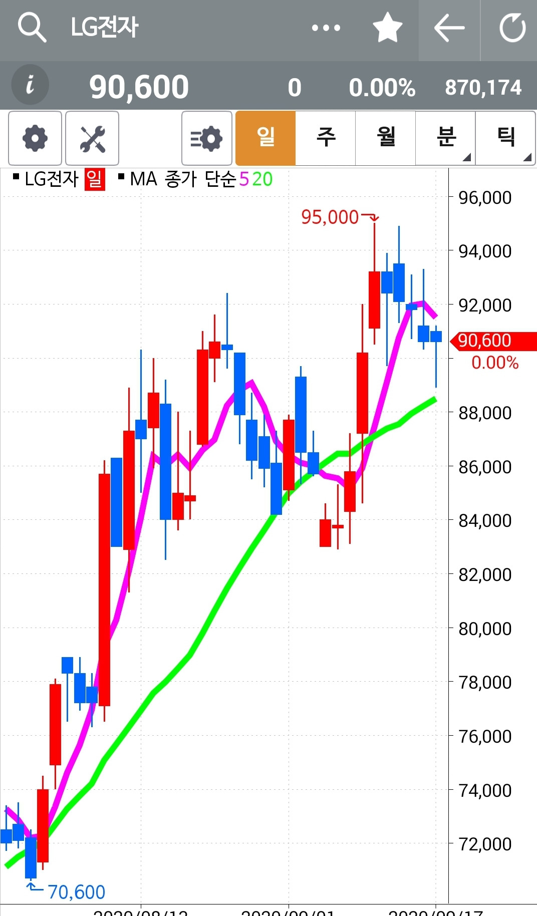 LG전자. 나의 원칙이 문제가 있기는 있다. 이렇게 항상 굴곡으로 가는데 바닥 즈음에서 팔고 고점 부근에서 사고. 하하 그렇게 되면 최악인데. 제발 20일선은 건들지 말아라~