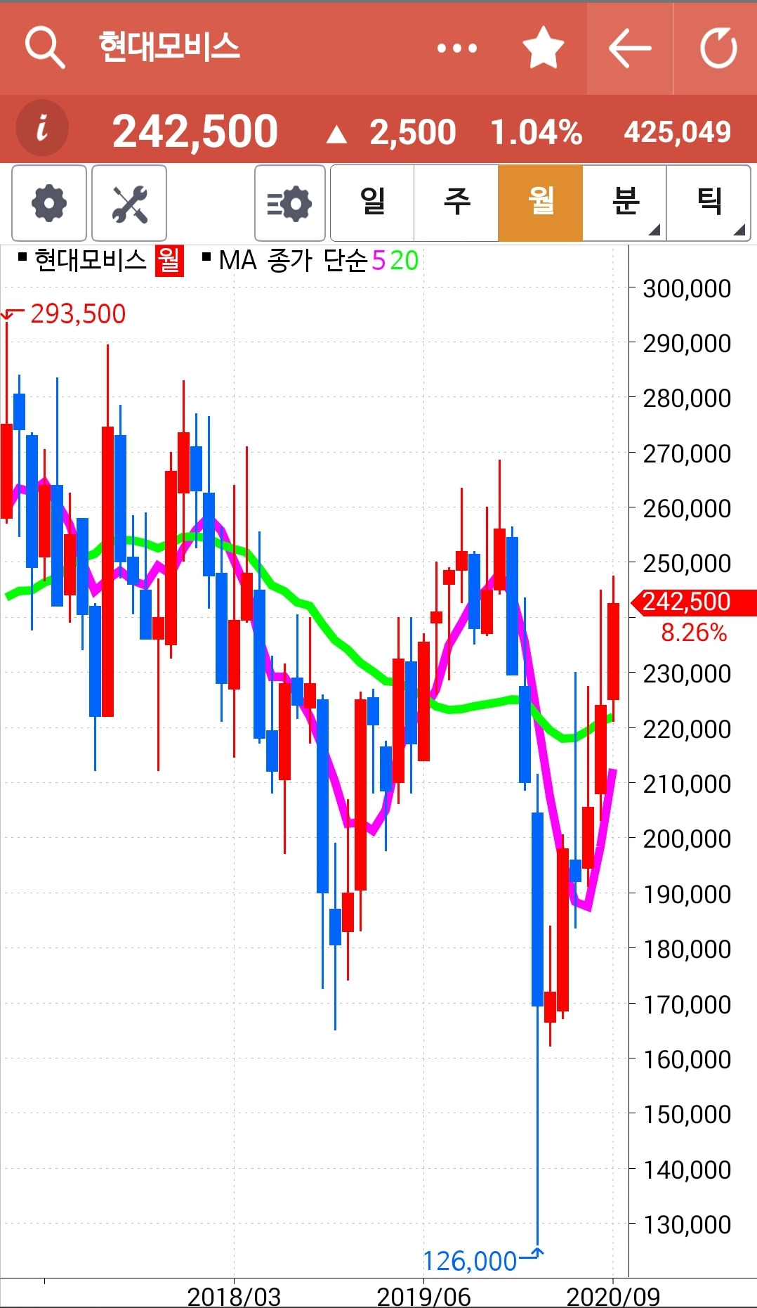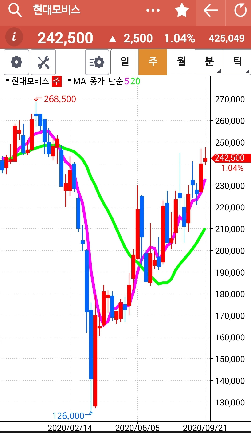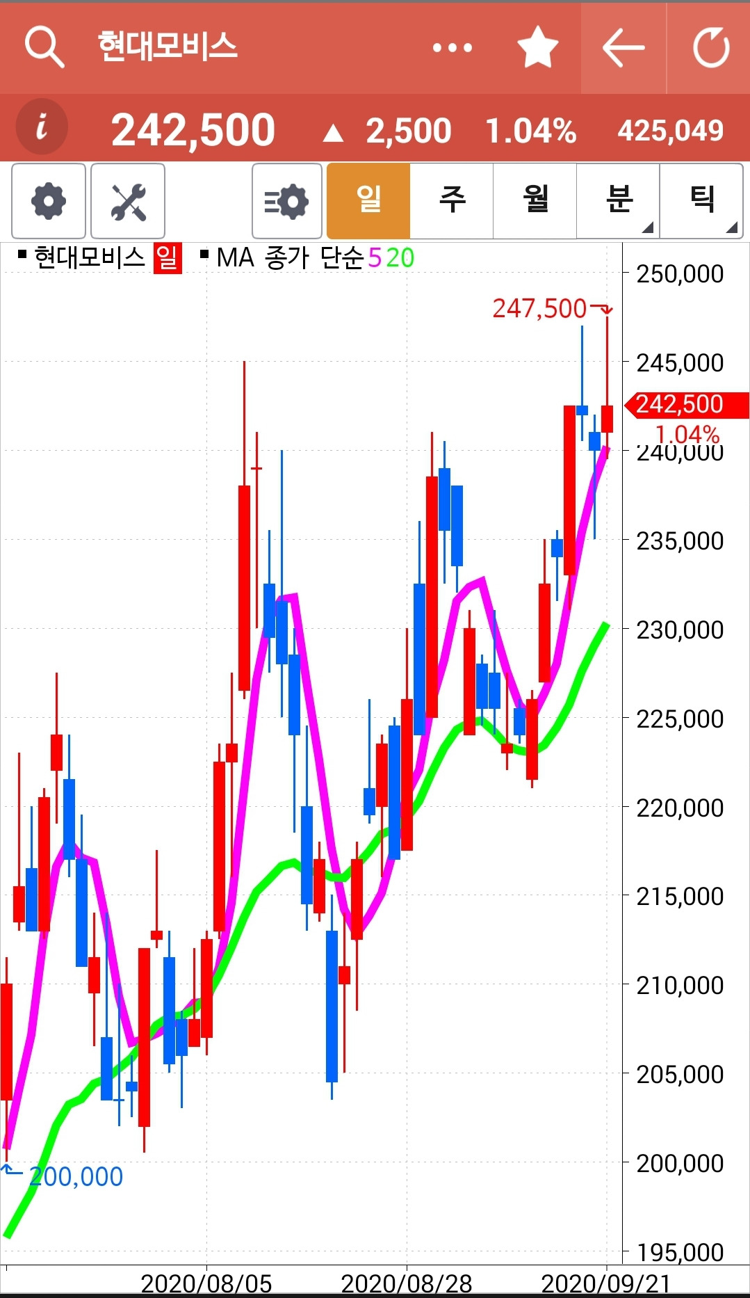 현대모비스. 전고점을 뚫고 다시 내려왔구나. 일단 전고점을 뚫었으니 긍정적으로 보자. 파이팅.