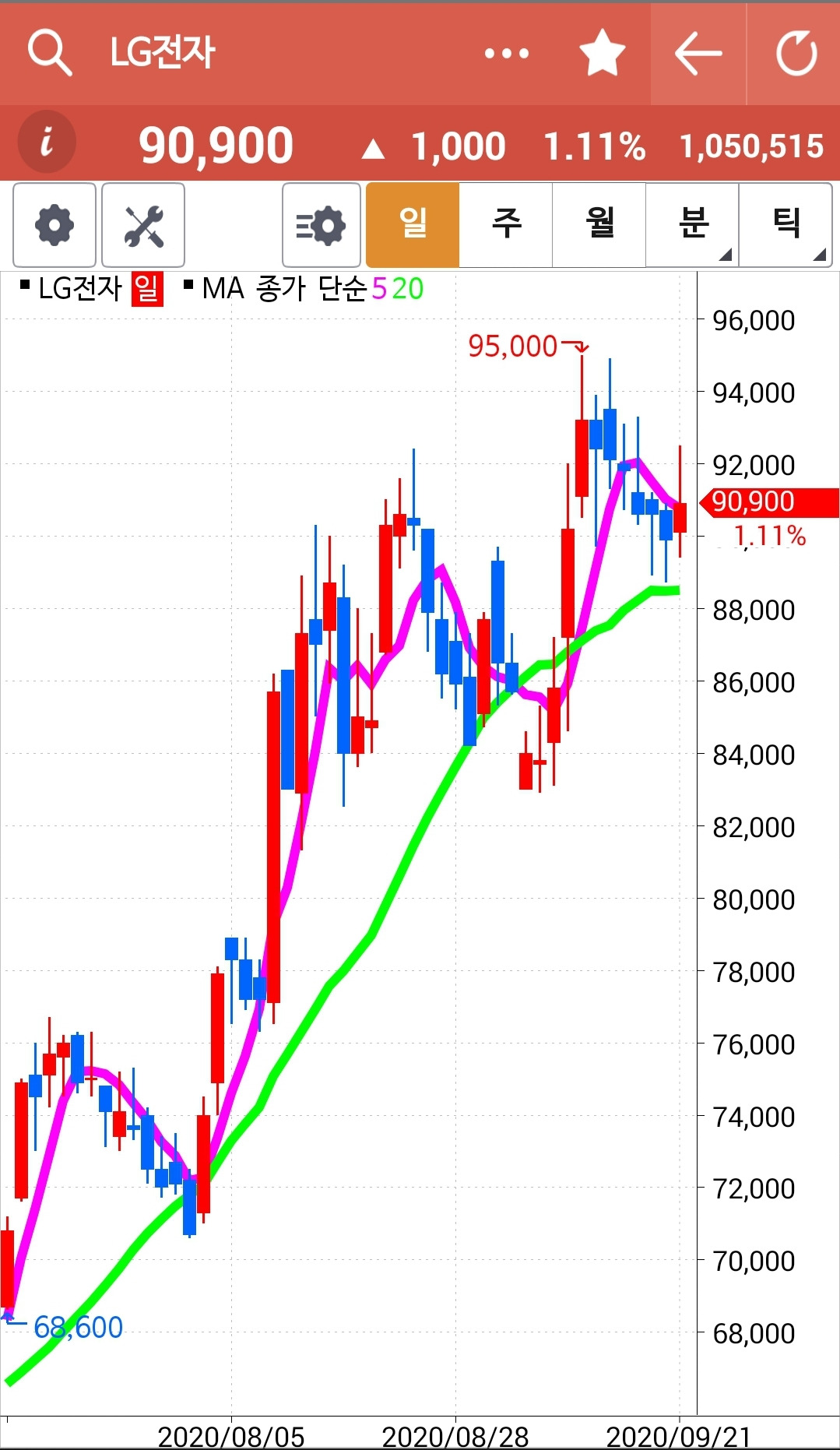 LG전자. 20일선에서 드디어 빵 양봉으로 변한 것은 좋았는데 끝까지 지키지 못하고 밀린 것은 안타까우나 그래도 돌린 것에 긍정마인드를 갖기로 하자. 난 두 눈 부릅뜨고 5일선이 20일선 아래로 내려가는가만 노려보면 된다. 흠. 내려가기만 해 봐 내게서 살아남을 수 없어. 난 아무것도 몰라요. 5일선이 20일선 아래로 내려가면 매도할 뿐야요~ 헤헤.