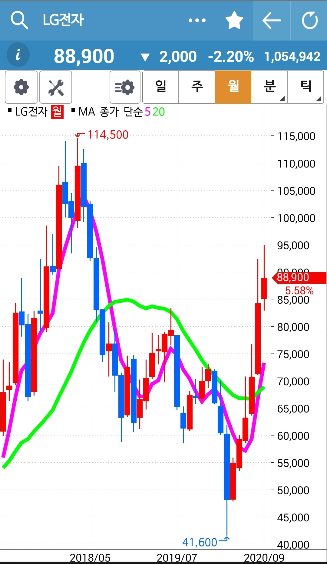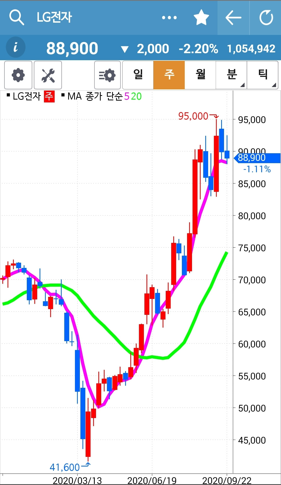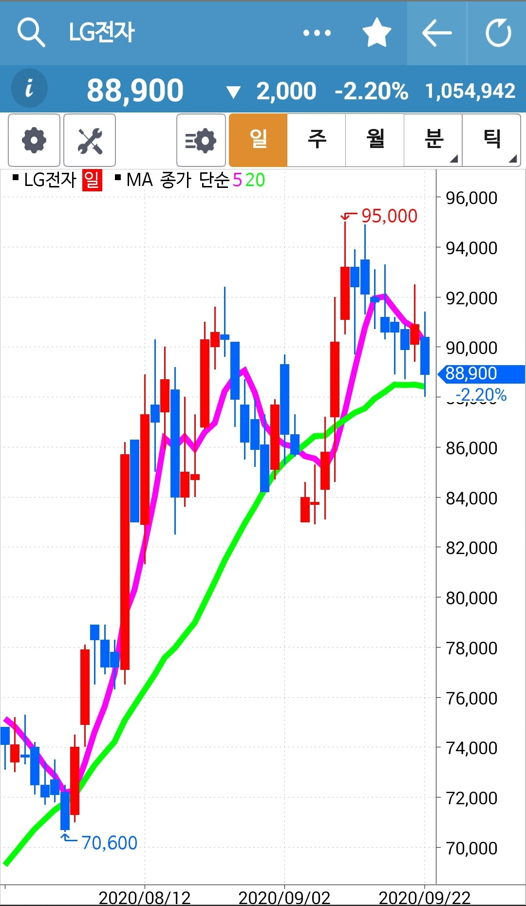 LG전자. 결국 20일선까지 다 내려왔다. 게다가 여차하면 5일선이 20일 선도 뚫을 판이다. 그렇다면 지난번과 같은 전철을 밟지 않을까. 어떡하나. 그래도 따라가야 하나. 너무 오르고 매수신호가 나왔으니 기다렸어야 하는 걸까. 모르겠다. 지켜보자.