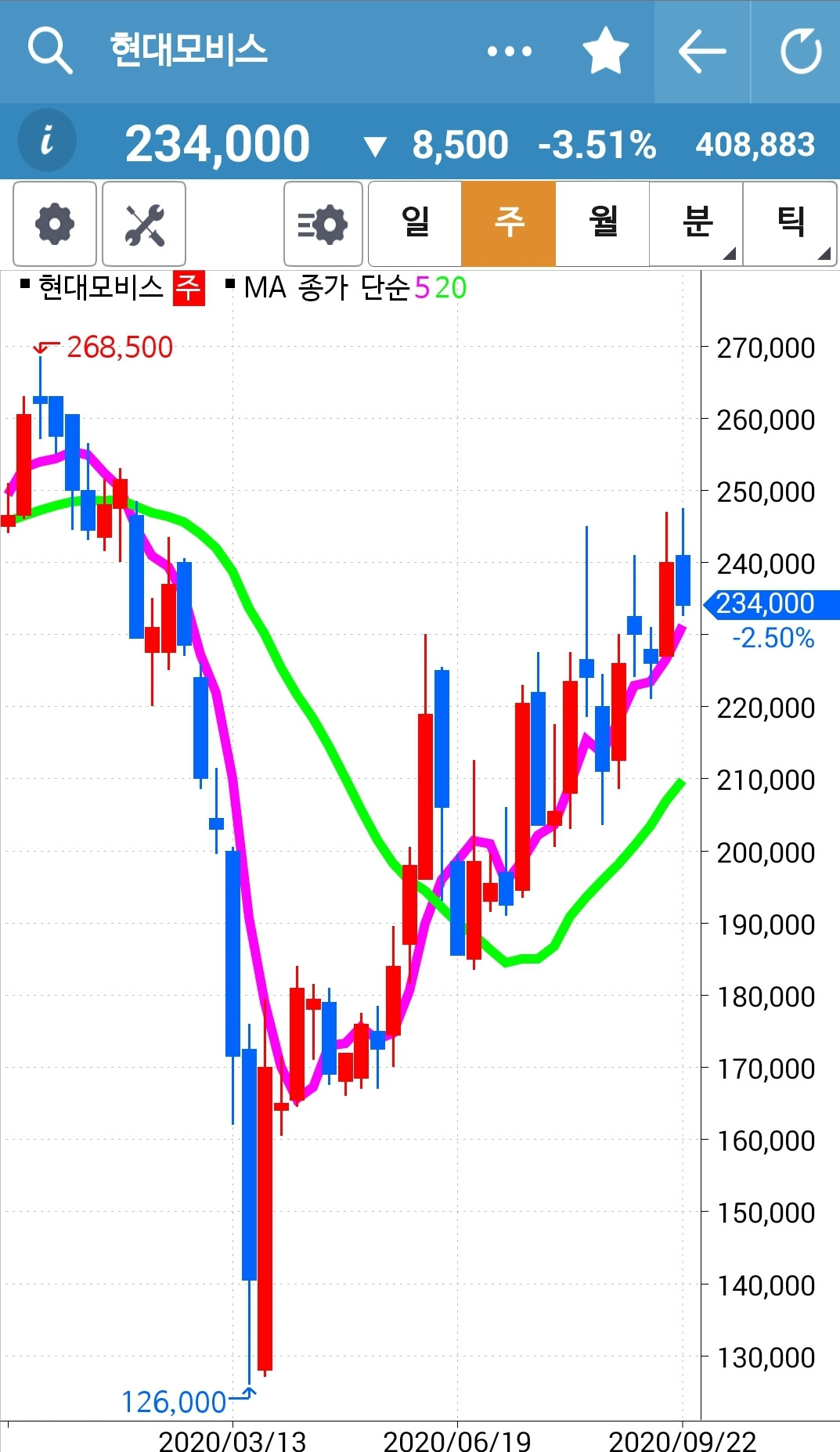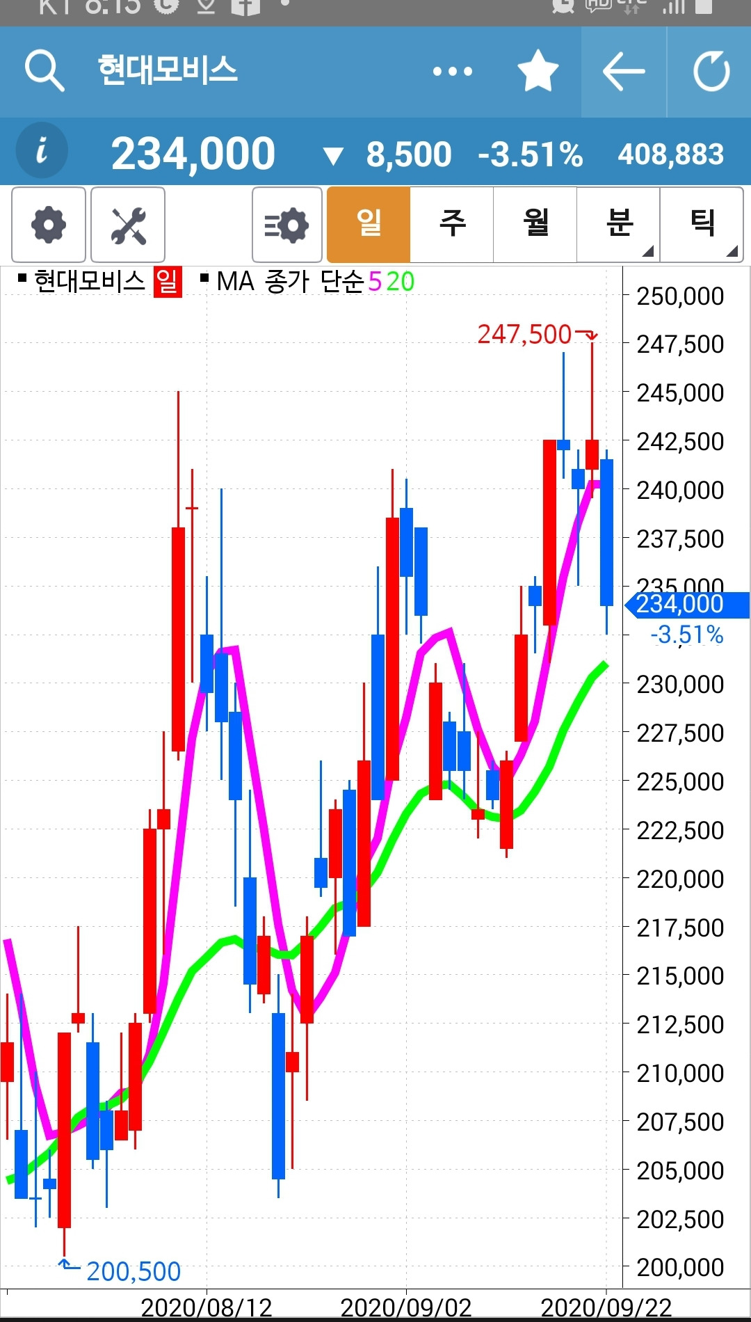 현대모비스. 캬~ 그토록 큰 수익을 주었었는데 세상에 오늘 길고도 긴 음봉. 이렇게 수익을 몽땅 돌려주는 건 아니지 않을까? 음 심각하게 고민해봐야겠다. 수익 챙기는 법을.