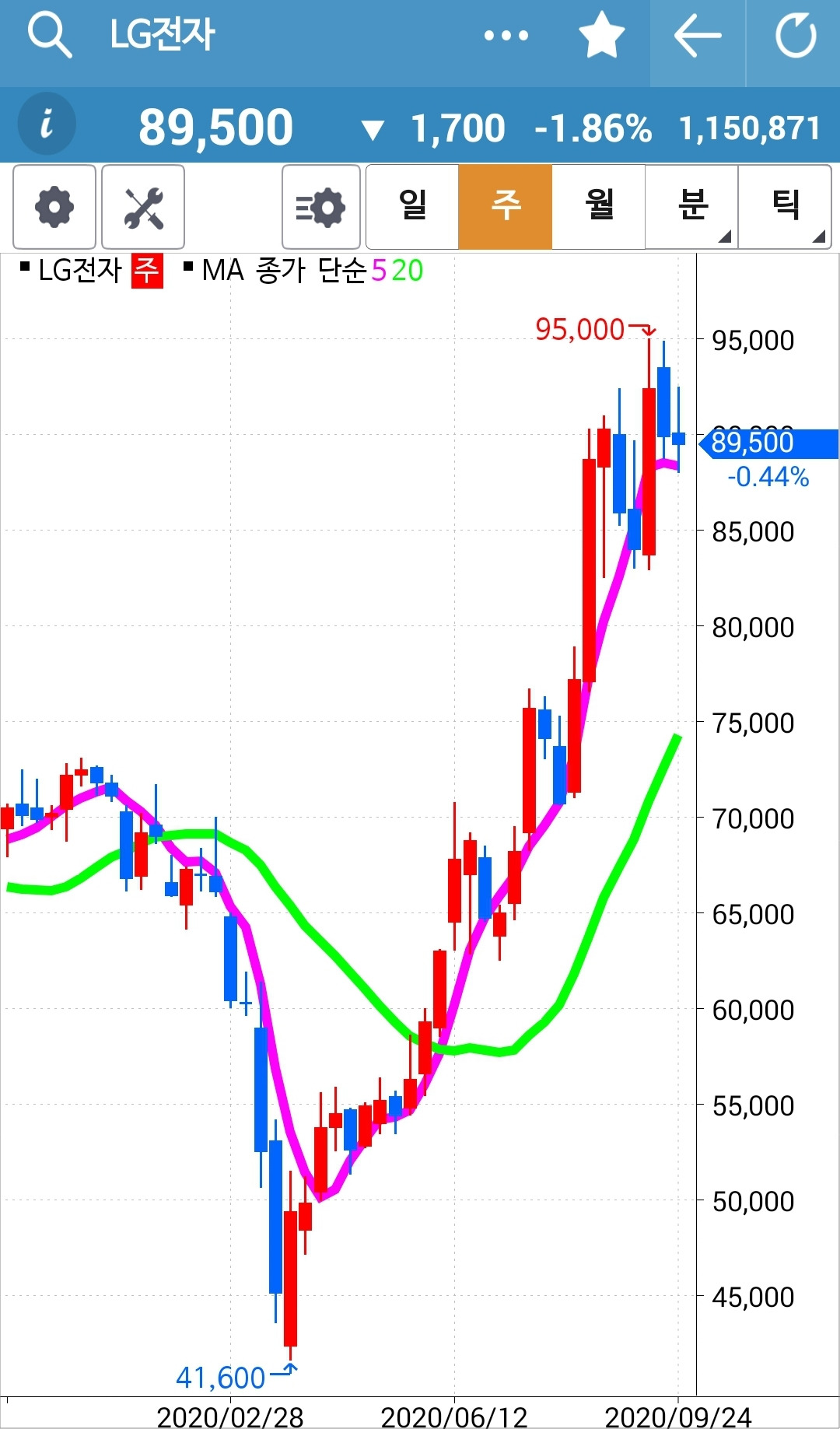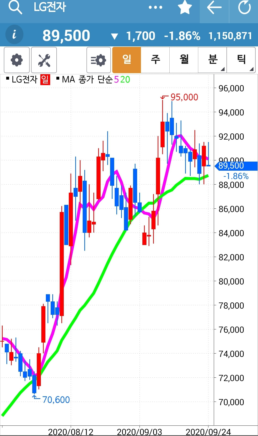 LG전자. 하이고 어떡하나 감정 대신 두 눈을 부릅뜨고 노려봤다. 5일선이 20일선 아래로 내려가는가? 아니다. 아직 위에 있다. 눈에 힘을 푼다. 내가 할 일이란 아무것도 없다. 난 아무것도 몰라요 5일선이 20일선 위면 매수 유지일 뿐야요~ 푸하하하