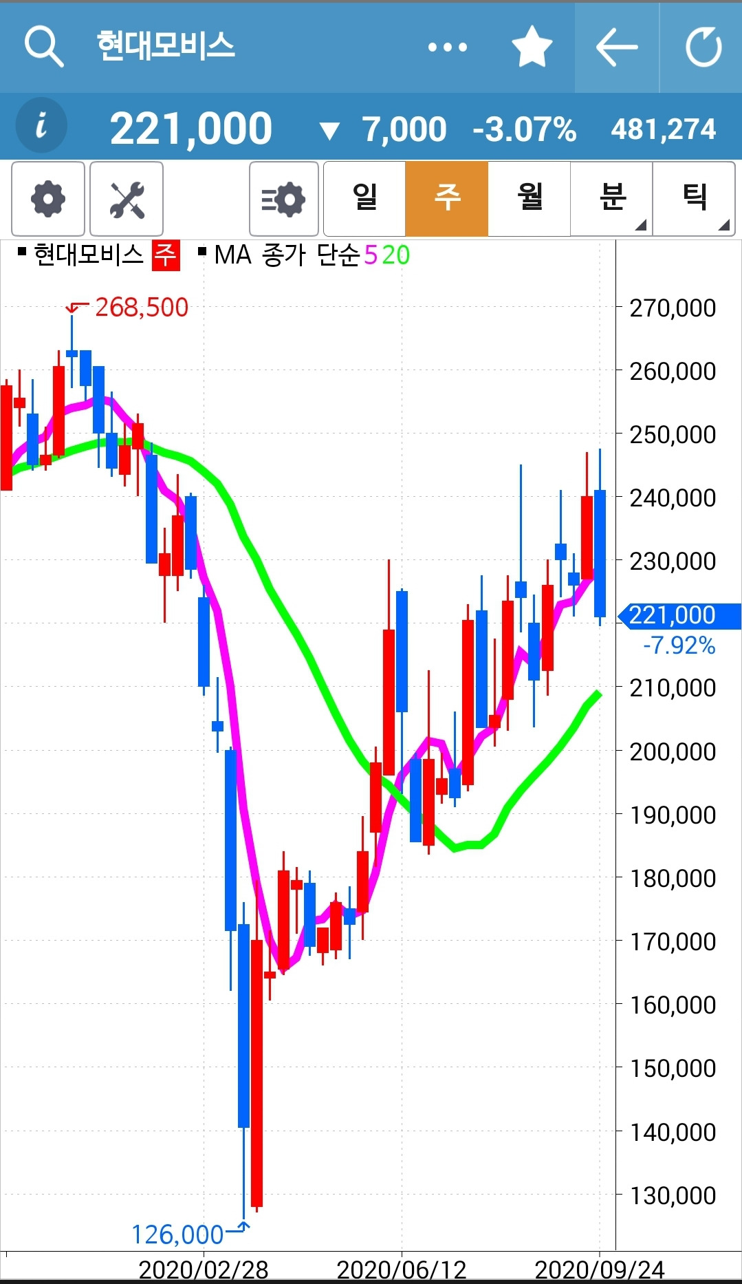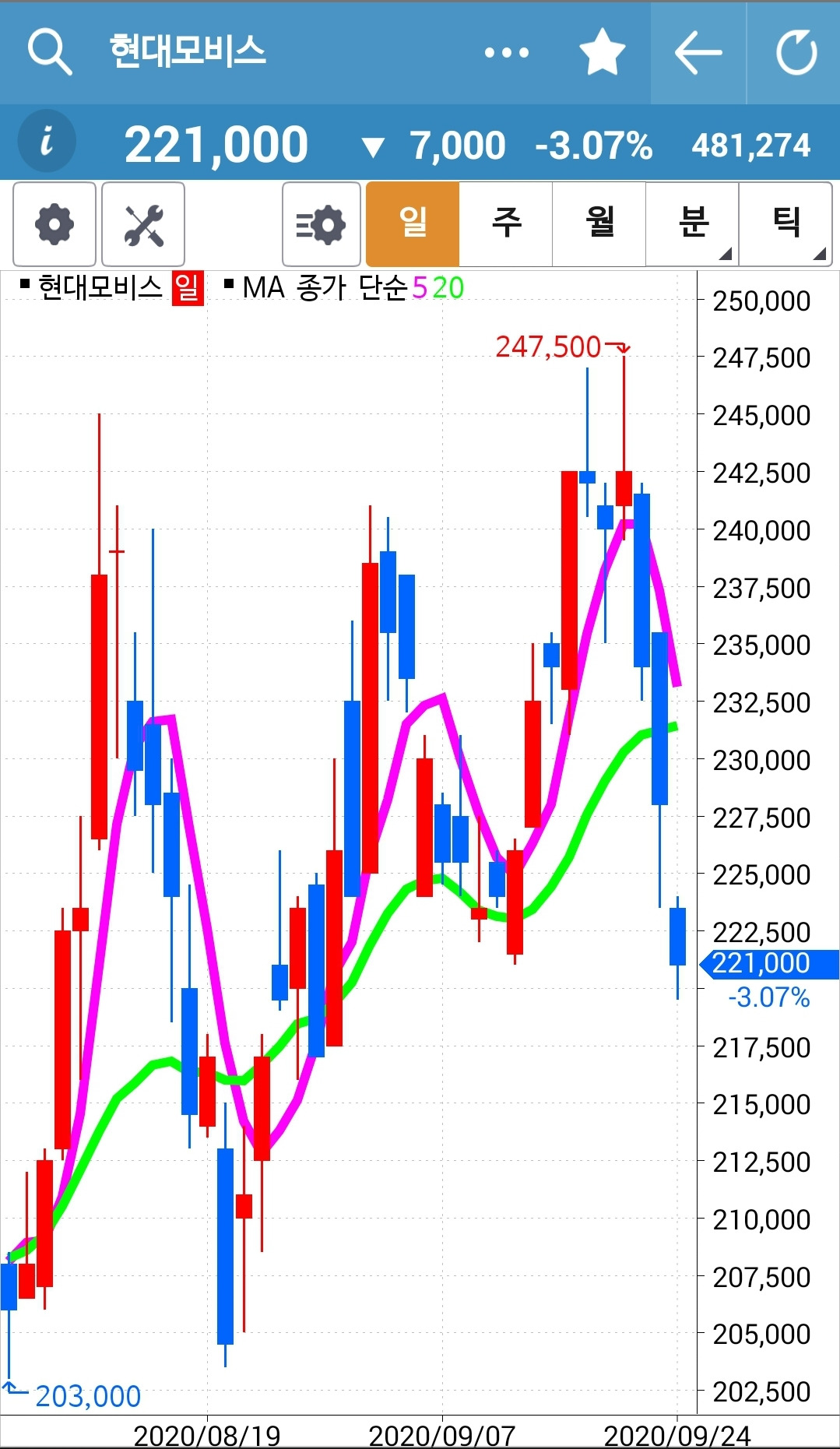 현대모비스. 캬~ 그 많은 수익을 다 되돌려주고 요 거이 웬 말이란 말인가. 그래도 어쩌랴. 아직 5일선이 위에 있는 걸. 난 아무것도 몰라요 5일선이 20일선 아래로 내려가야 매도할 뿐야요~ 그래. 오늘 다시 두 눈을 부릅뜨고 지켜보리라. 그러나 하루 종일이 아니야. 다만 3시 20분에 볼 거야. 최소한의 시간 투자. 룰루랄라 그 많은 하루를 난 내가 좋아하는 다른 걸 하리라. 오늘도 파이팅!