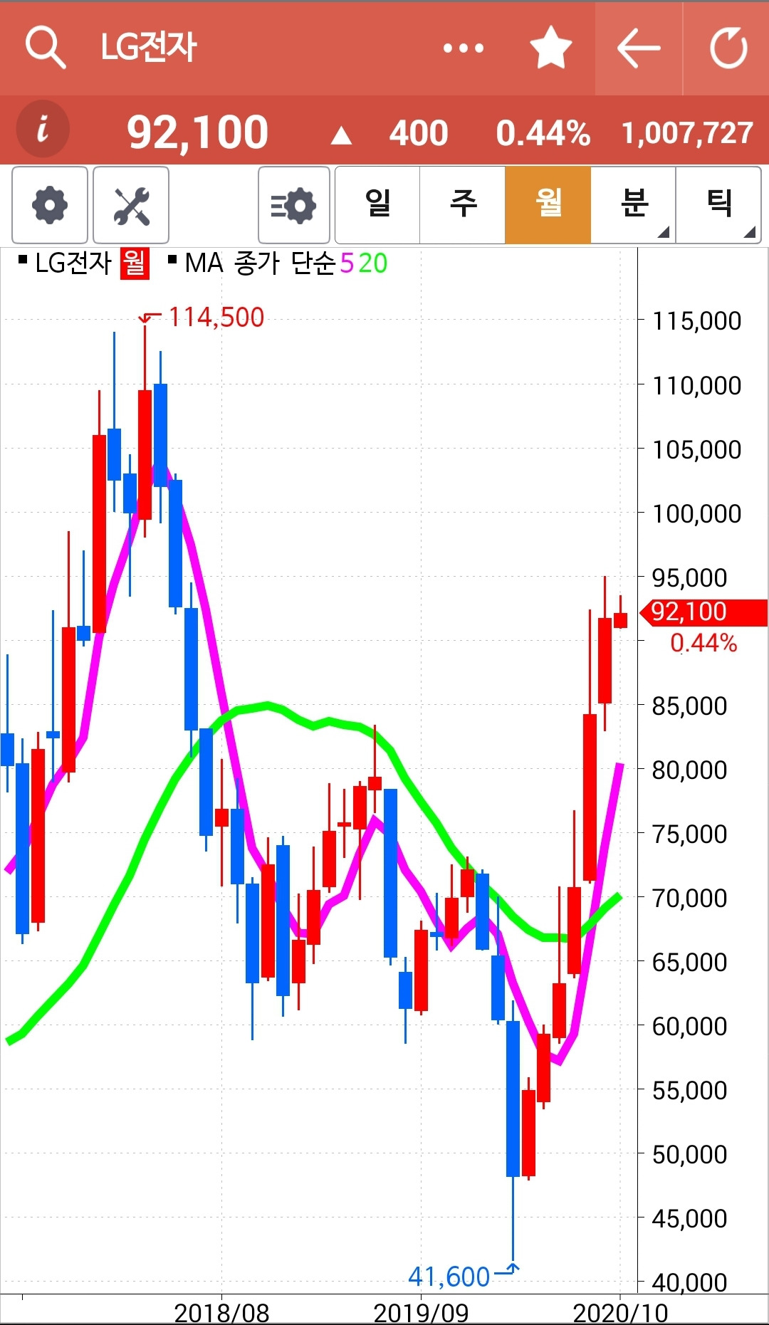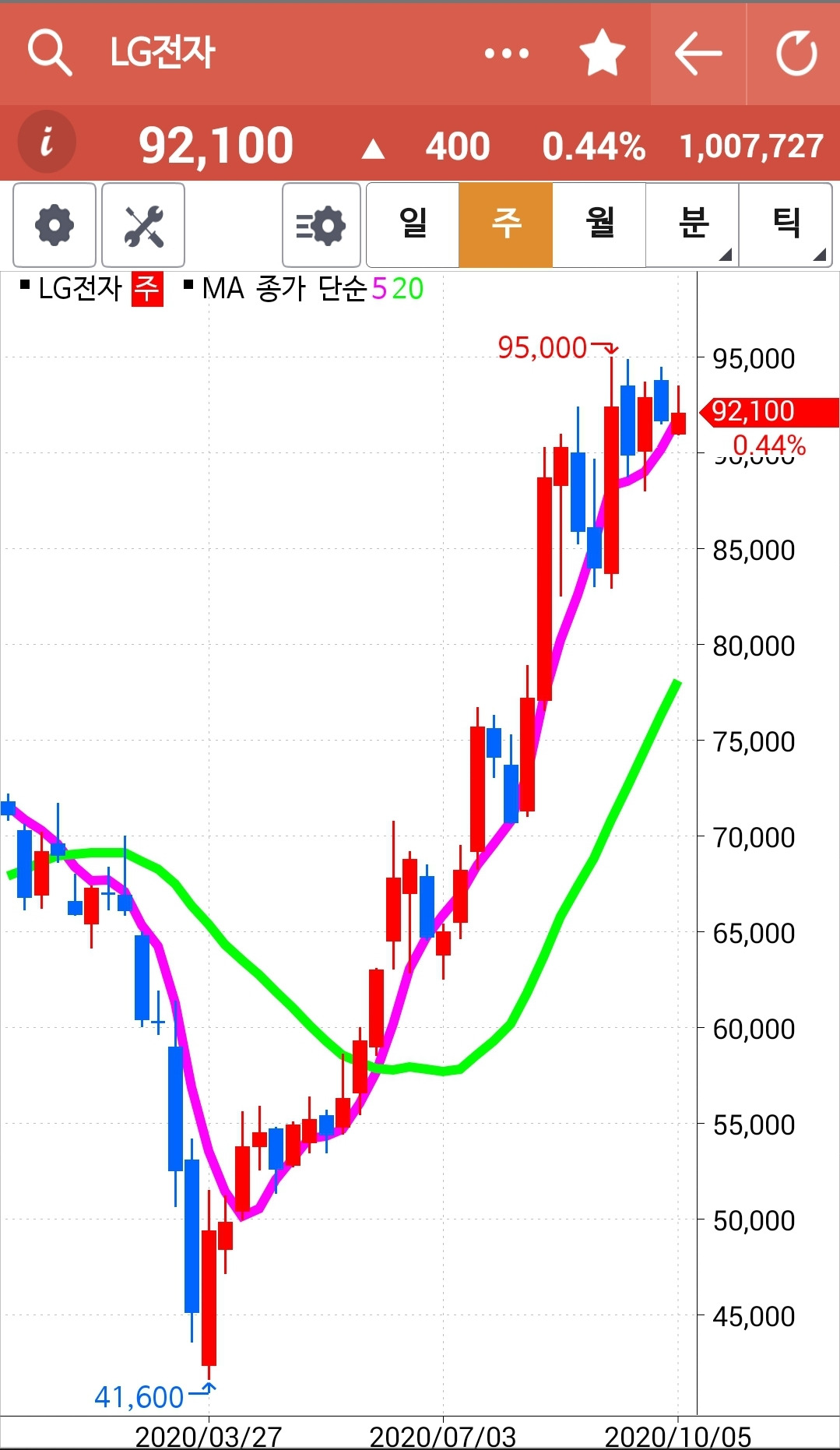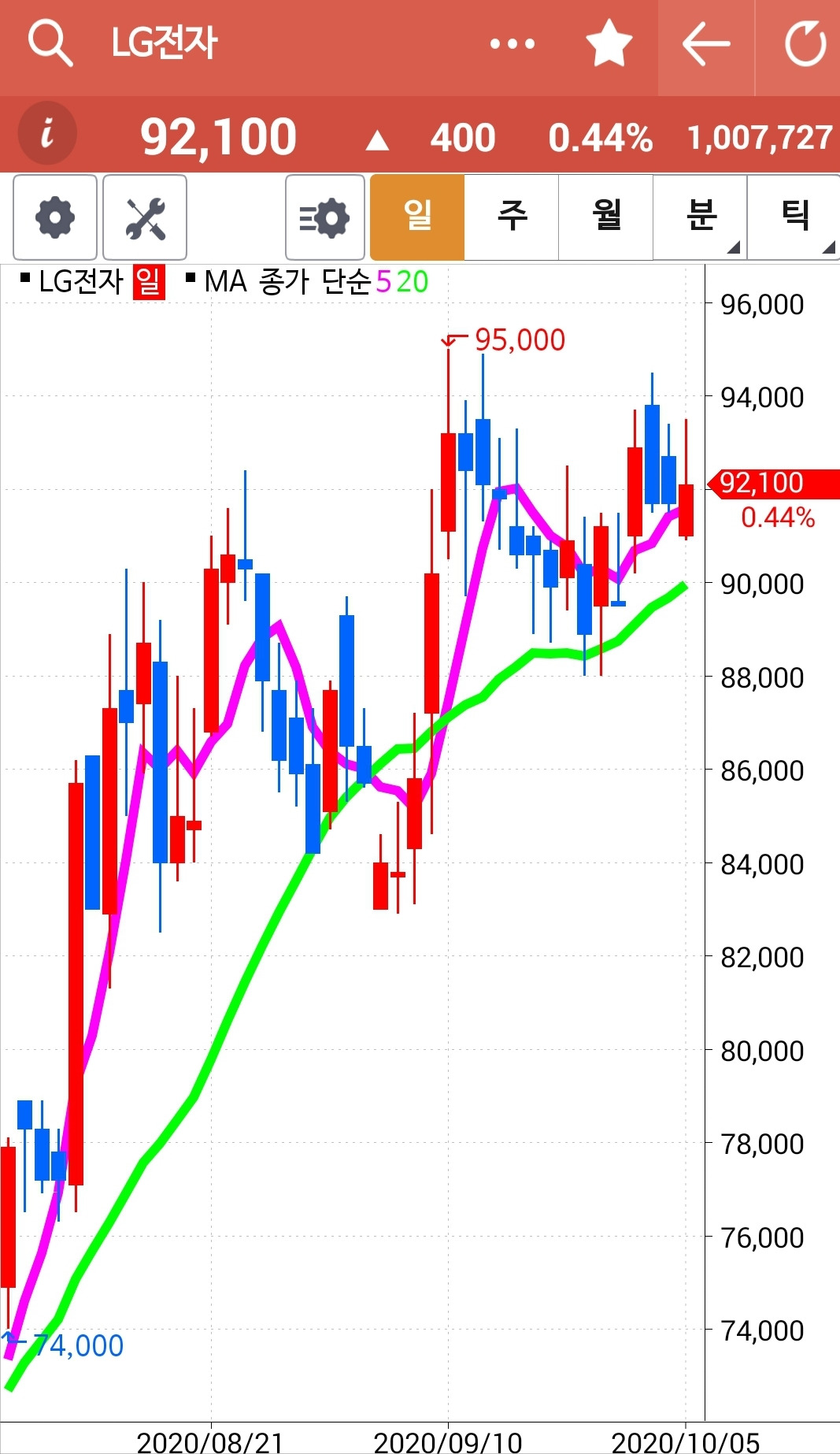LG전자. 코딱지만큼 올랐다. 수익 여부를 떠나 5일선이 20일선 위에 있으므로 내가 할 수 있는 일은 아무것도 없다. 난 아무것도 몰라요~ 5일선이 20일선 아래로 꽝! 내려가면 매도할 뿐야요~ 푸하하하