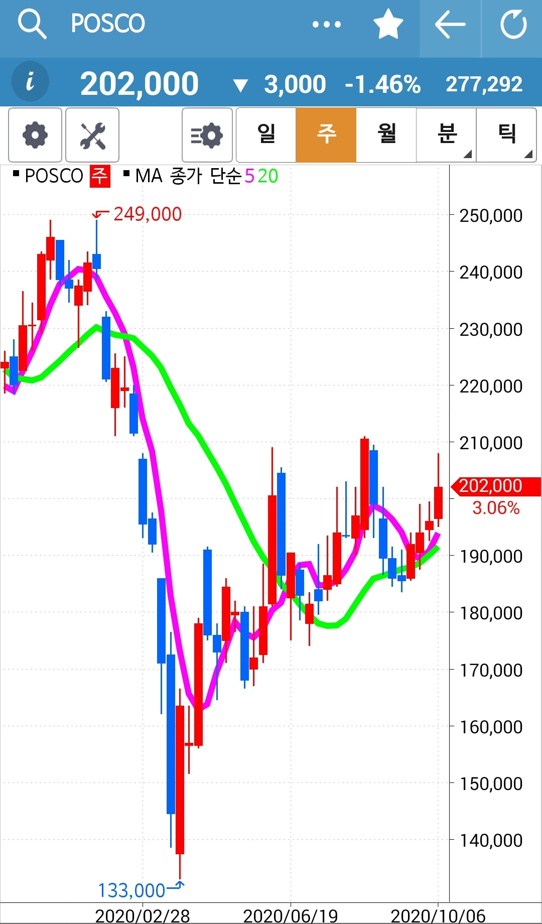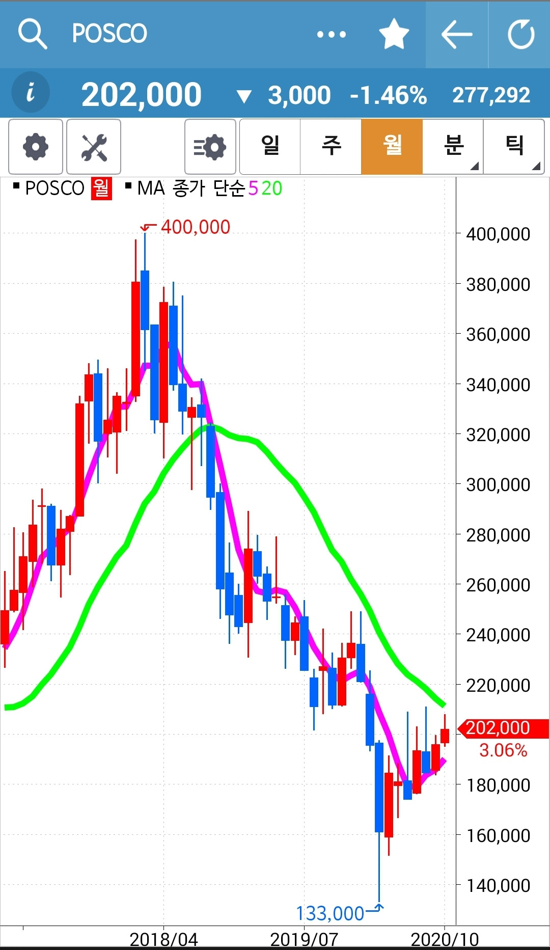 포스코. 하루 빵! 오르더니 당장 오늘 음봉. 에고. 그래도 일봉 주봉 올라가는 그림이니 노 프라블럼. 푸하하하