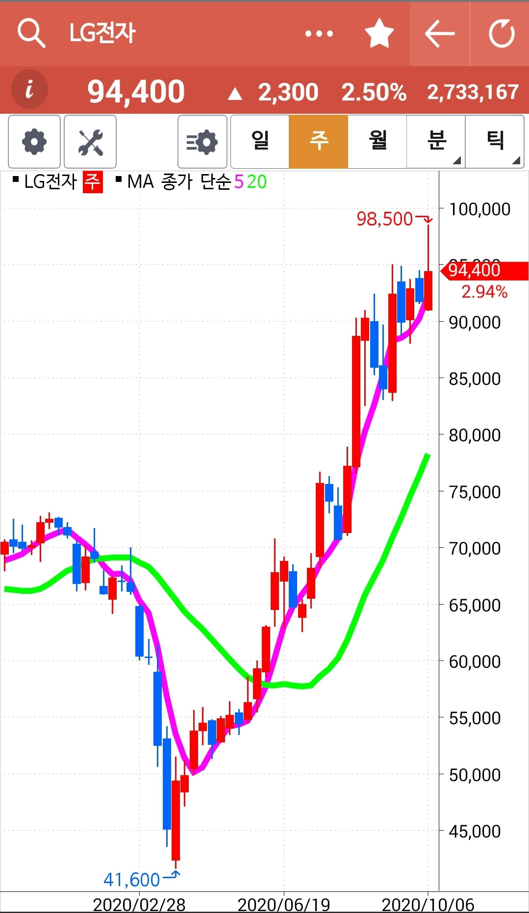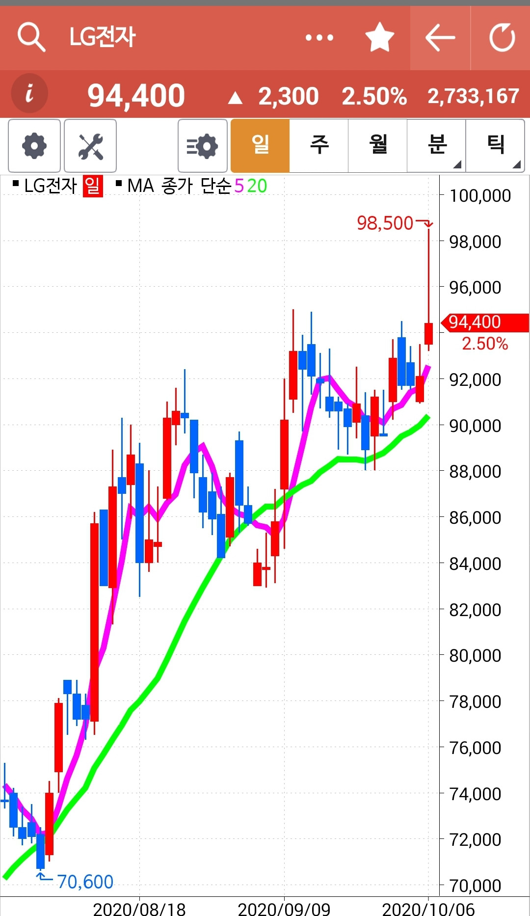 LG전자. 아침에 보았을 때 신나게 올라가며 기쁨을 주더니 폭 내려앉았다. 그래도 쭉쭉 올라가고 있으니 이 역시 노 프라블럼. 음하하하 파이팅!!!