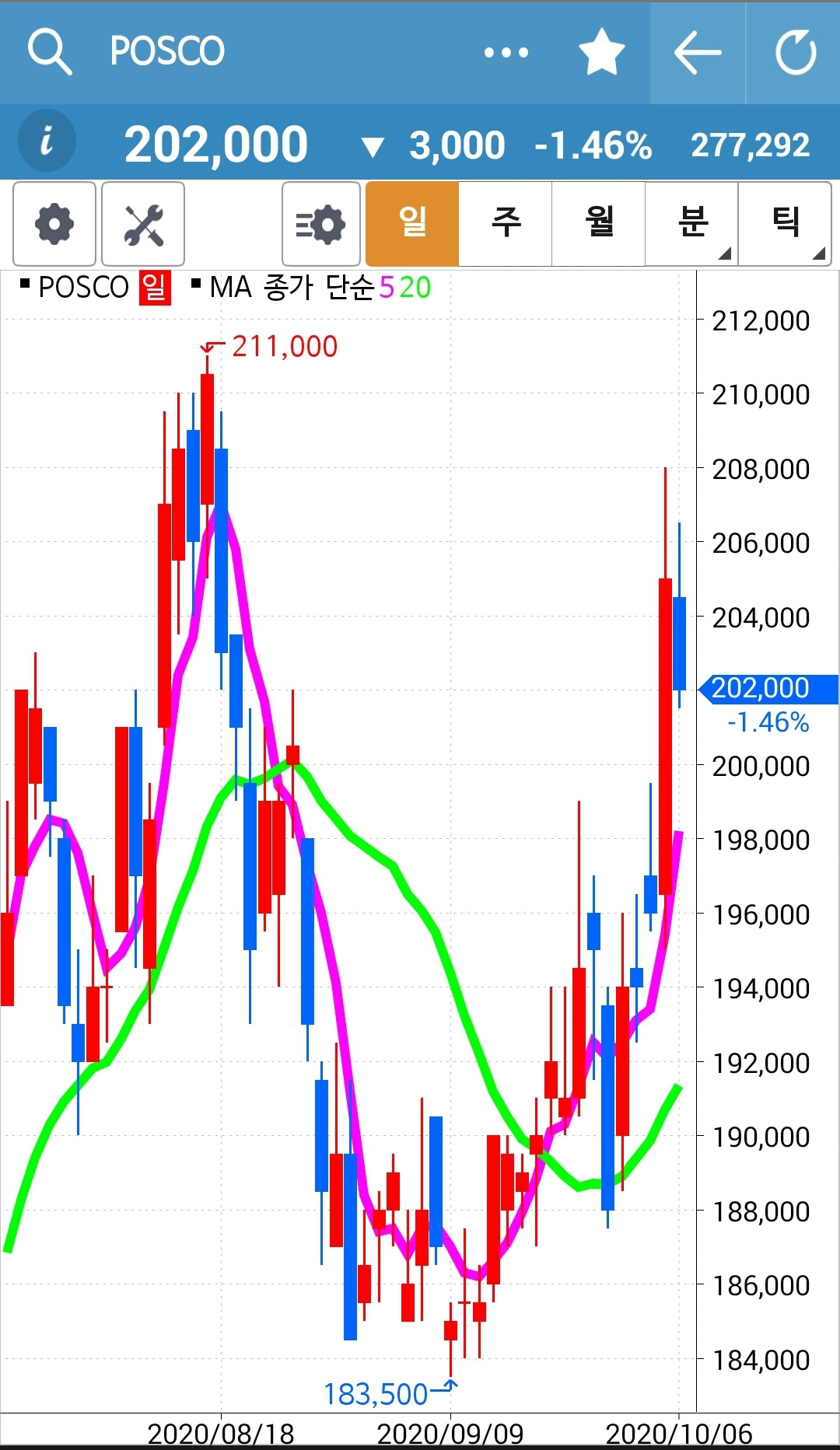 사진 1. 현물 주식. 포스코는 내렸고 LG전자는 빵! 터졌다. 둘 다 5일선이 20일선 위에 있으므로 내가 할 일이란 없다.