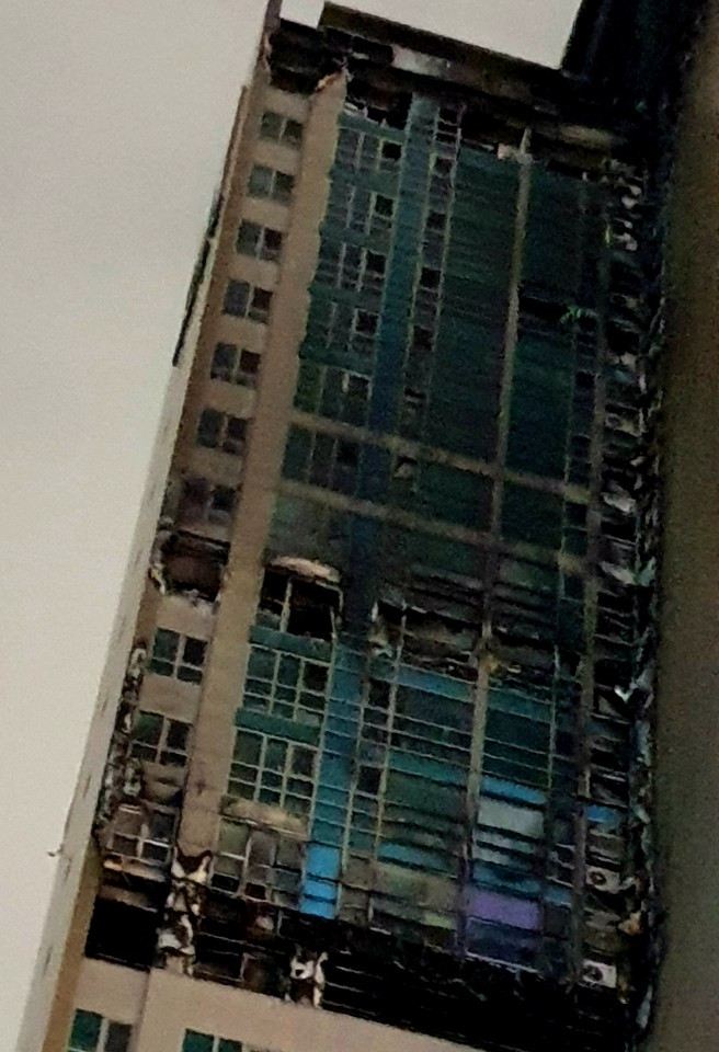 저녁때 우린 현장엘 가보기로 한다. 매일 하는 산책을 수변공원이 아닌 화재현장으로 잡은 것이다. 걷기는 마찬가지니까. 다만 공기는 좀 안 좋겠지만 그래도 이런 현장을 그냥 넘길 순 없지. 산책하듯 걸어서 도착하니 와우 매캐한 냄새. 여전히 타는 냄새가 나고 있다. 그리고 각 방송국 차량이 있고 밝은 조명 아래 어젯밤 TV에서 본 기자가 멘트를 연습하고 있다. 아마도 저녁 9시 뉴스를 위함인가 보다. 소방차도 바쁘게 왔다 갔다 한다. 바닥에 그날의 위험을 알려주듯 깨진 유리며 불에 탄 패널들이 널브러져 있고 TV수사극에서 보던 폴리스라인인가 그런 노란 줄이 뺑 둘러 쳐져있다. 위로 올려다본다. 아, 너무 끔찍하다. 어쩌나. 저 살림을 다 어쩌나. 에고.