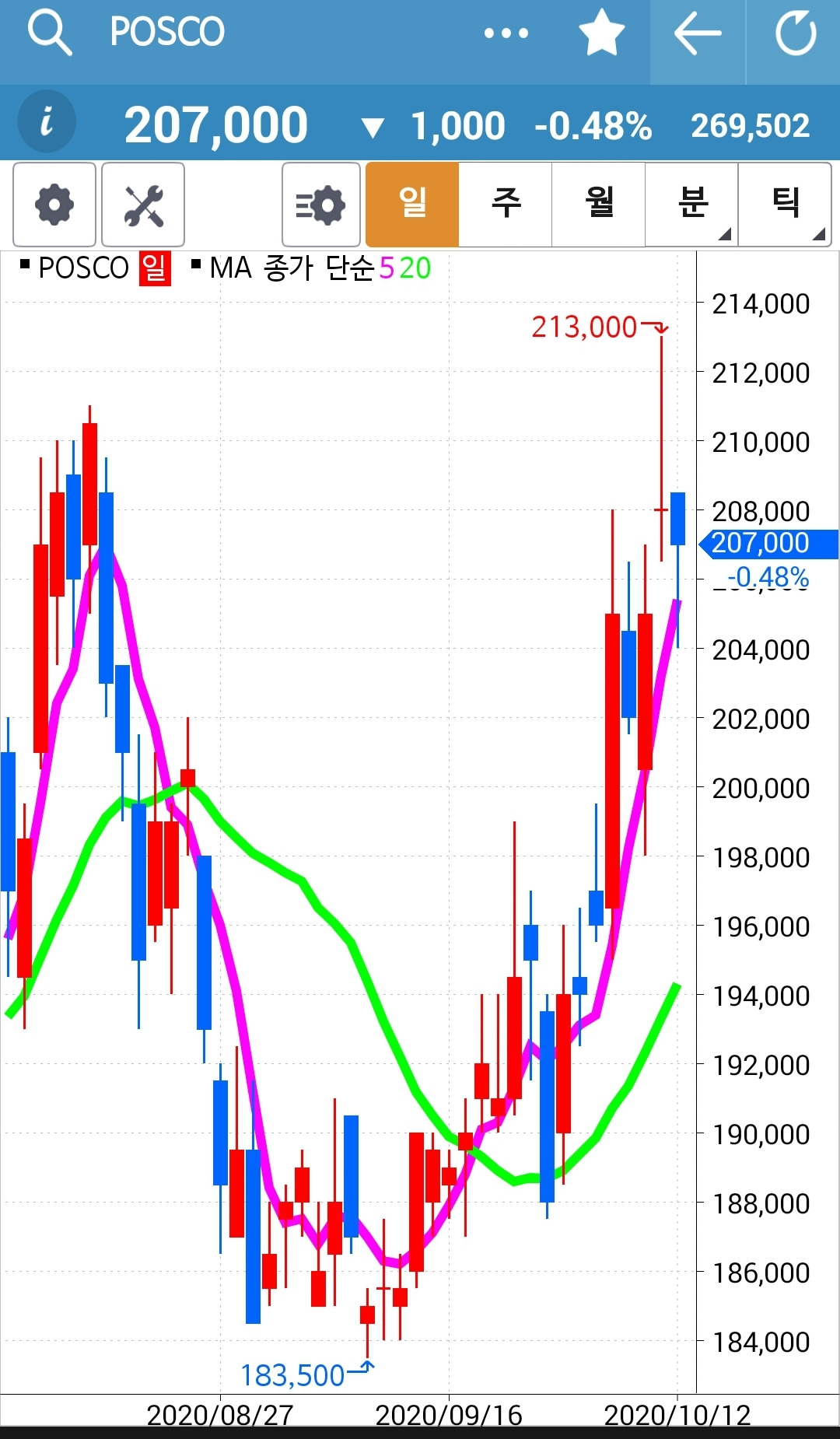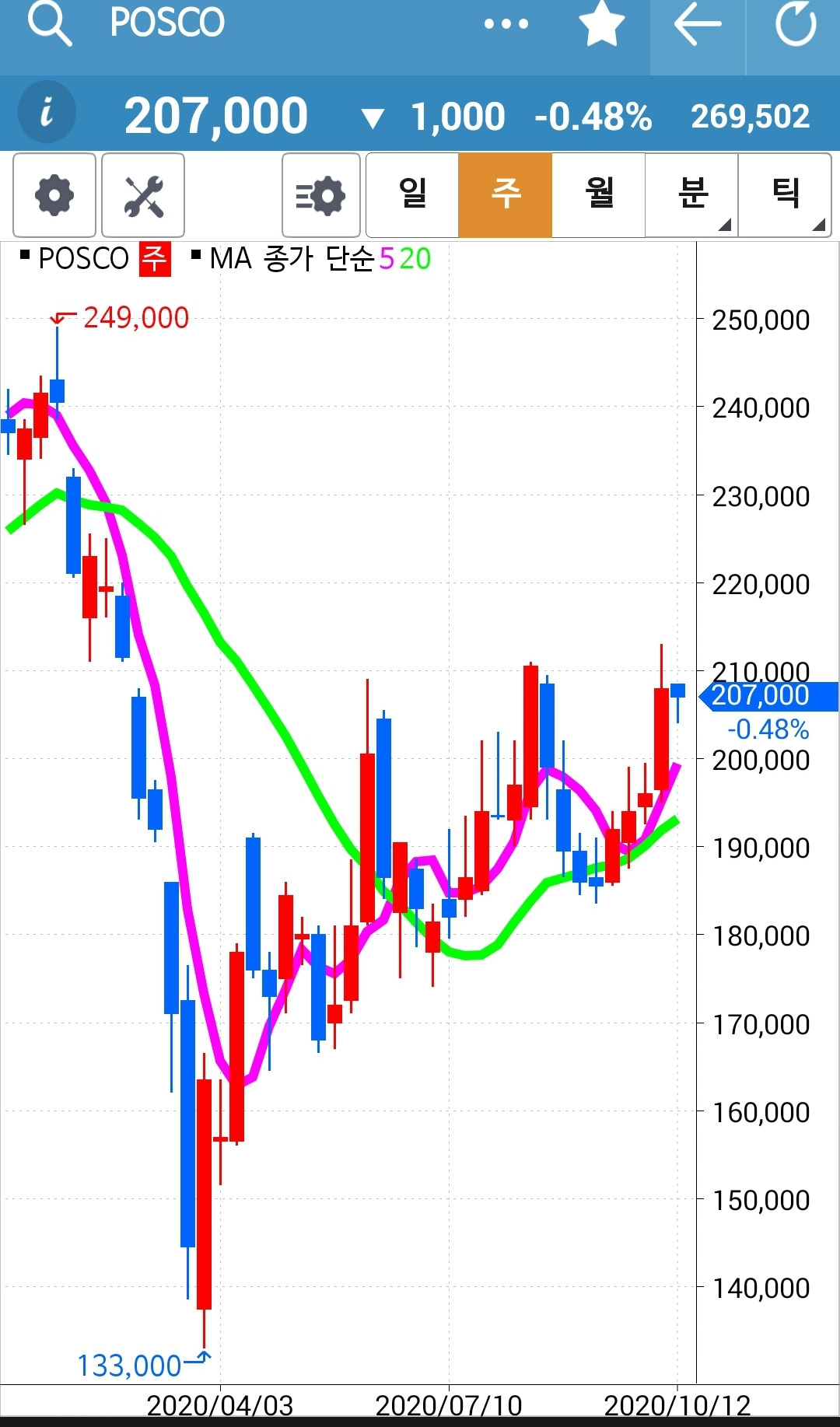 POSCO. 역시 전고점을 뚫고 크게 올랐다 아래로 쭈욱 밀리니 그 여파로 오늘도 맥을 못 춘다. 그래도 5일선이 20일선 위에 있으니까 노 프라블럼! 내가 할 일은 없어.