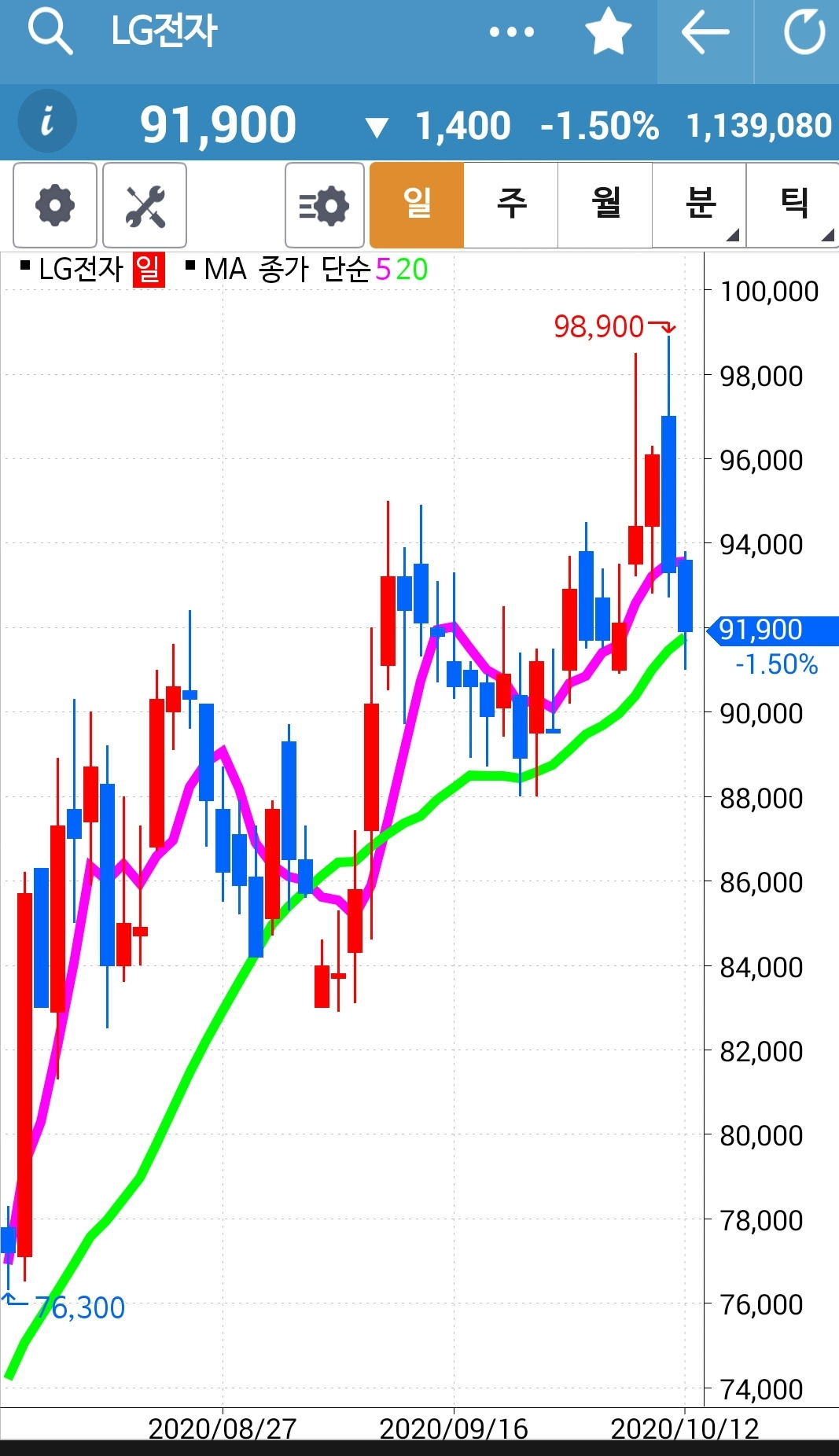 사진 2. 선물주식. 나의 사랑 LG전자. 보는 대로 또 꽉꽉 채워 샀다. 92,900원이 평균 가인데 종가는 91,900원이니 나의 매매도 참 한심하기 그지없다. 그러나 난 올라가기에 산 거다. 나중에 이렇게 빠질 줄이야. 에고. 아무리 그렇다 해도 난 아무것도 몰라요 5일선이 20일선 위에 있으면 매수할 뿐야요~ 그래. 그거면 됐다. 파이팅!