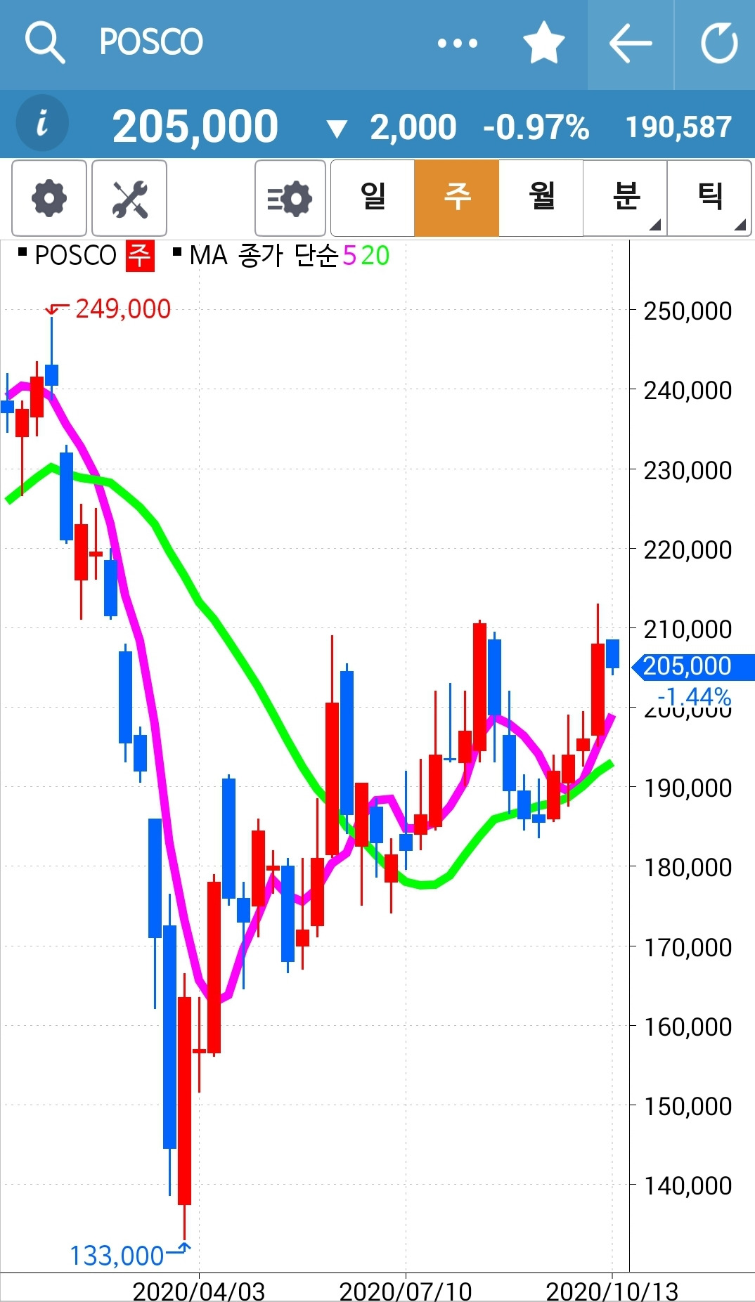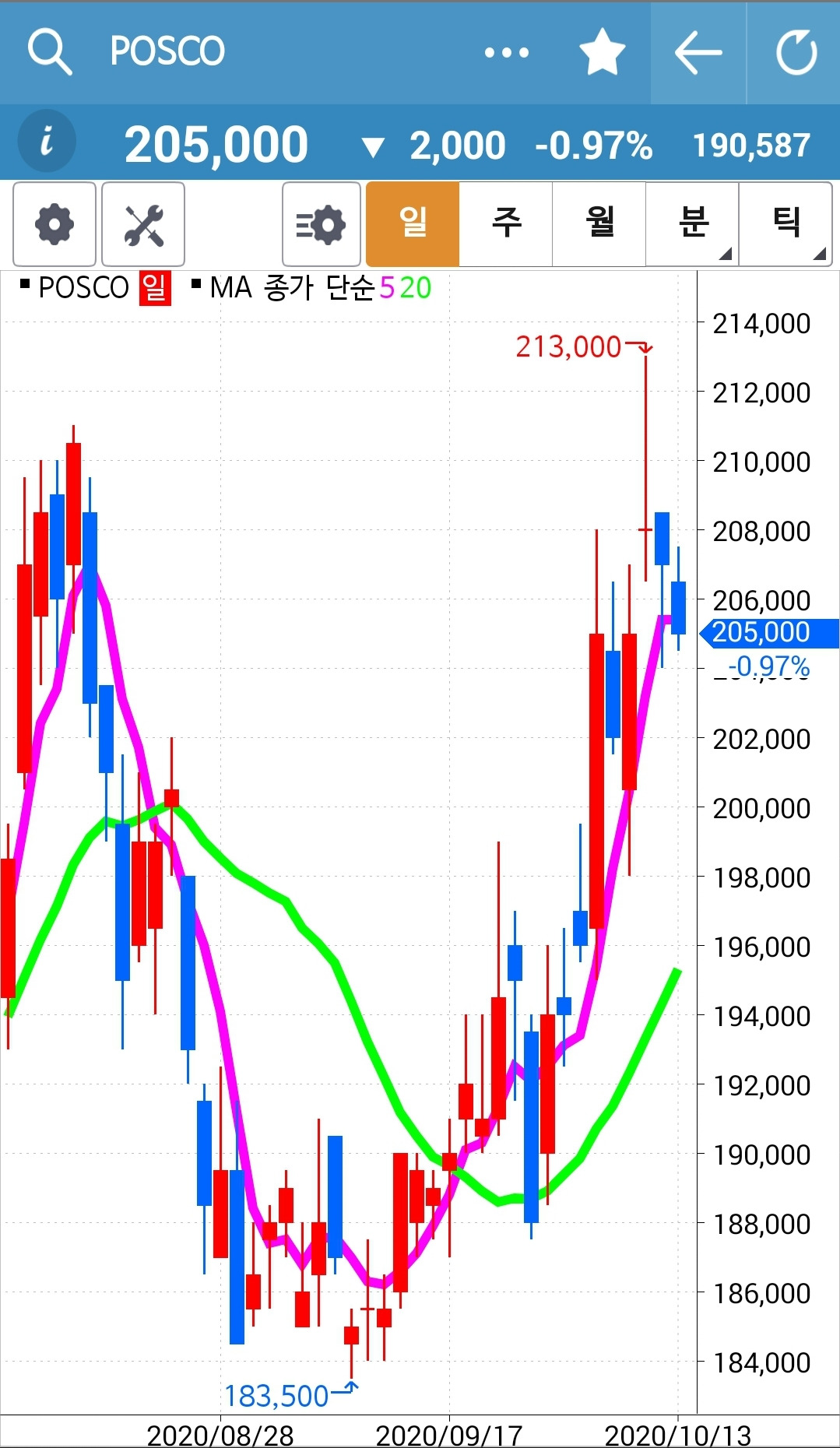 포스코 역시 신나게 올라가다 두 개째 음봉 기록 중이다. 5일선이 위에 있으니 내가 할 일은 없다. 그저 파이팅! 을 외칠뿐.