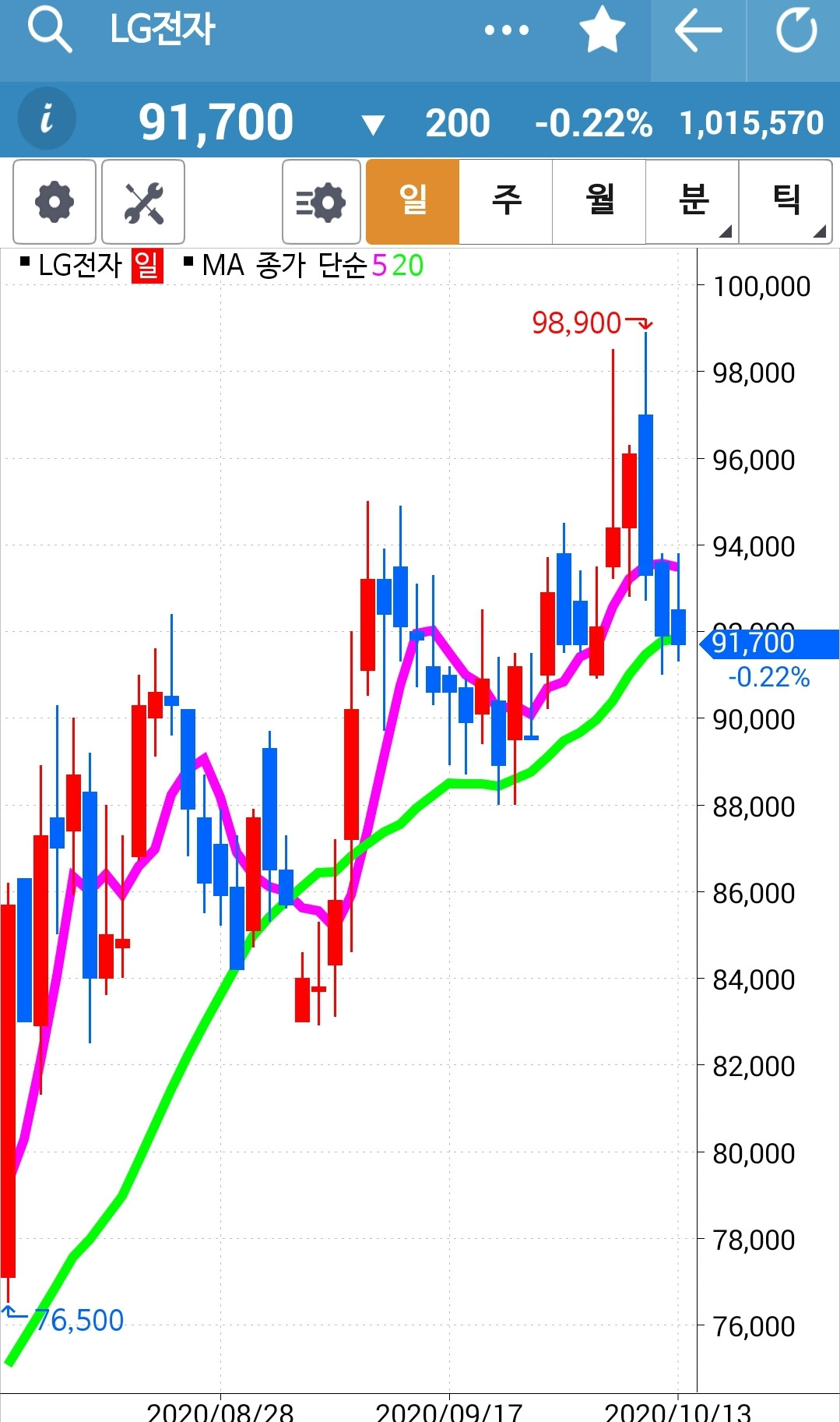 엘지전자. 두 개의 음봉은 부족했을까. 20일선에 부딪혔으니 반등이 있지 않을까 했지만 그러지 않았다. 음봉 기록이다. 세 개의 음봉. 그리고 20일선에 걸린 주가. 내일은 어떻게 될까.